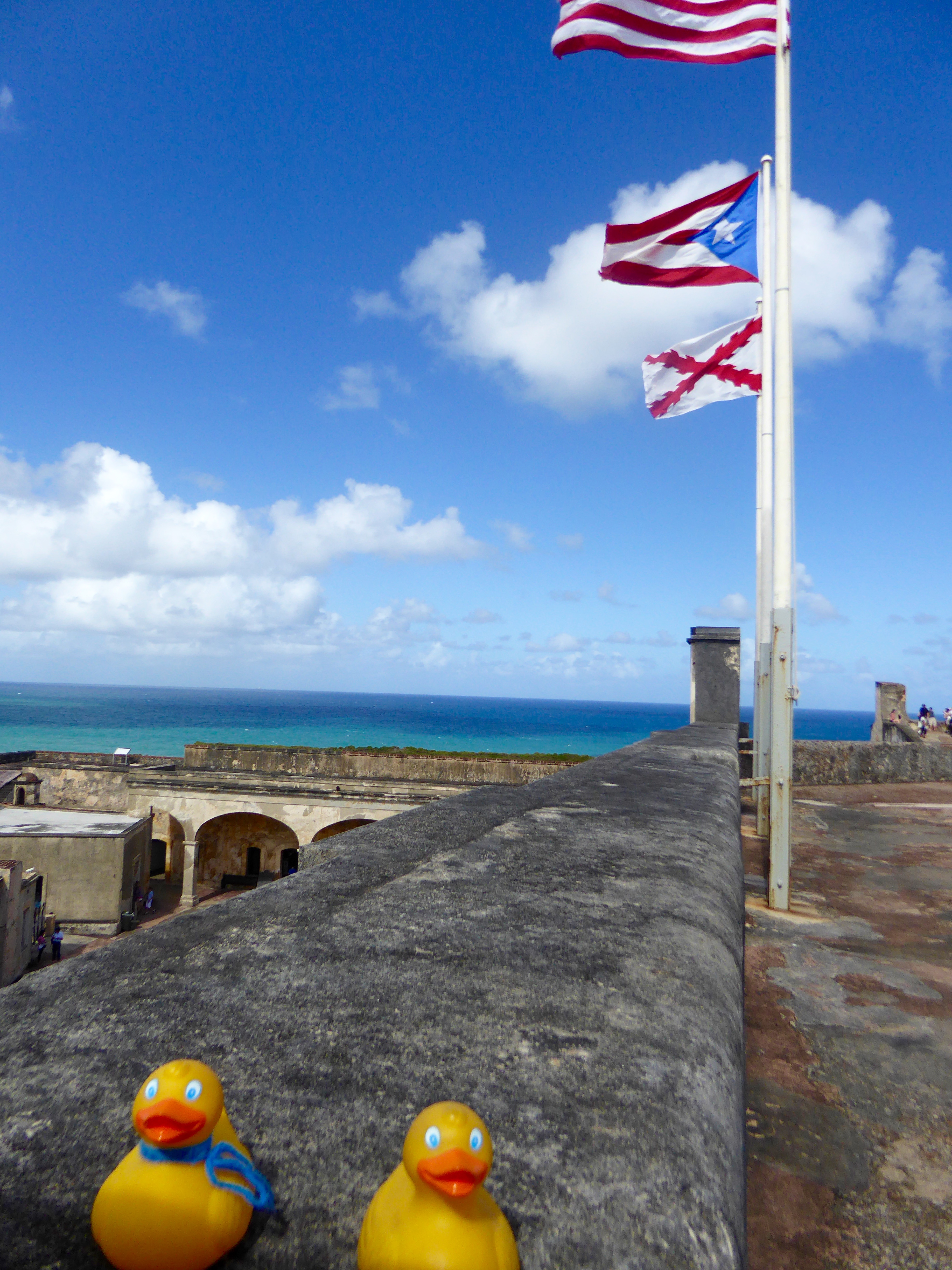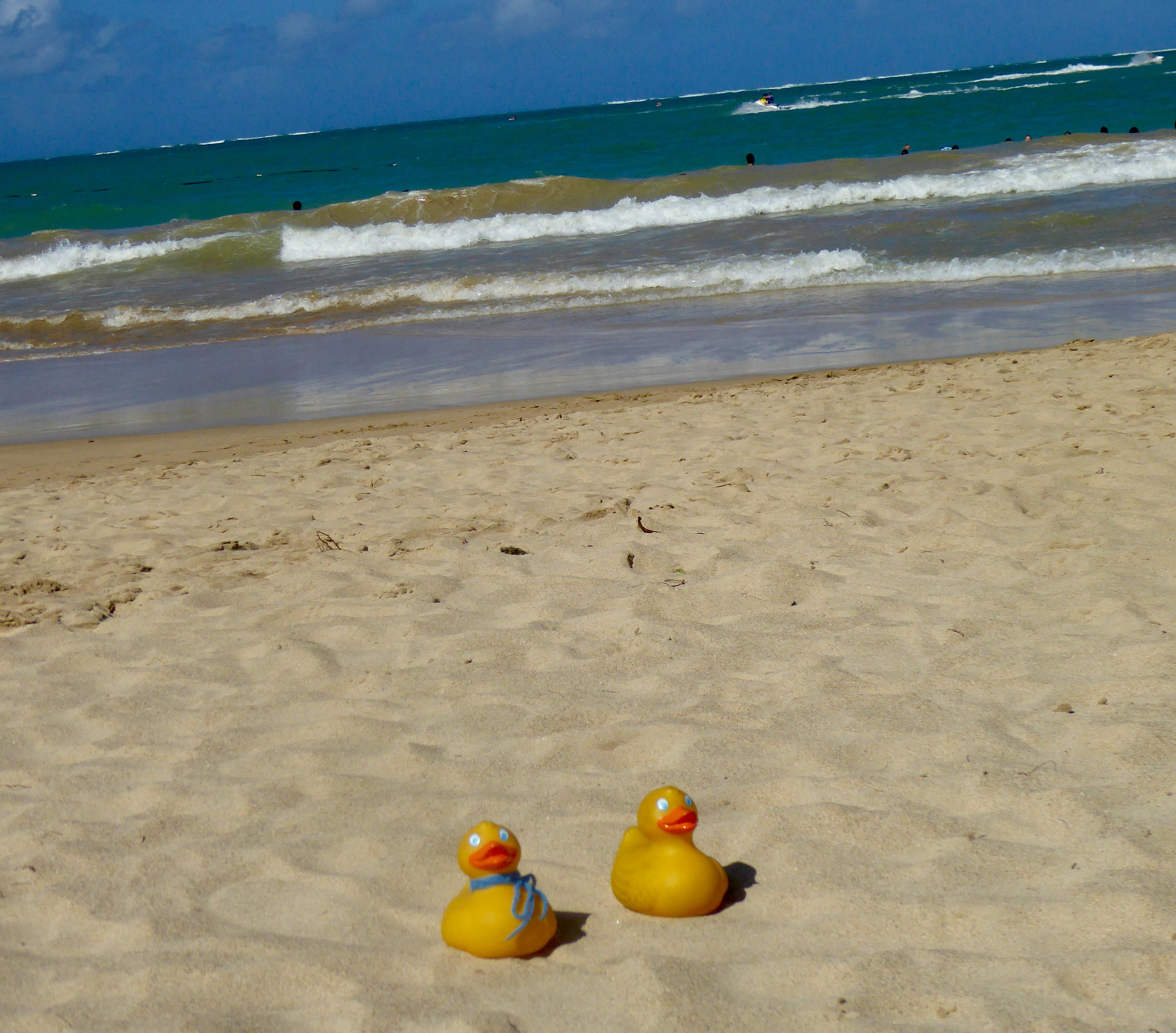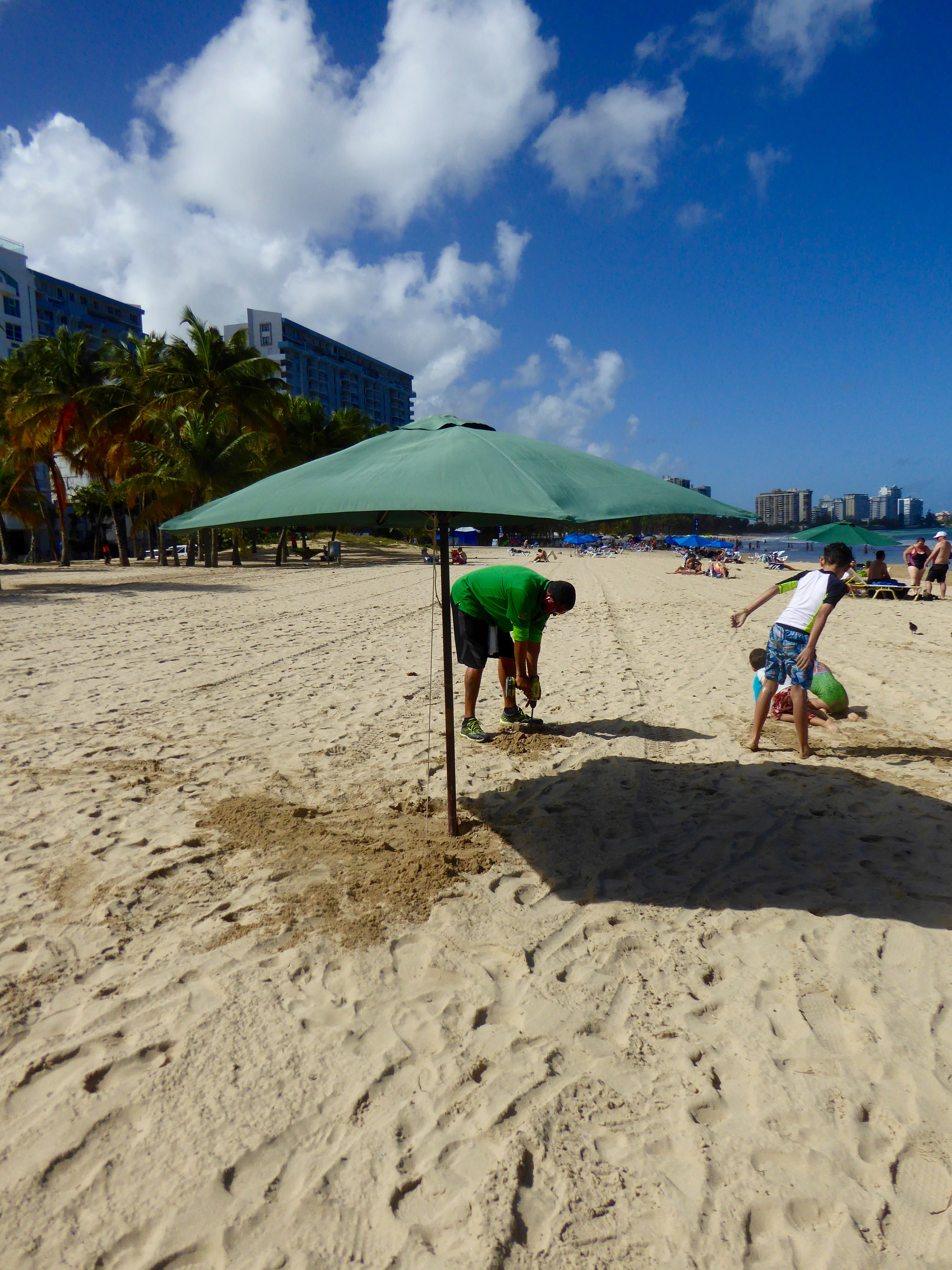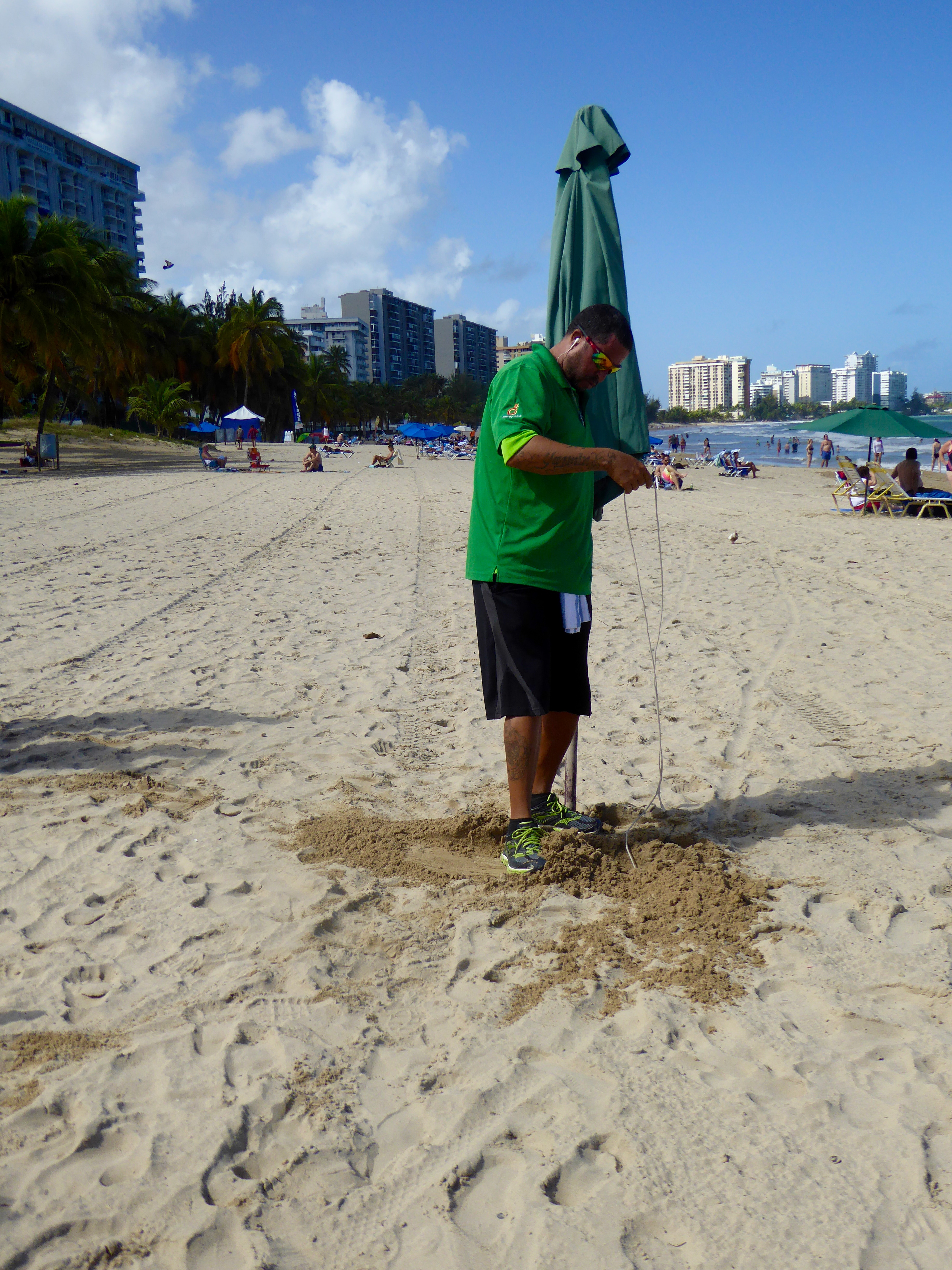 We are going to the beach! We ducks love all the activities and exploring in old towns, but the beach is our favorite. Isla Verde Beach is our place today. First we rent beach lounge chairs and umbrellas. We have never seen this. We pick our spot on the beach and the gentleman uses a drill with a wide, long attachment to dig a hole to secure our umbrella in the sand.