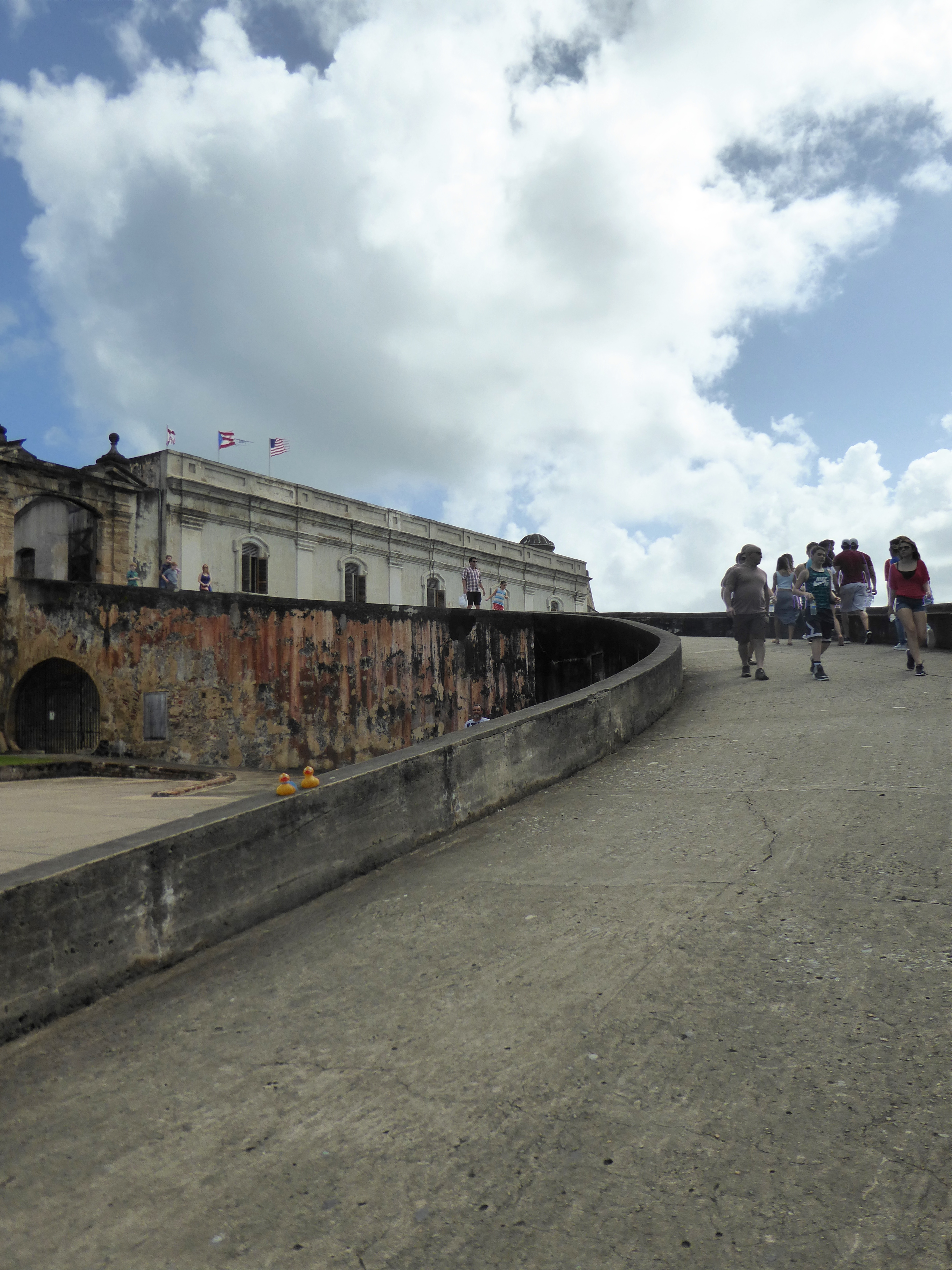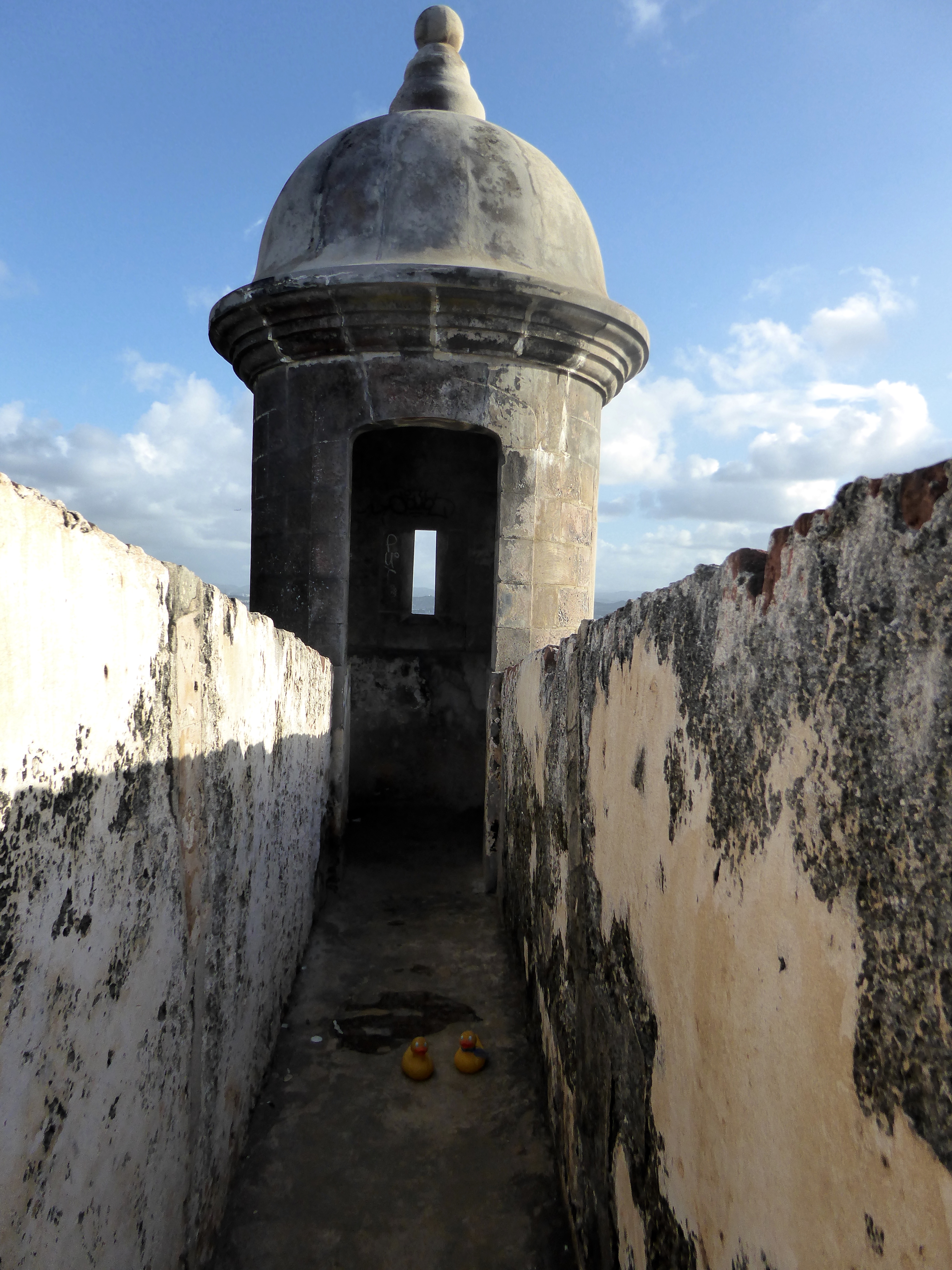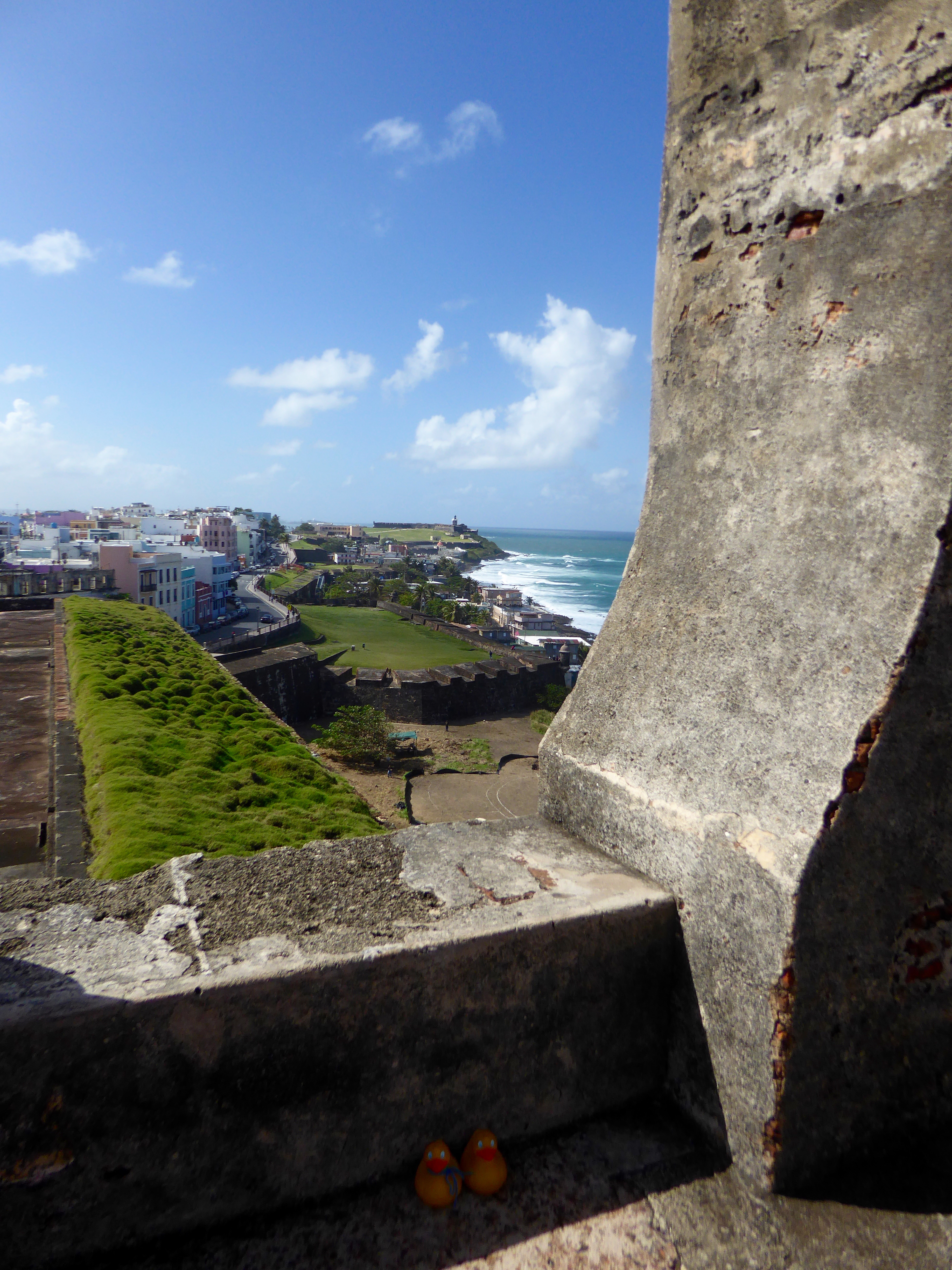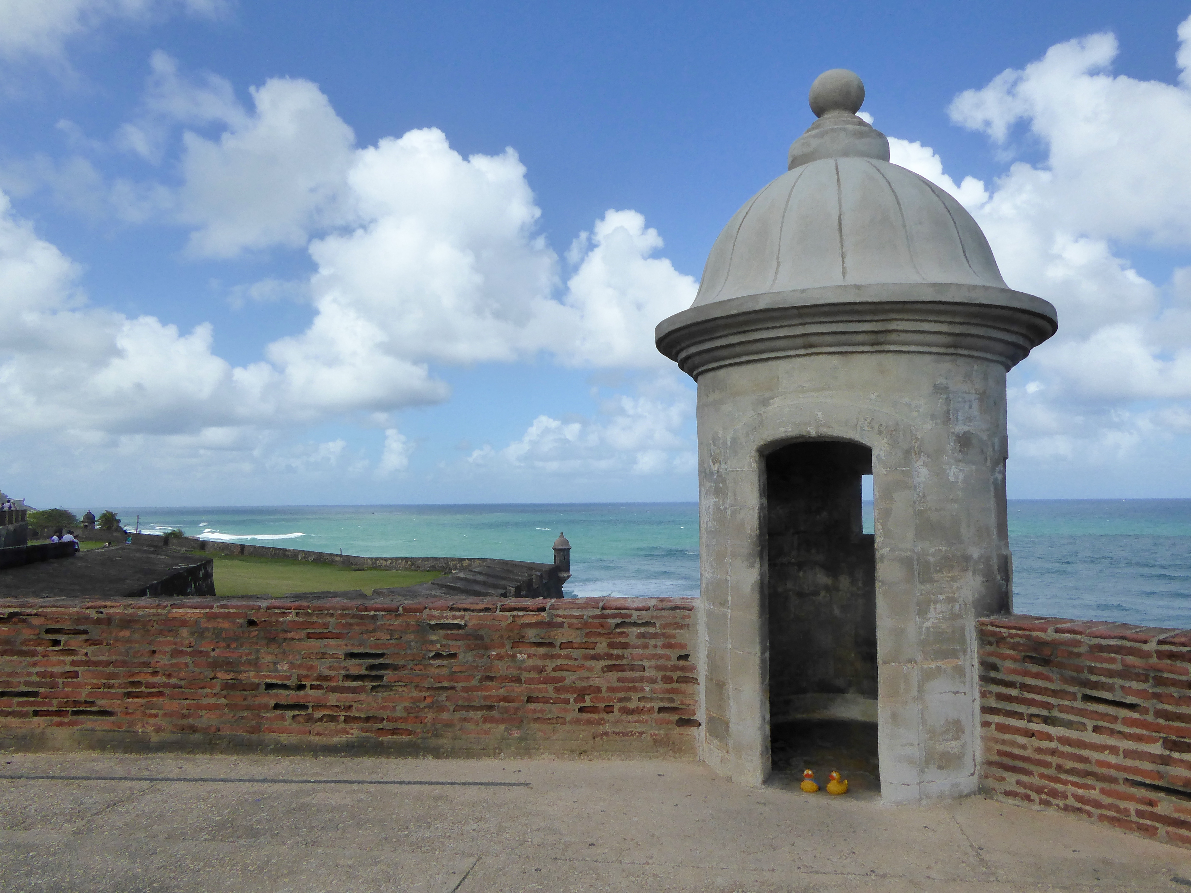 We are going to the beach! We ducks love all the activities and exploring in old towns, but the beach is our favorite. Isla Verde Beach is our place today. First we rent beach lounge chairs and umbrellas. We have never seen this. We pick our spot on the beach and the gentleman uses a drill with a wide, long attachment to dig a hole to secure our umbrella in the sand.