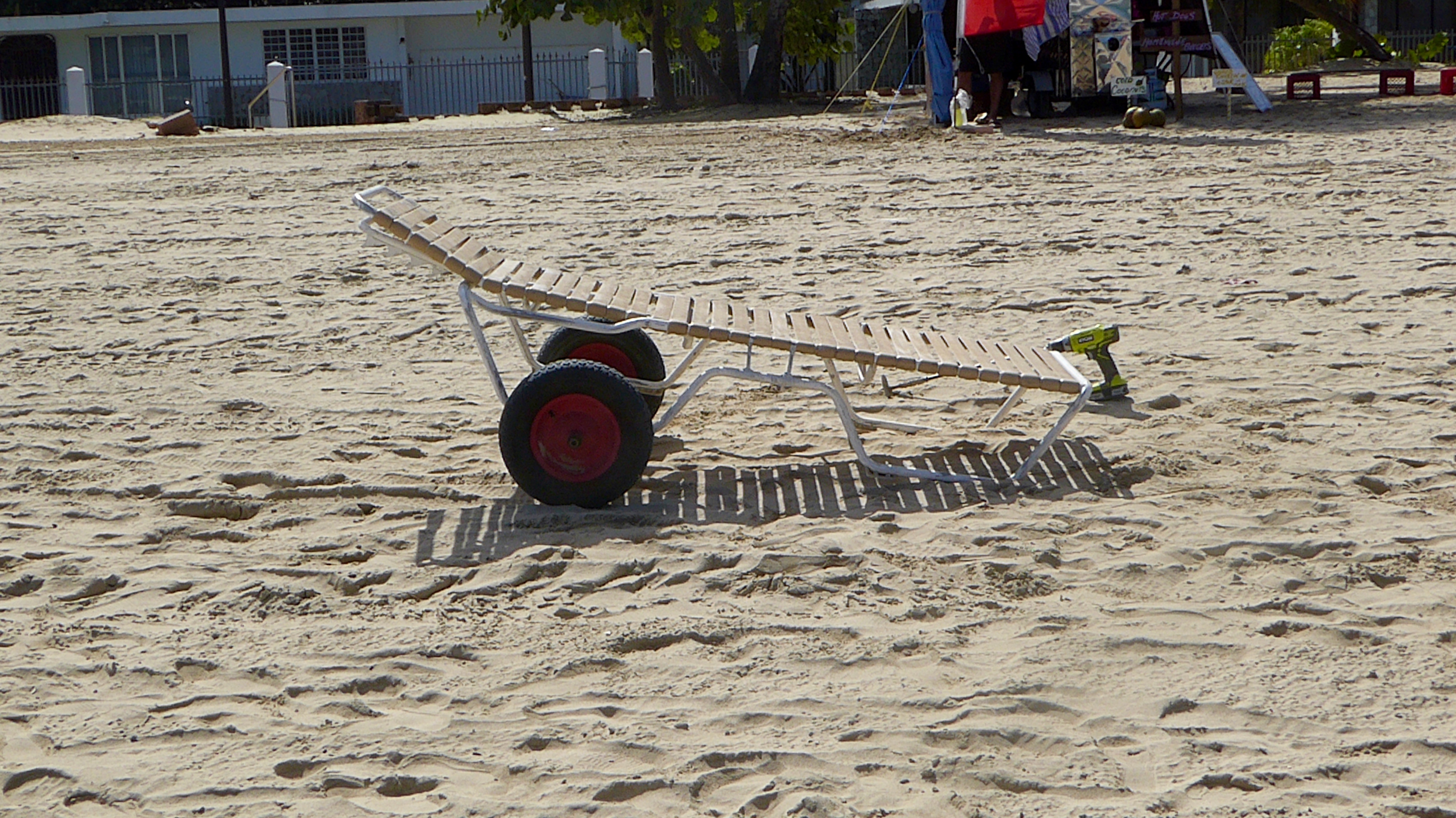 Since we needed two umbrellas and four chairs, how did he carry them to our favorite spot? On this lounge chair, adapted with large sand wheels.