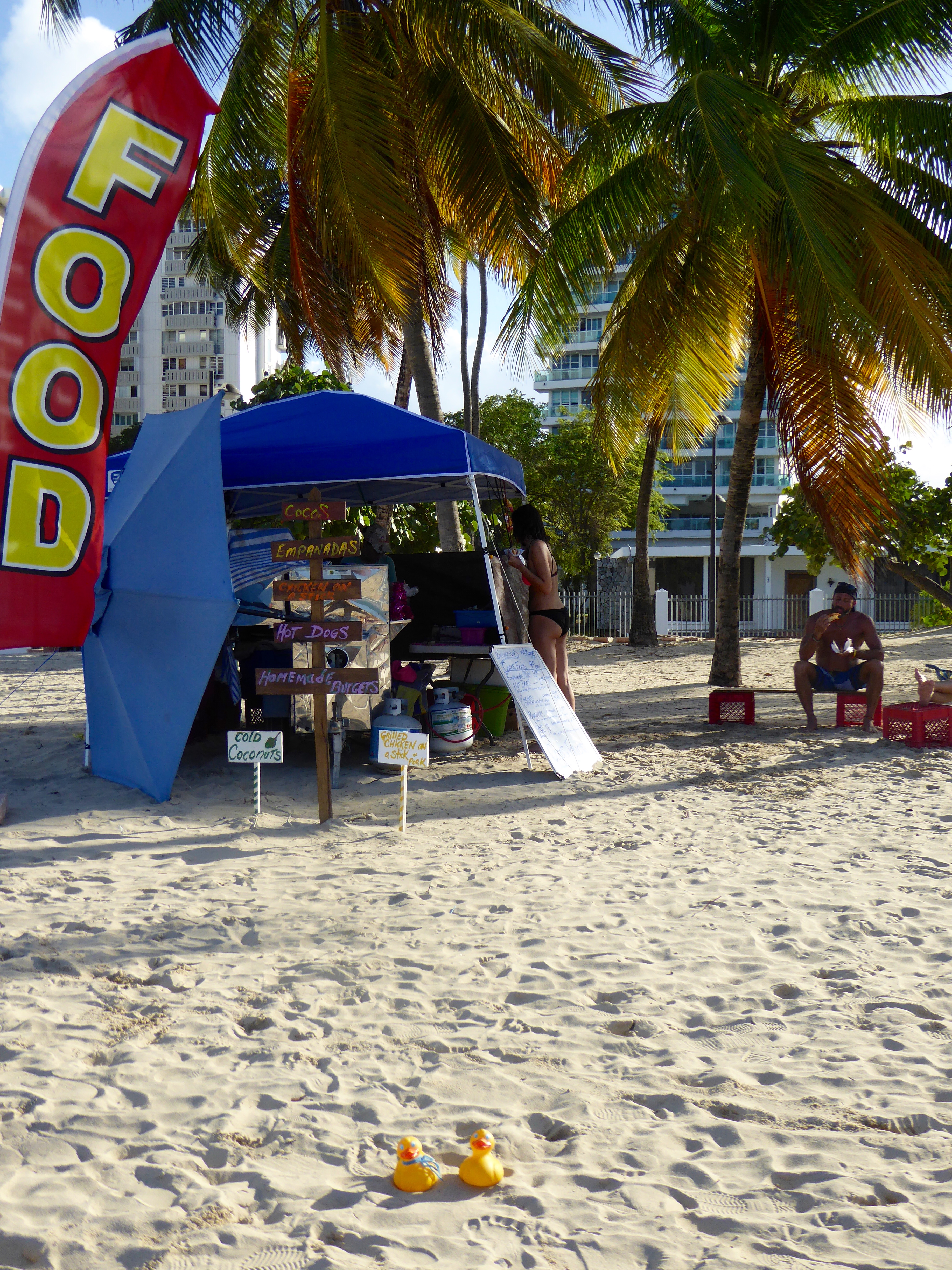 Warm sun and beach activities do make humans and duck hungry and thirsty. Not to worry. A food stand is right behind us on the beach.
