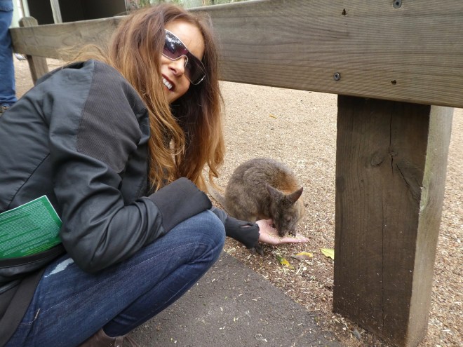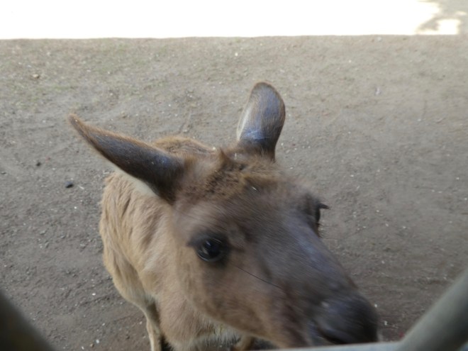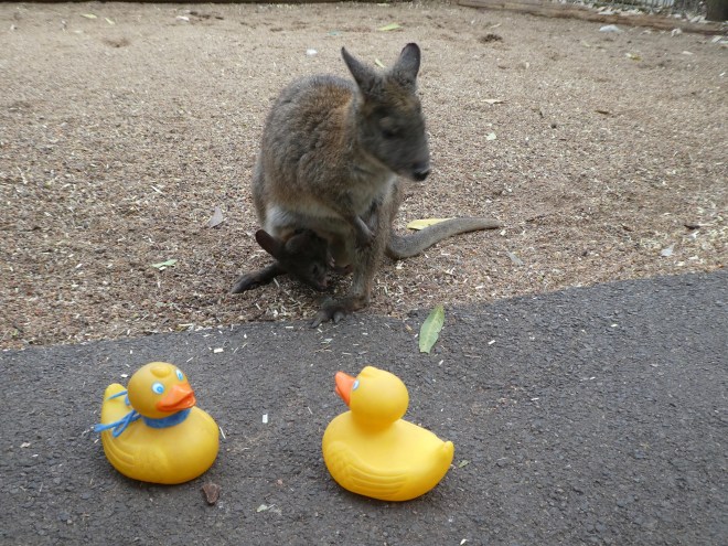Soapy’s mom is feeding them.   There are several places in the park to purchase approved food for the animals.   We purchased food several times.   This Red Necked Pademelon came to see the Colorado Traveling Ducks.