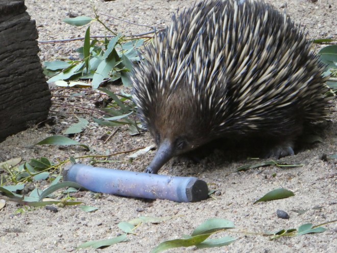 The sign told some differences between domestic dogs and dingos.  Dingos do not bark.   That would be nice sometimes.   And the Dingo only breeds once a year.   The short beaked echidna eats termites and other ant species.   A sign told us the female incubates one egg in her pouch.