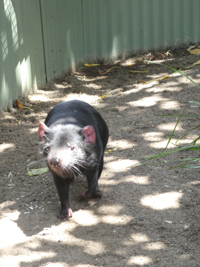 The Tasmanian Devil.   He came to meet us.   Four years ago in Tasmania, we saw some Tasmanian Devils and were told they have a disease that could threaten their existence.   These all looked healthy and we were happy to see that.  The Tasmanian Devils were being fed and this guy showed his sharp teeth between taking bites.