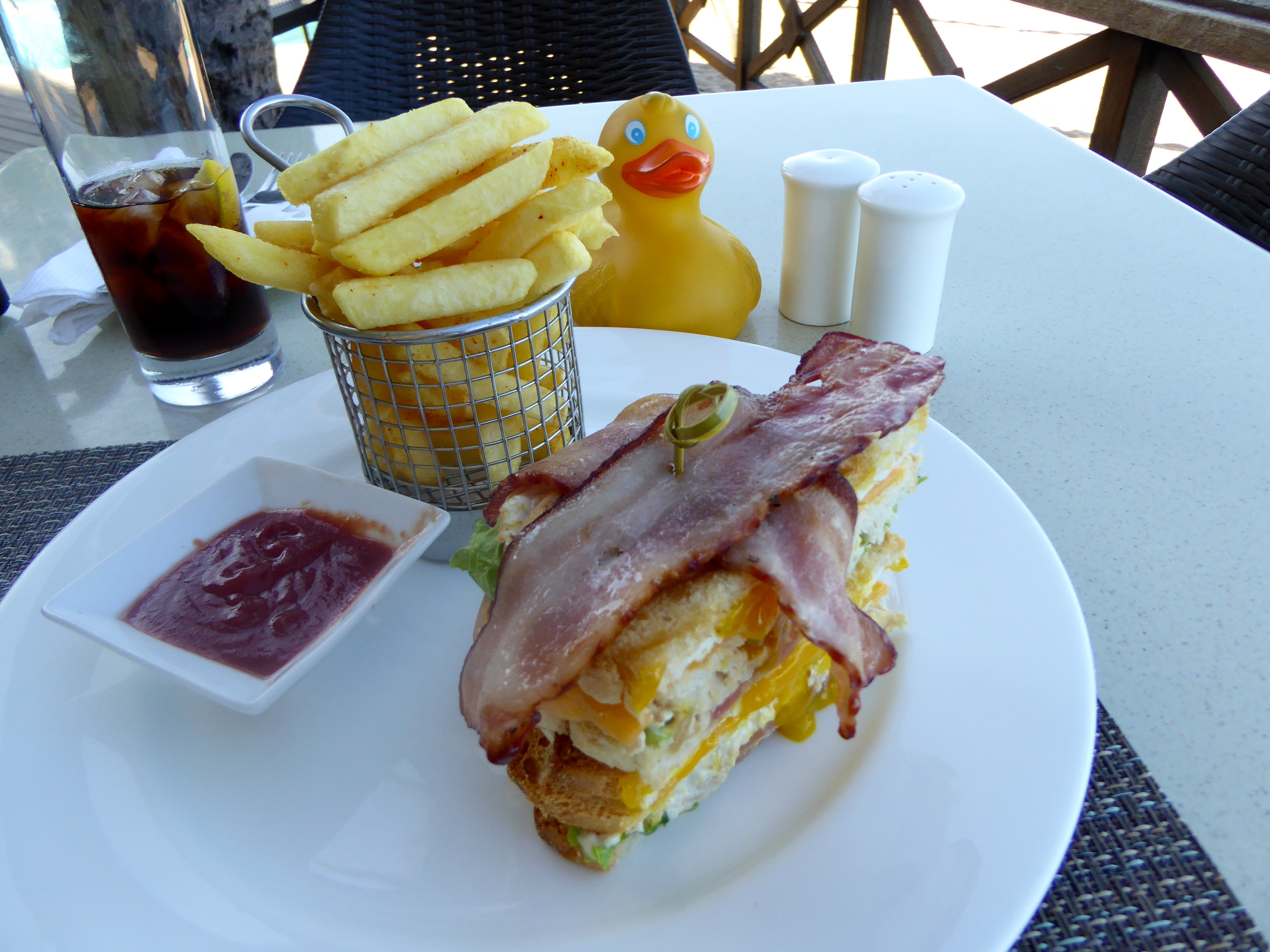 The beach and the Indian Ocean are beautiful. I love this. We rode our horse on the beach for more than one hour. I, Zeb the Duck, did not want to get off this horse. Her name is Bonnie. But we did get off Bonnie. Our driver took us back to Tan ‘n Biki Resort where our lunch was ready. Because we are eating by the Indian Ocean, mom ordered line fish. That is whatever fish they catch on the fishing lines today. That is really fresh and tasty. Our fish was so good. Of course, we did get the whole fish again. I am getting used to fish with heads on our plate. We don’t eat the heads, but many people do. After our delicious lunch, we wanted to walk on the beach. Each of the resorts we visited were beautiful. These are steps going over the sand dunes and on to the the beach.