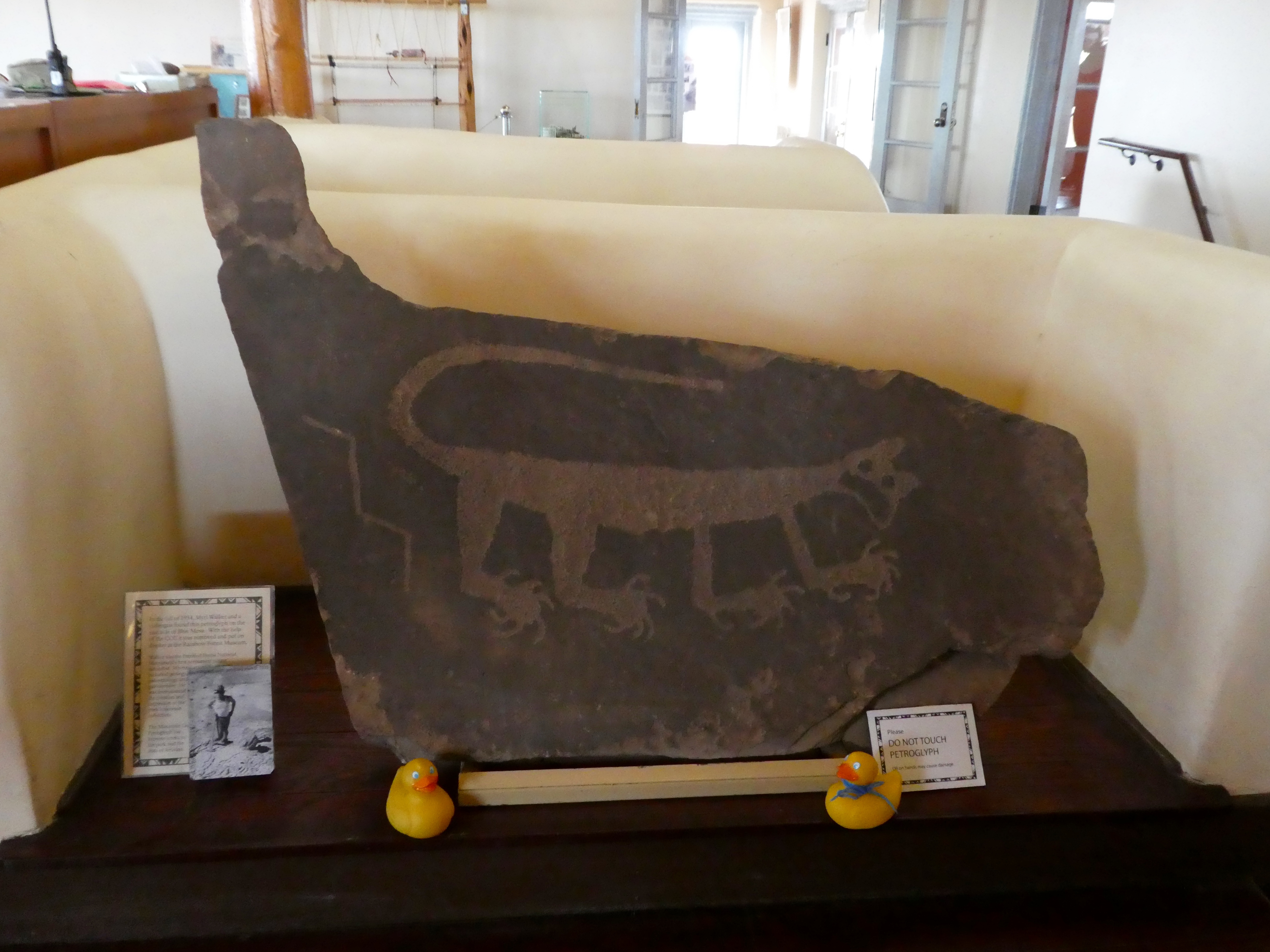 And an explanation for the name, Grand Canyon Caverns. Previously called Dinosaur Caverns as they expected to find dinosaur fossils, but no indication of dinosaurs here. In 1958 smoke bombs were set off in the Mystery Room, and scientists discovered the air enters and leaves the cavern from this room. The air comes from 40 miles (64 km) away, near Havasu Falls in the Grand Canyon. This is really clean air, being filtered through limestone and various rocks for 40 miles! These caverns are now known as Grand Canyon Caverns. A natural opening to the caverns once existed. This is how, in 1927 Walter Peck discovered them. When he sadly realized there was neither gold nor silver here, he lowered tourists, attached to a rope, into the hole in the ground and into the caverns. We now know, unfortunately, not only tourists entered the cavernous through that hole. This is a mummified bobcat.