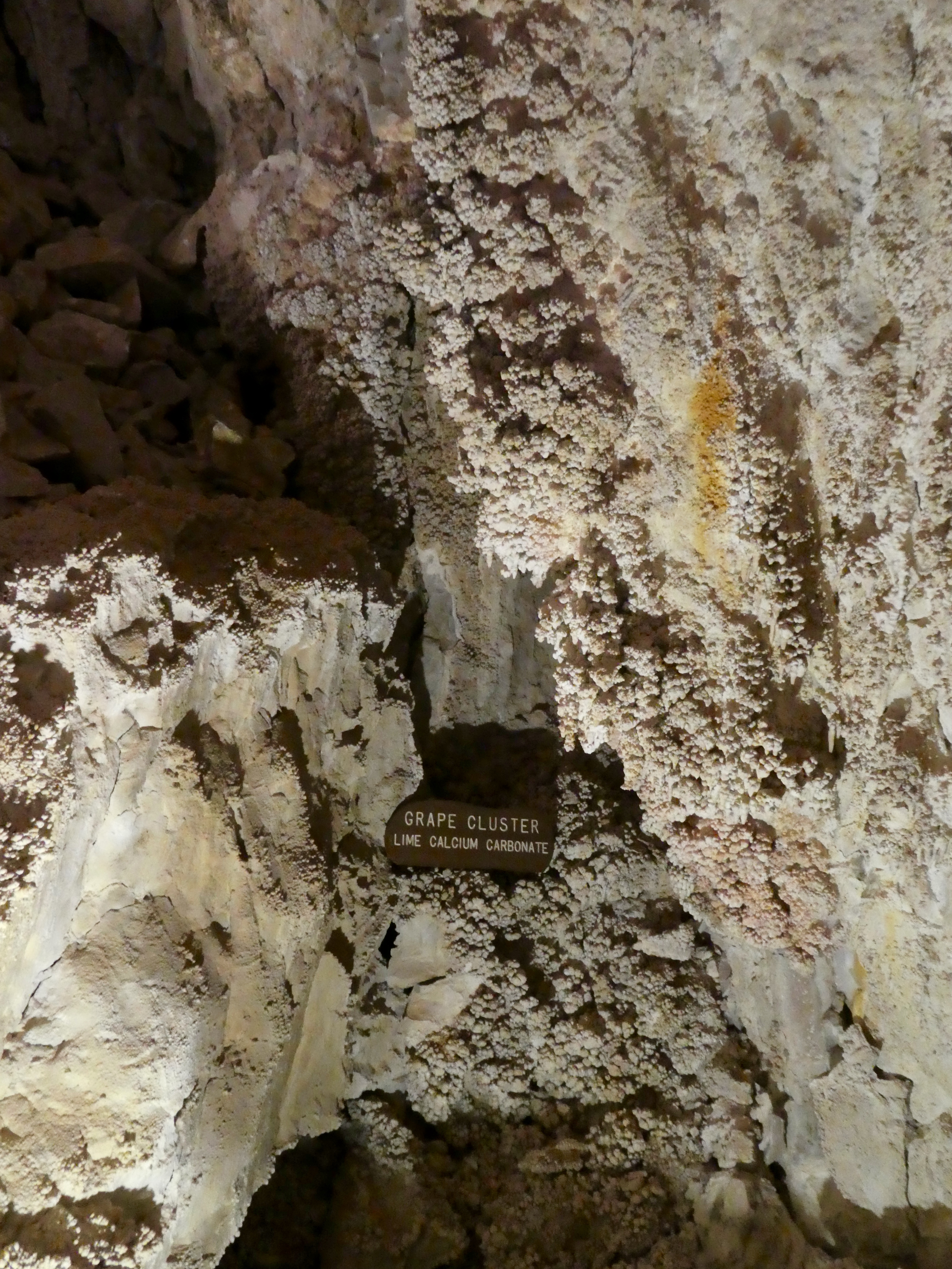 This sloth has been extinct for at least 11,000 years. When she fell in, she tried to climb back out. Her claw marks are visible on the wall of the cavern. She lost a claw, embedded in the rock, in the process. Discovered in the late 1950’s, her bones were sent to the University of Arizona for identification. They, in trade for the bones, built this life size replica for the caverns. She was 15 feet 4 inches (3.1 meters) tall and weighed 1 ton (1,000 kg). She entered the cavern between 11,000 and 20,000 years ago. There are many formations here. These are called grape clusters formed from mixtures of Calcium Carbonate and Lime.