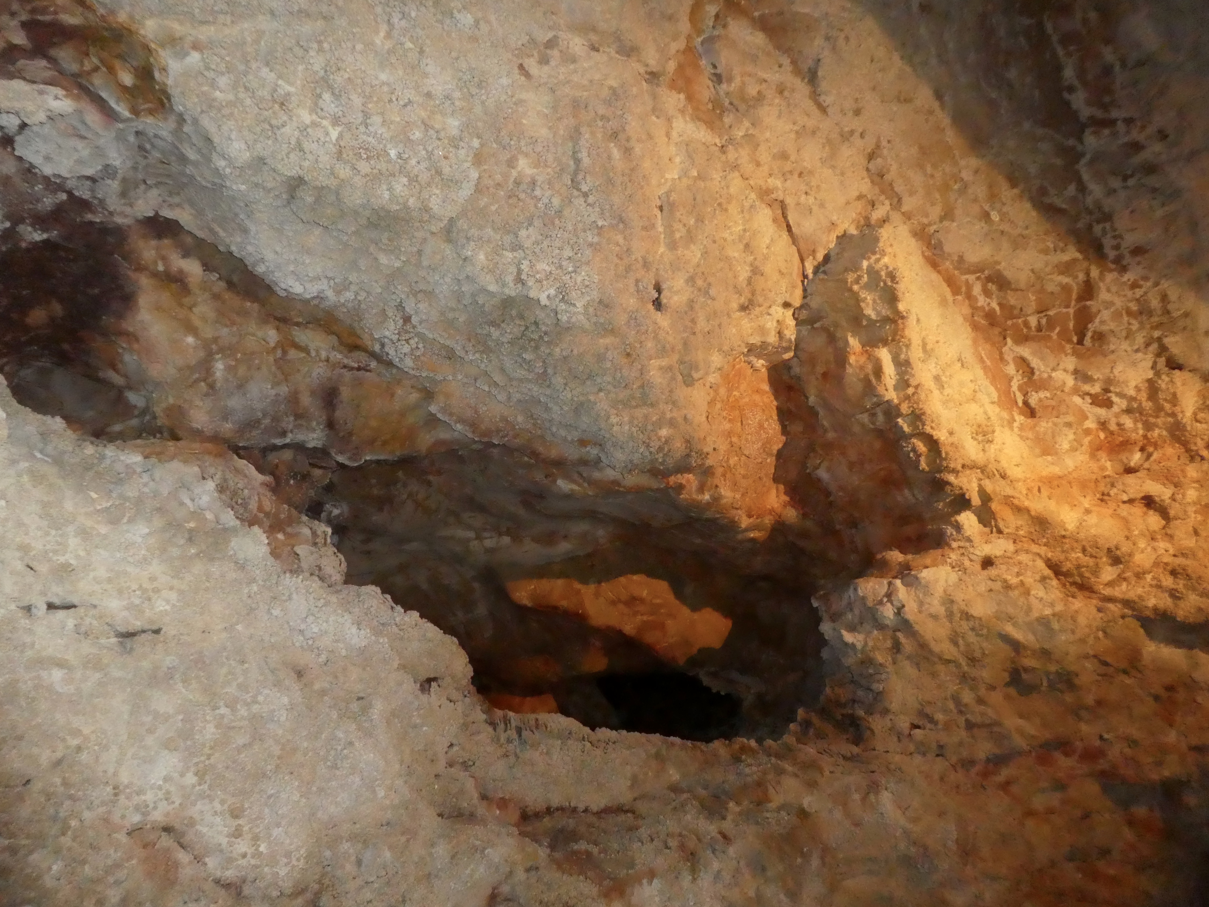 On either side of the walkway we observed ancient waterways, or floor drains, descending 35 feet (10 meters). Really ancient, as this is a dry cave–no water enters this cave now. So, there are no stalactites and no stalagmites in this cavern.
