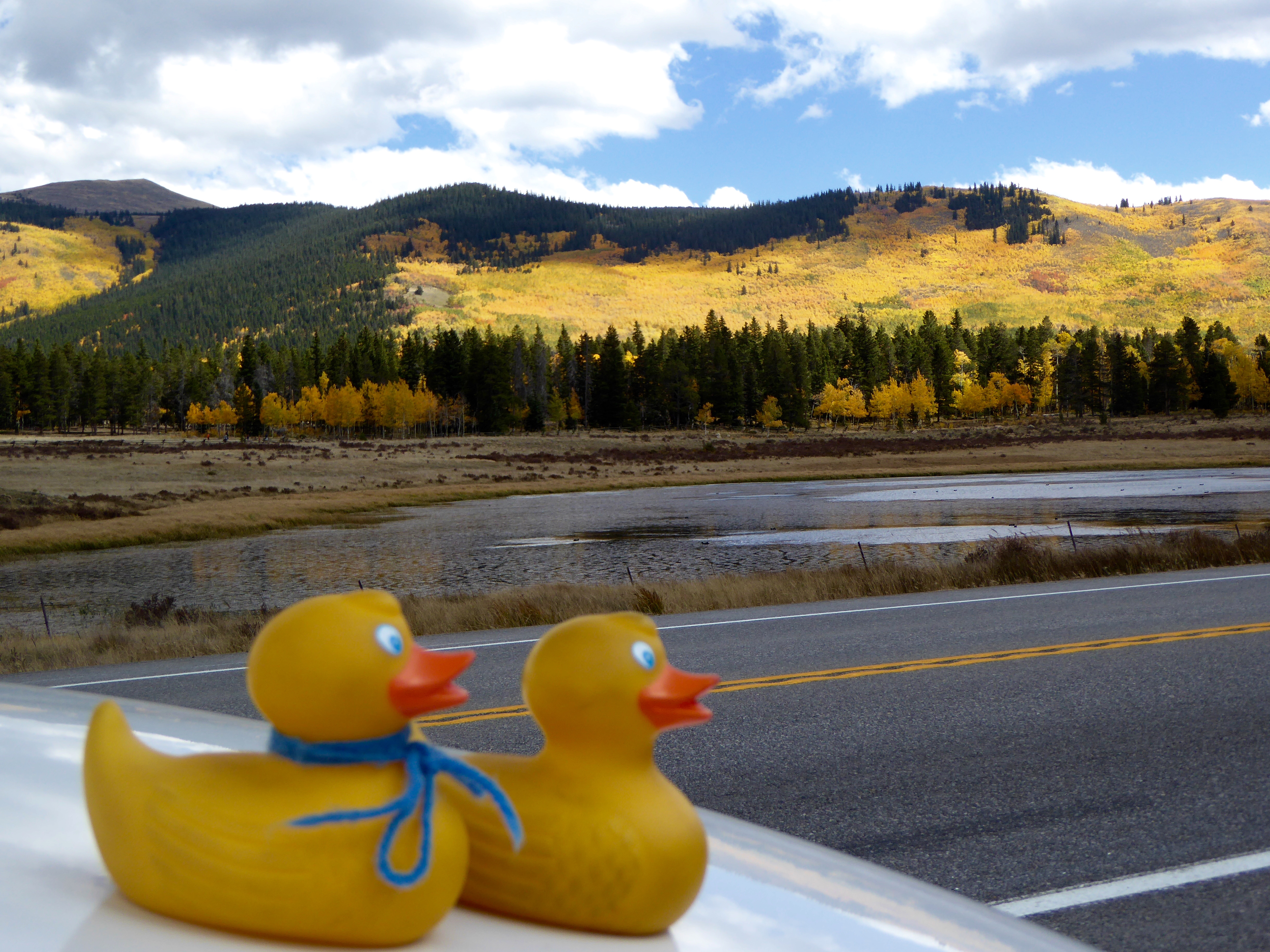 Wow! We love the pine trees mixed in with the aspen, now some green, some red, some orange, and most are vibrant yellow. Here we are, sitting on the car, looking across a wet area.