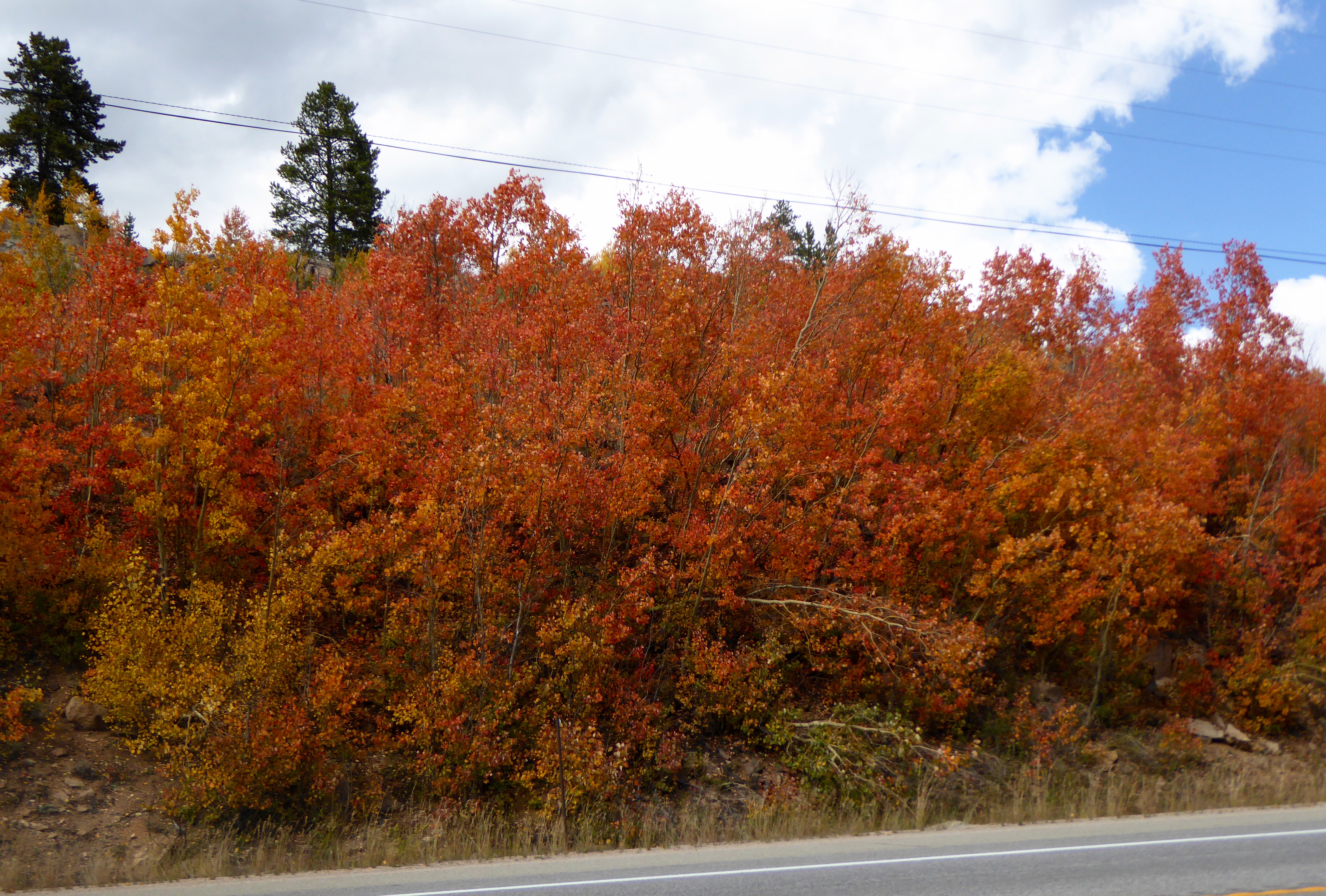 It is nice to see so many people enjoying the nice weather and the beautiful fall colors. On the television and in the newspaper, many long time photographers said that this is an exceptional year for leaves. Our aspen do not have the big leaves or the bright reds of the maple trees in other parts of the country, but our small leaves shimmer in the sunlight and look beautiful with the green pine trees, granite mountains and the Colorado blue sky. For a short time the aspens are orange and red also. This was a treat to see the group of red aspen by the road.
