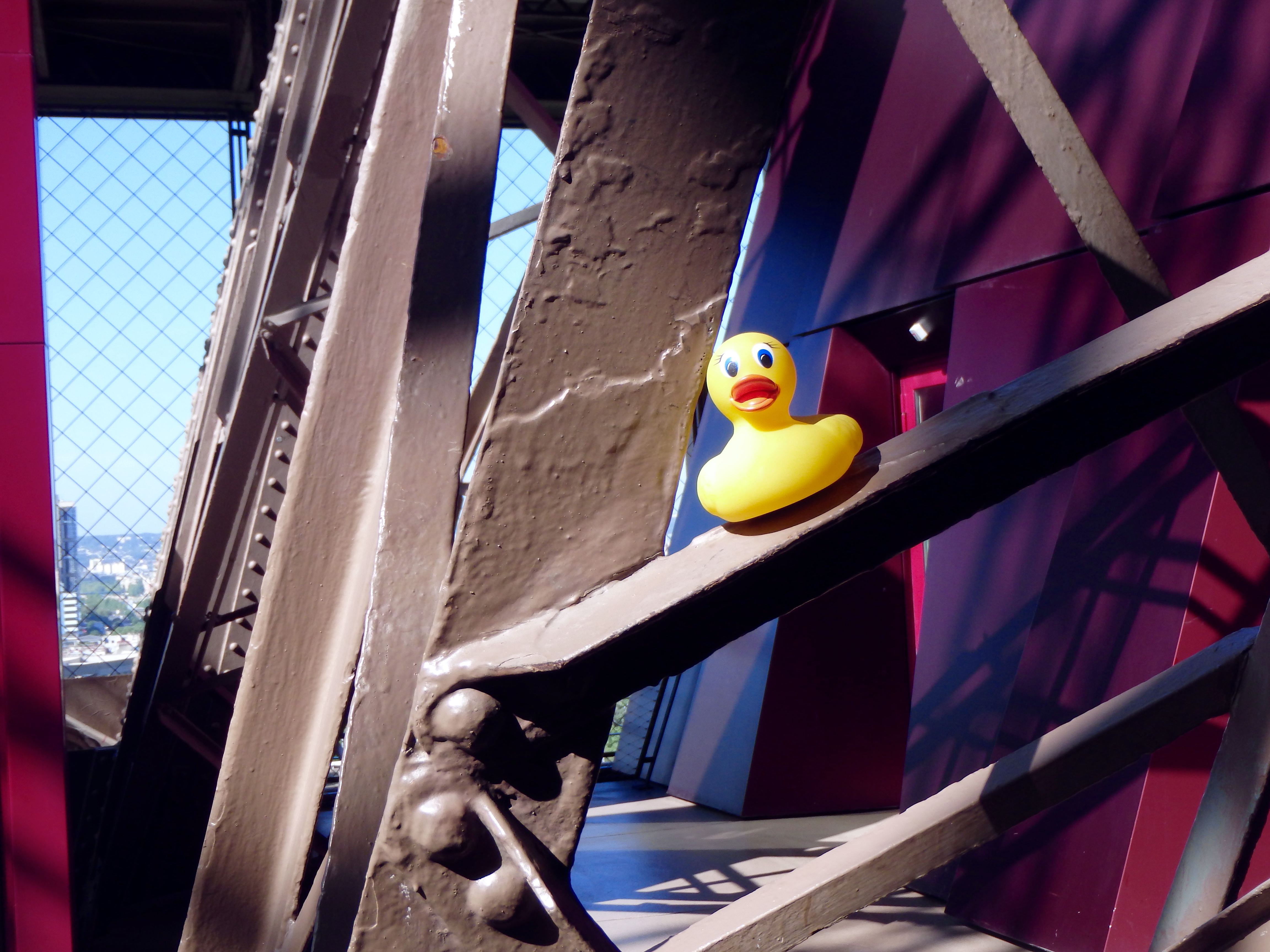 This is scary. Remember, I am a little duck. I am on a strut that support the Eiffel Tower.