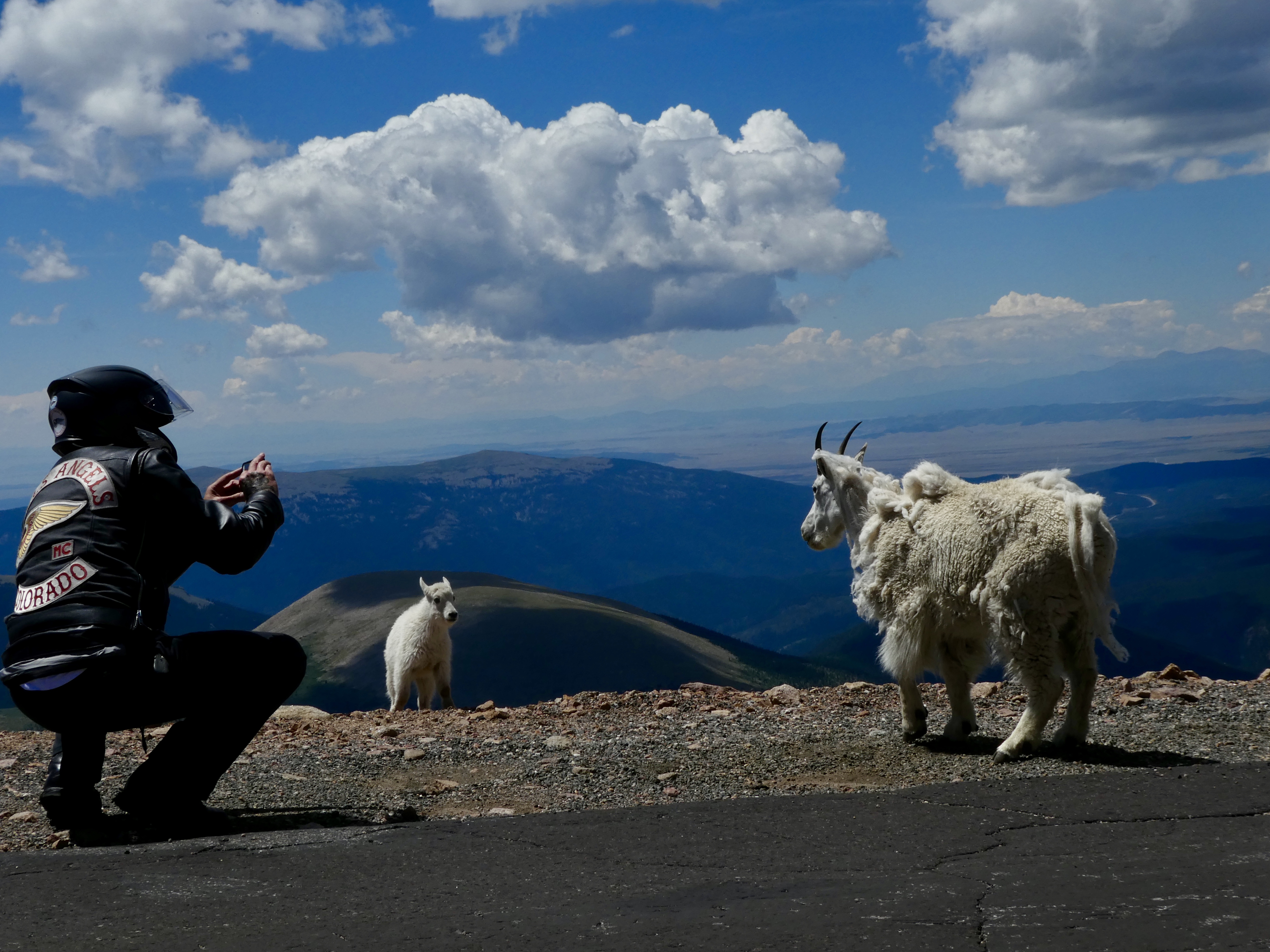 As we approach the summit of Mt. Evans, these Mountain Goats are wandering. Humans do stop to admire and photograph the animals.