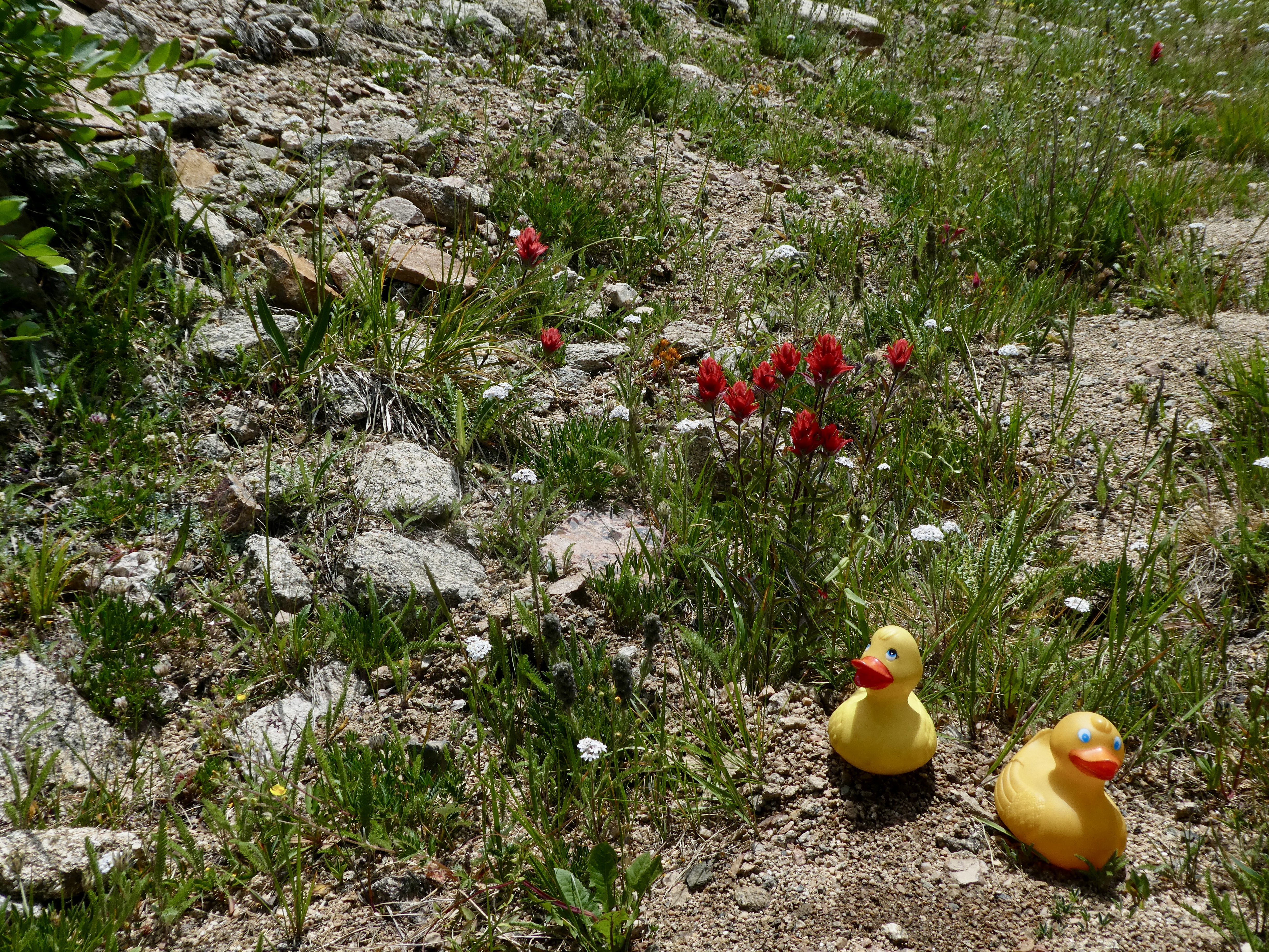 I, Zeb the Duck, love red wildflowers. If you did not drive to the summit of Mt. Evans this summer, we hope you plan to go next summer. It is beautiful and you pass through so many climate levels. You will be above tree line. You will see arctic tundra. We hope to see you there next summer.