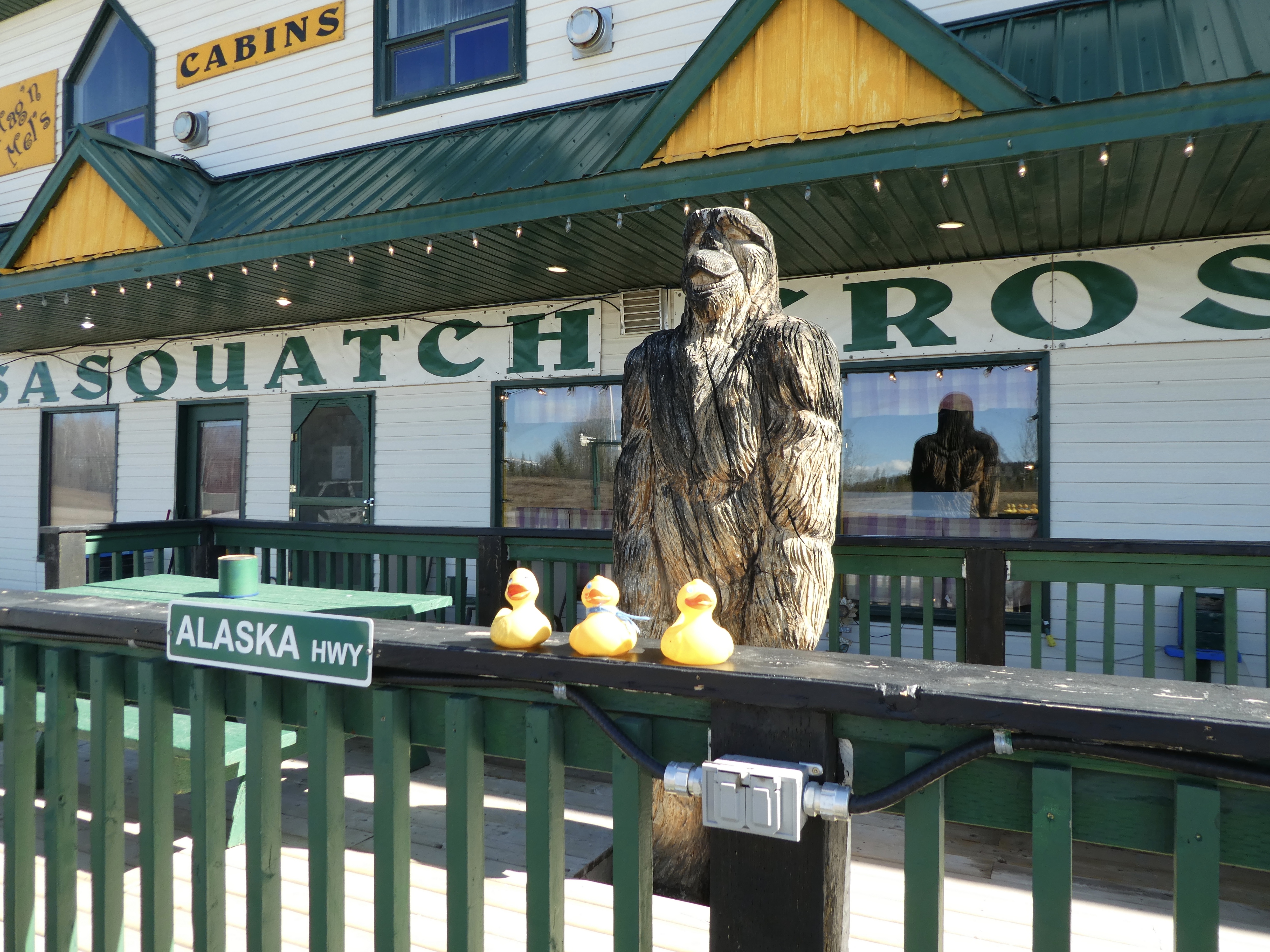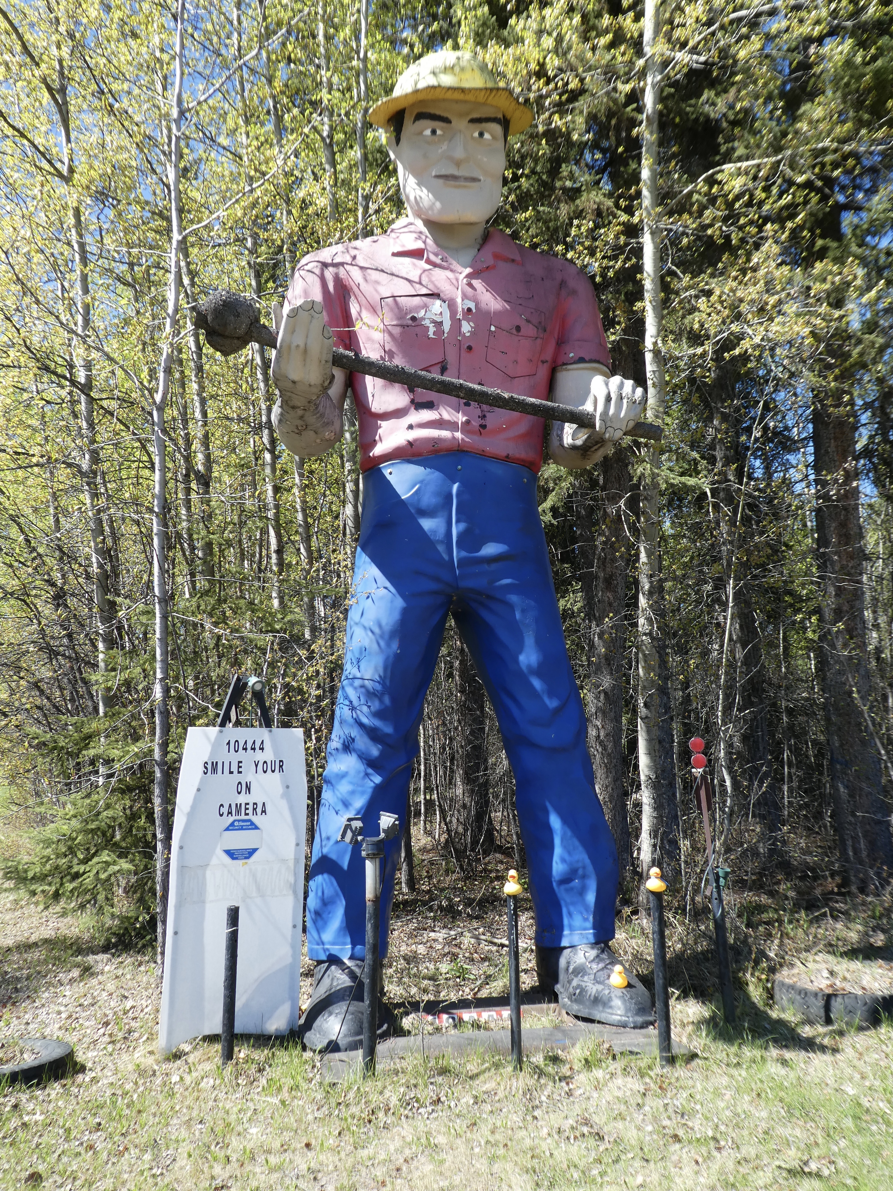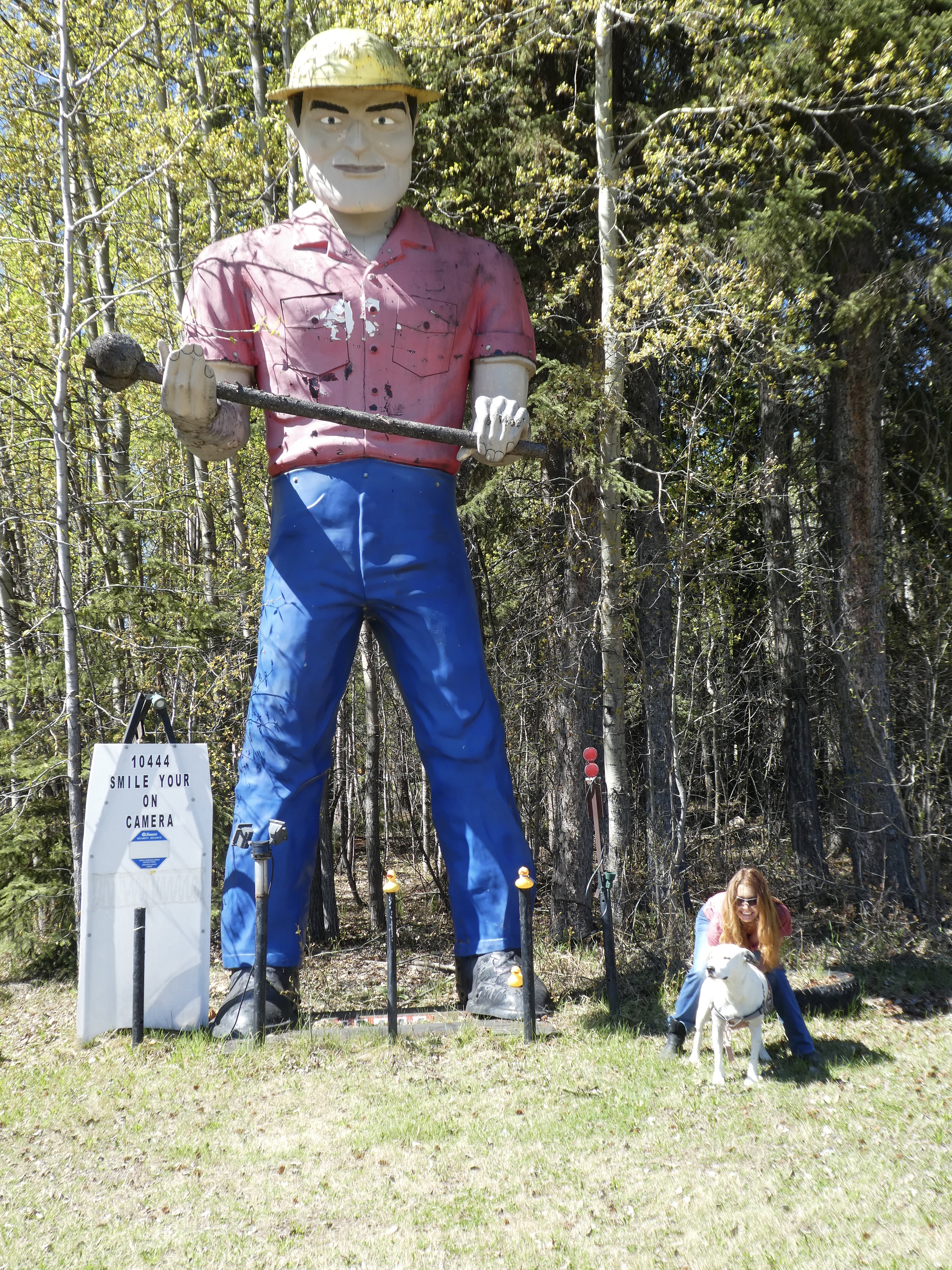 Here we are at Sasquatch Crossing. Sasquatch is in front of his restaurant. Too bad we already ate. Still heading towards the United States, but still on the Alaska Highway, we stop for Muffler Man a little north of Fort St. John.
