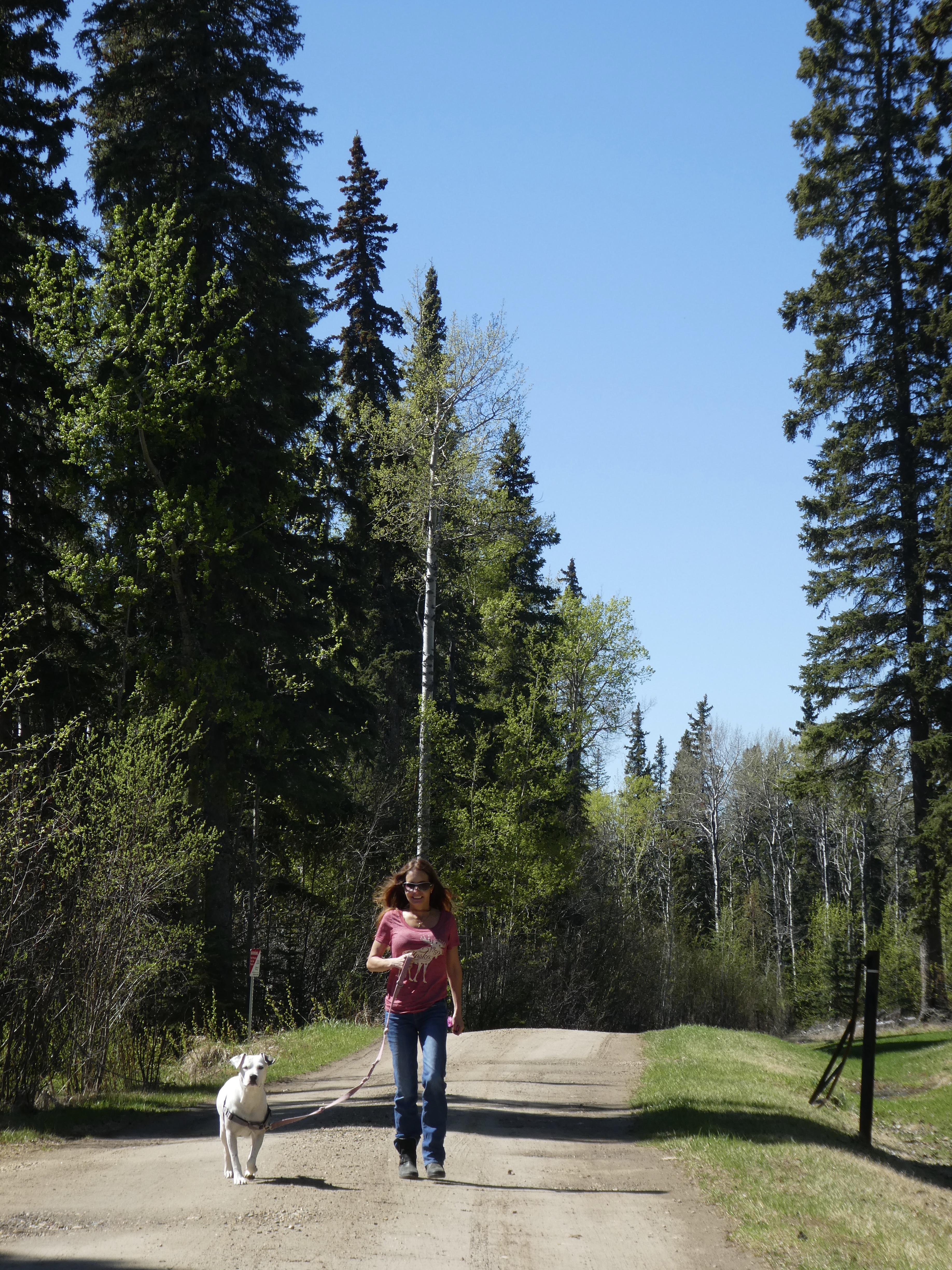 We stopped for the night at Fort St. John while heading north. As you may remember, there was snow. We had snow every day while heading north. It is nice now, so Chloe took us all for a walk.