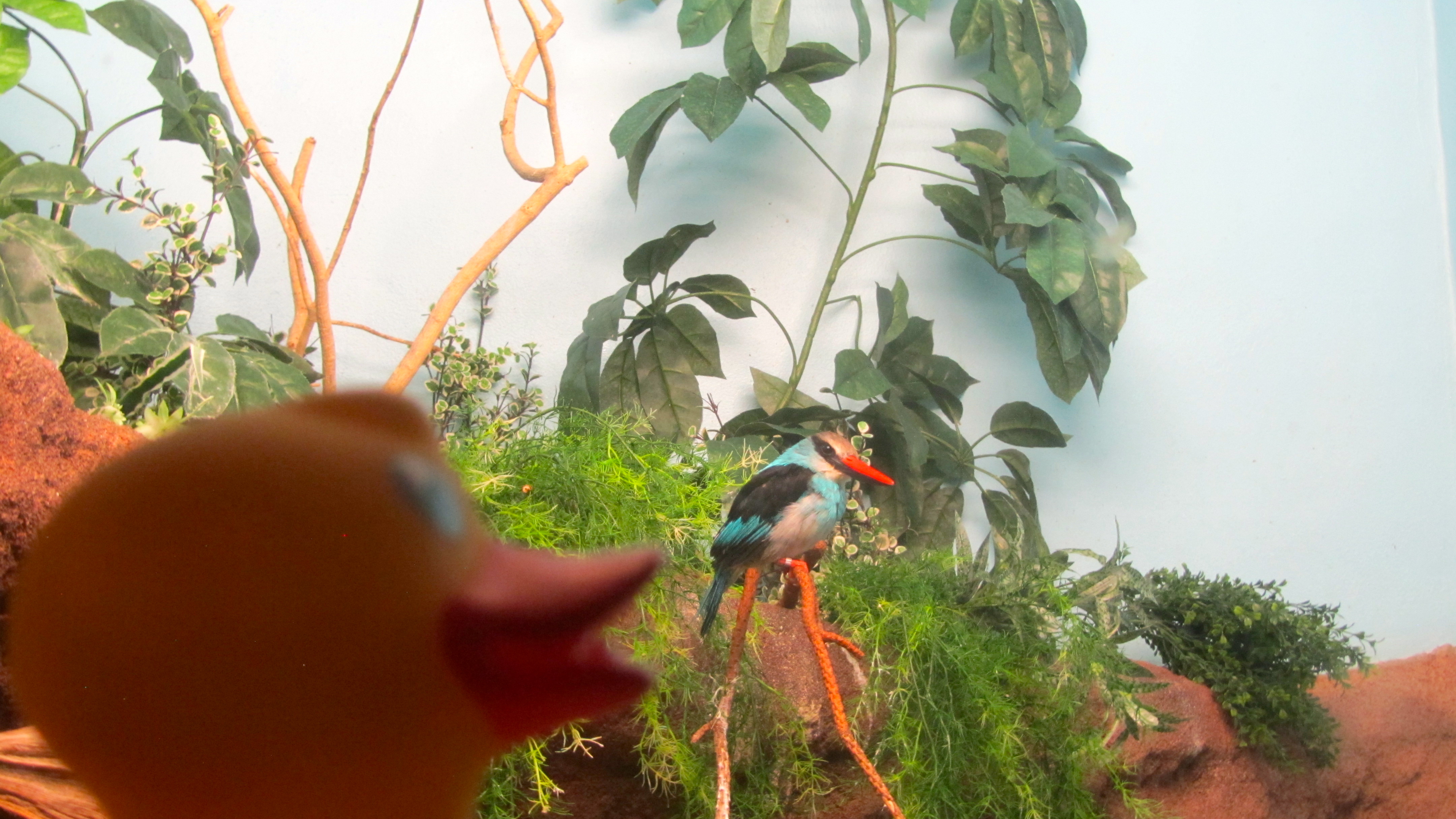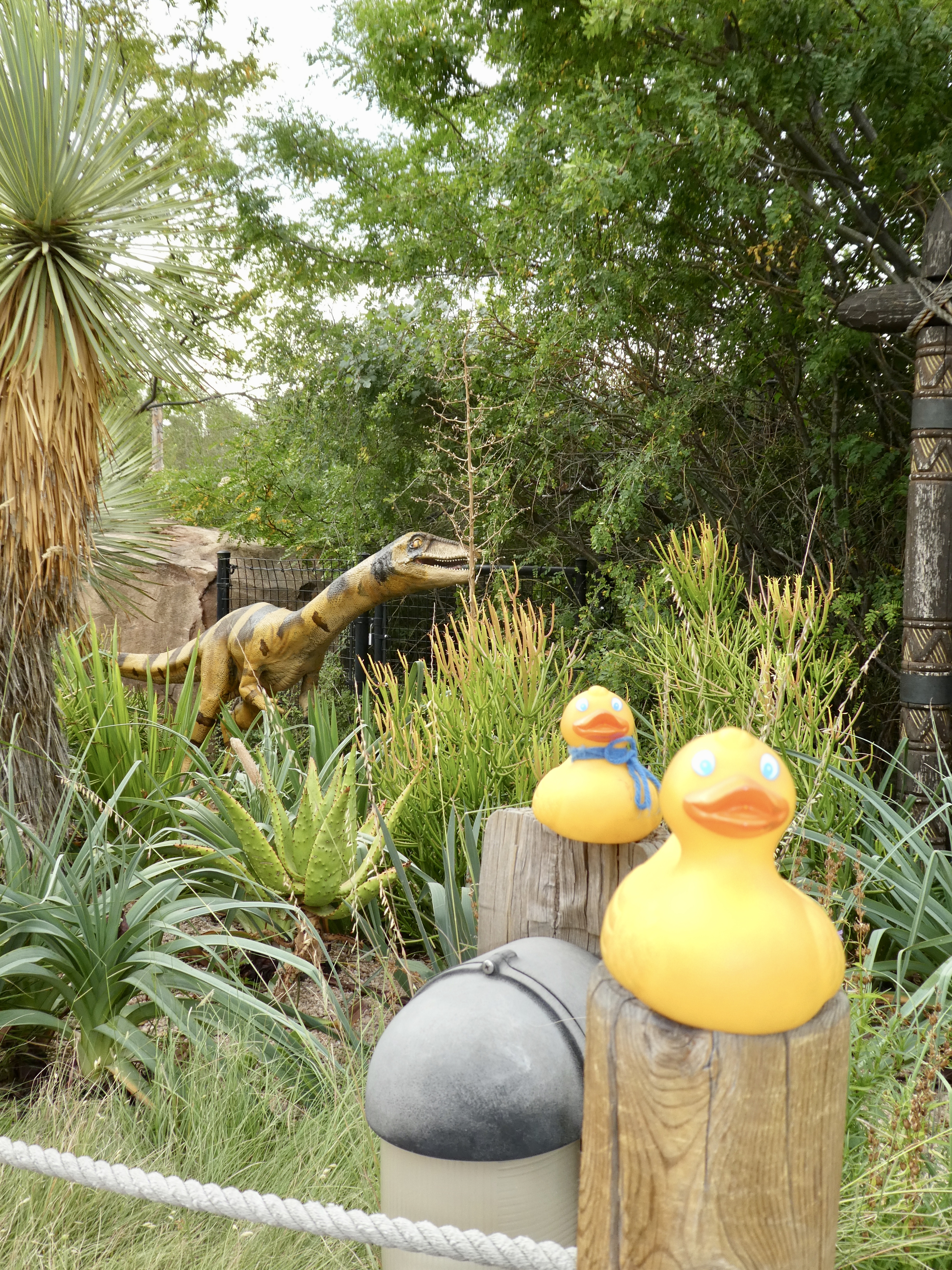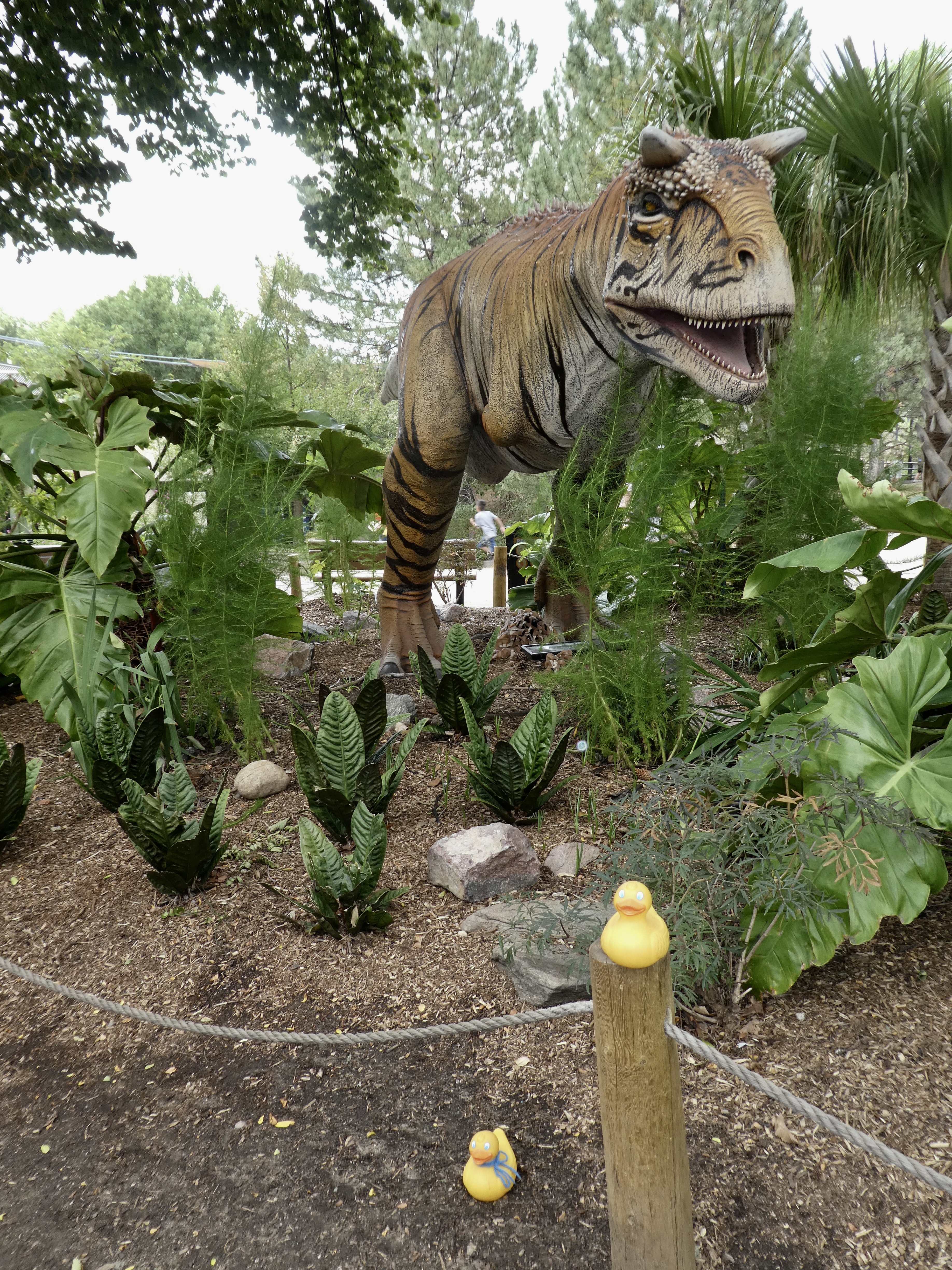 Ducks, let’s go to the zoo! Some of our favorite words. But what is this? Dinosaurs at the zoo? Aren’t they extinct? Let’s look around here. This is Coelophysis.