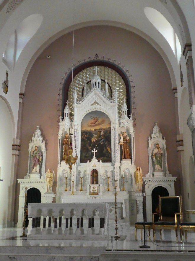 This altar is made from Italian marble. Along both sides of the church there are beautiful stained glass windows.