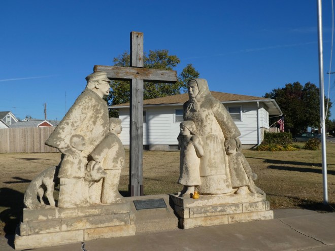Isn’t that circular window beautiful? Don’t you just love to visit huge, beautiful churches? I do. Construction on this church began in 1908 and was completed in 1911. The community had outgrown three previous churches. The first 23 pioneer families arrived here April 8, 1876. These pioneers were Volga-Germans. As more pioneers arrived, the town flourished and this church was built. Across from the Basilica, we admired this statue, a tribute to the early pioneers.