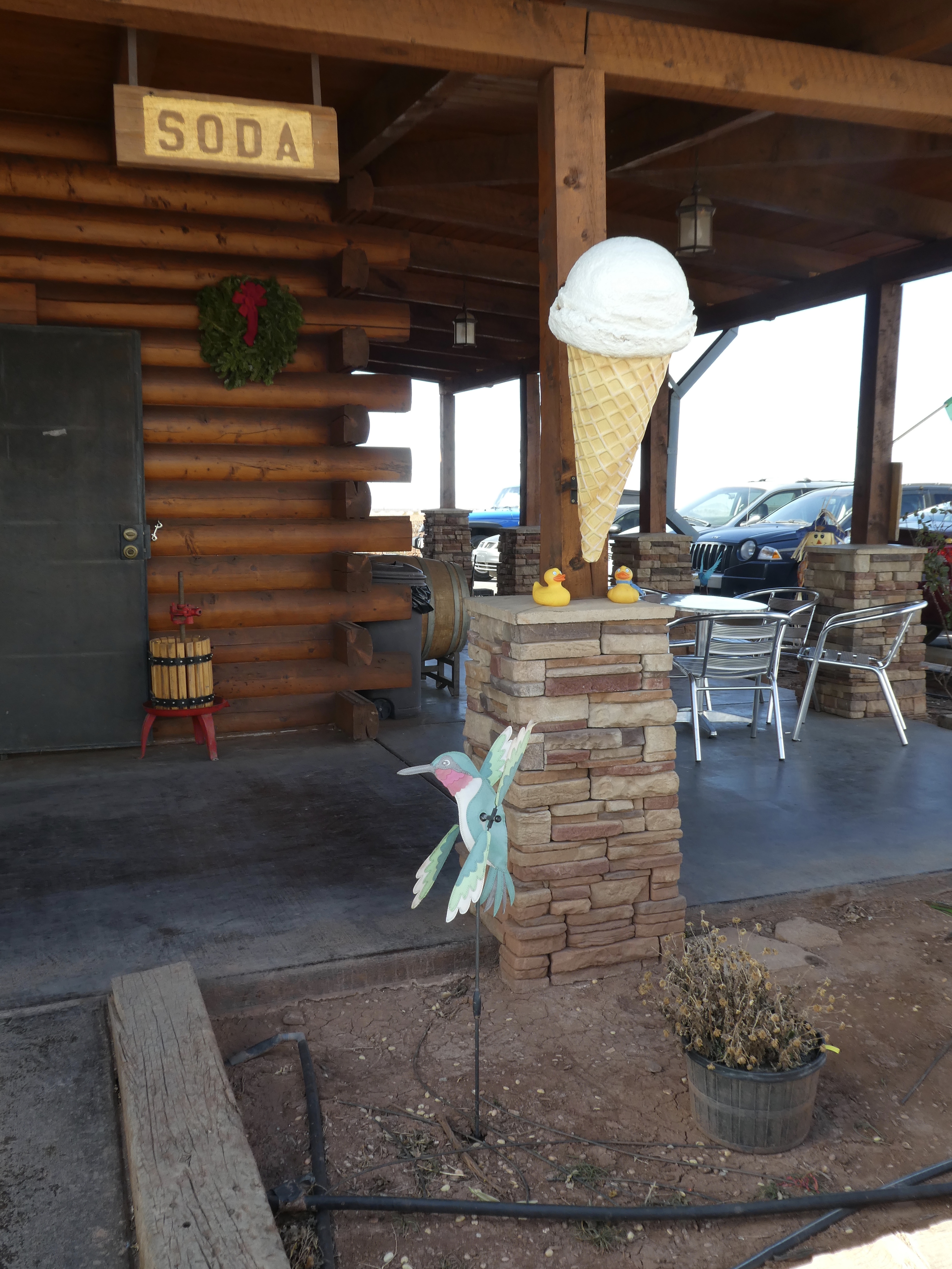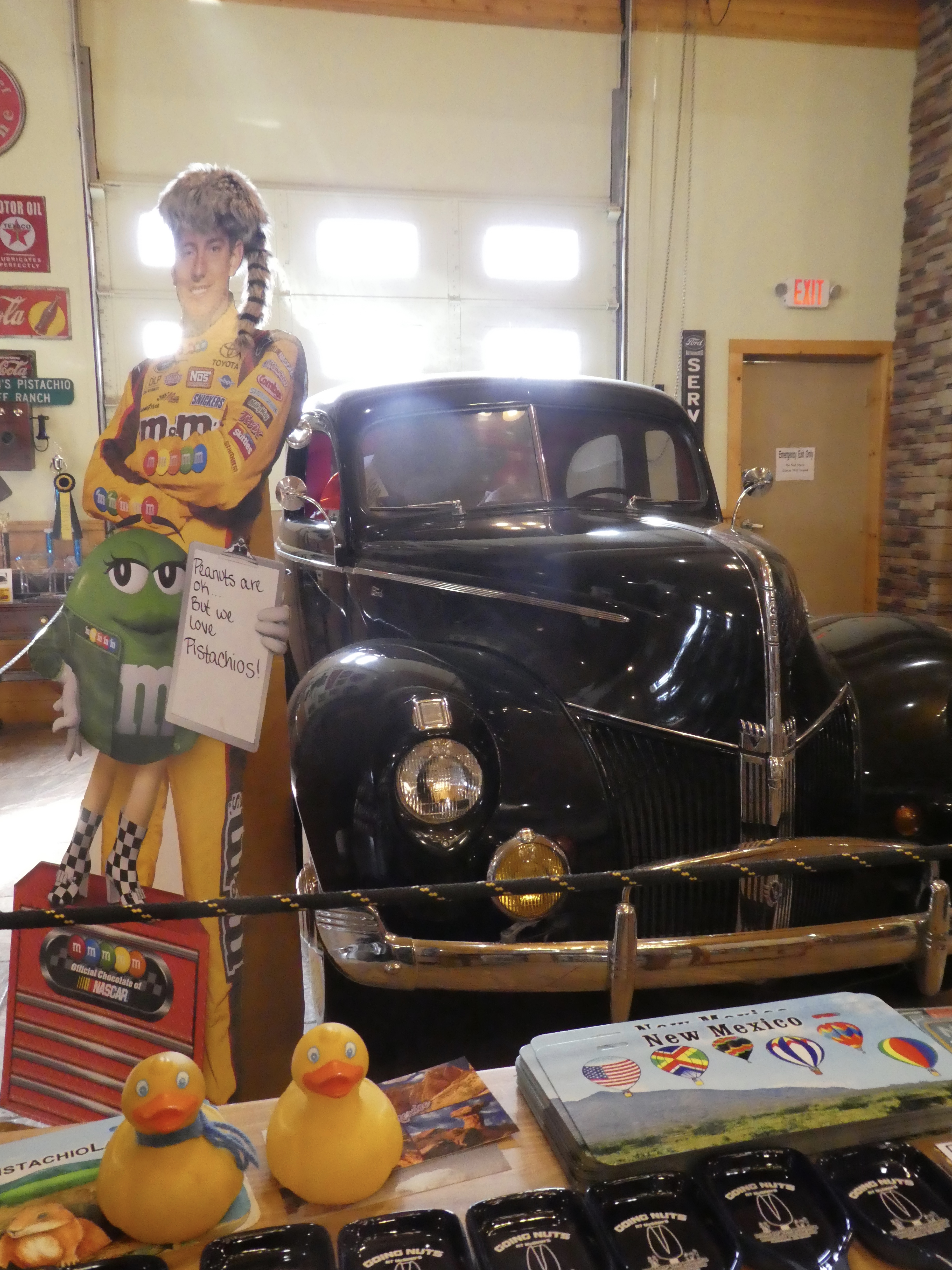 Adding to the rustic atmosphere, we are sitting on wine barrels, under the sign for the Saloon and Hotel. Inside the gift shop, we found normal souvenirs of t-shirts, post cards, refrigerator magnets, and many fascinating items. Also a nice collection of regional cookbooks, many flavors of salsa and sauces, and wines. There was a sampling table of candy, most with pistachios. We especially liked the pistachio brittle. Soapy’s mom liked the chili pistachio candies also. Another section had old signs and this 1940 Ford.
