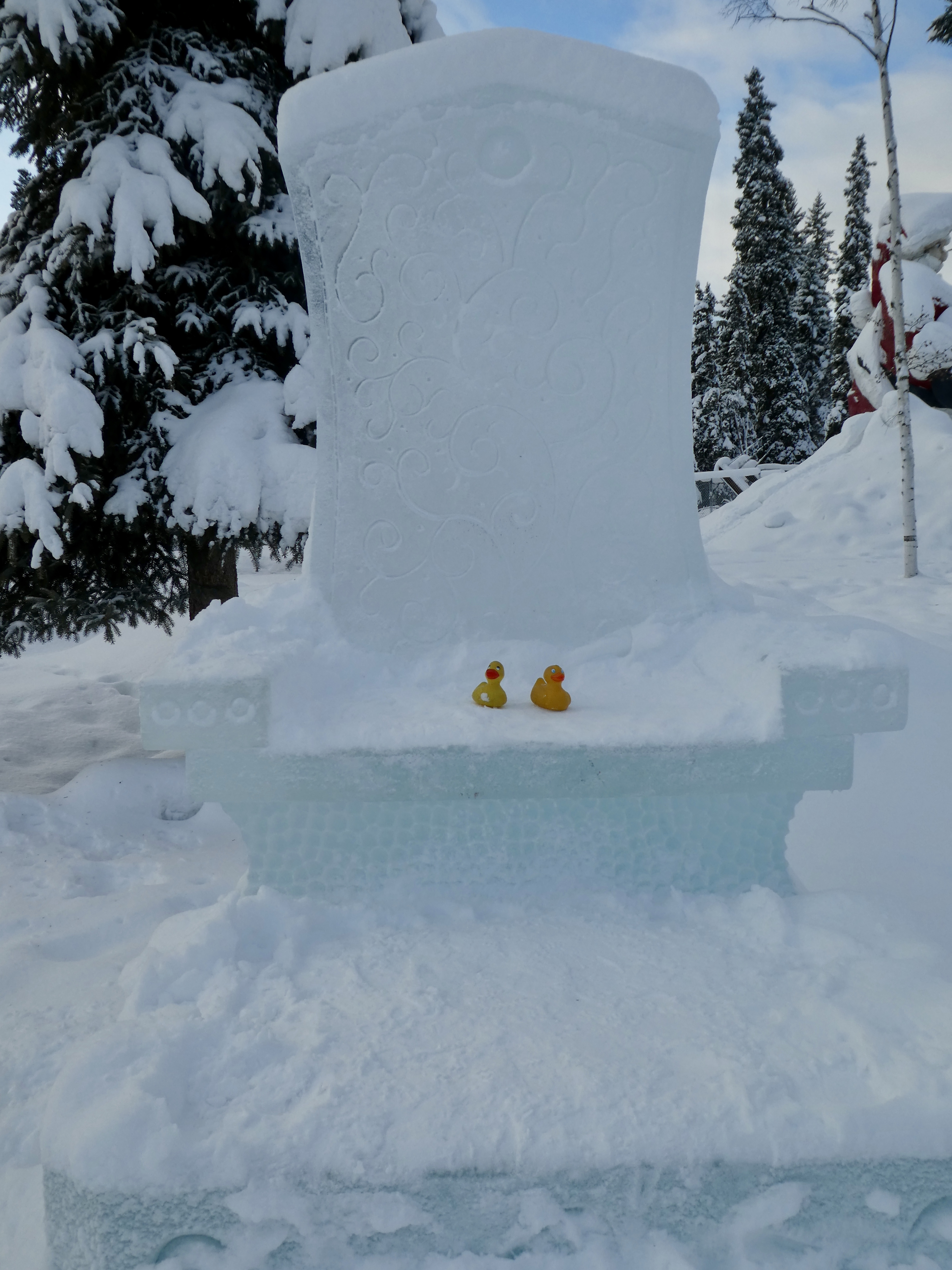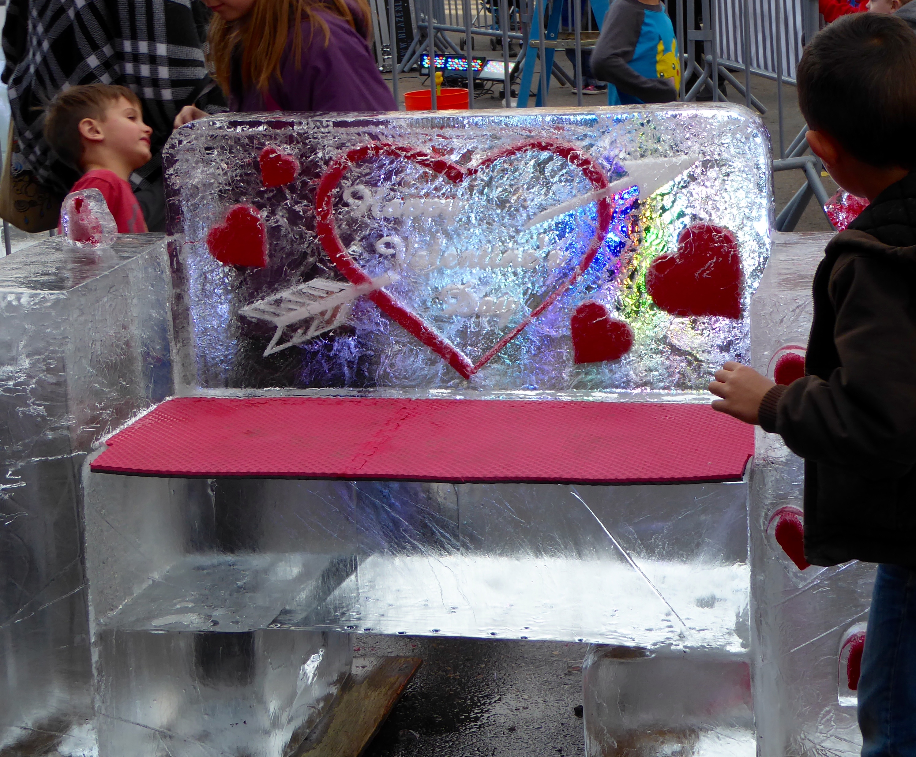 This sculptures is for touching, but sitting on an ice hat is rather chilly.