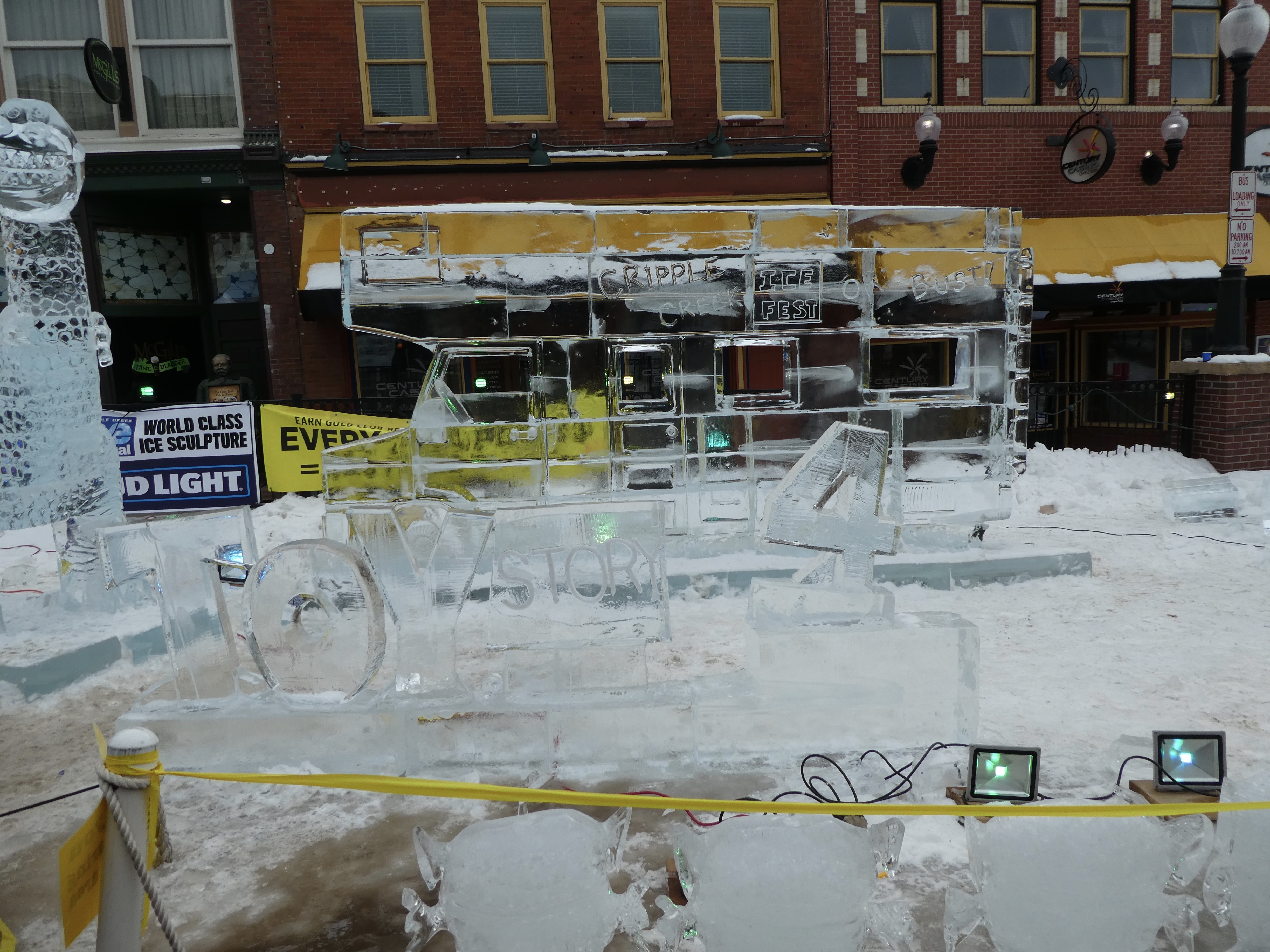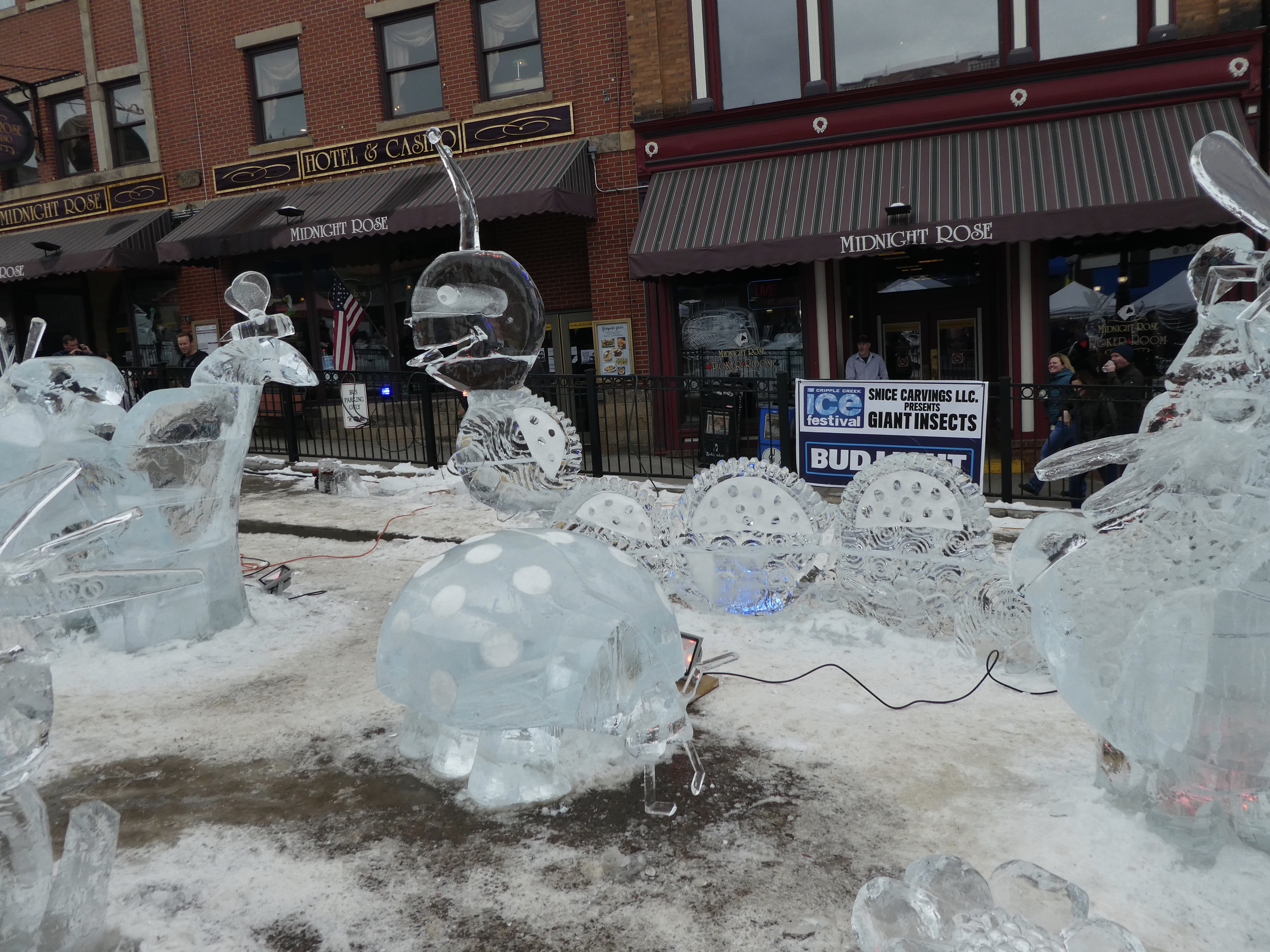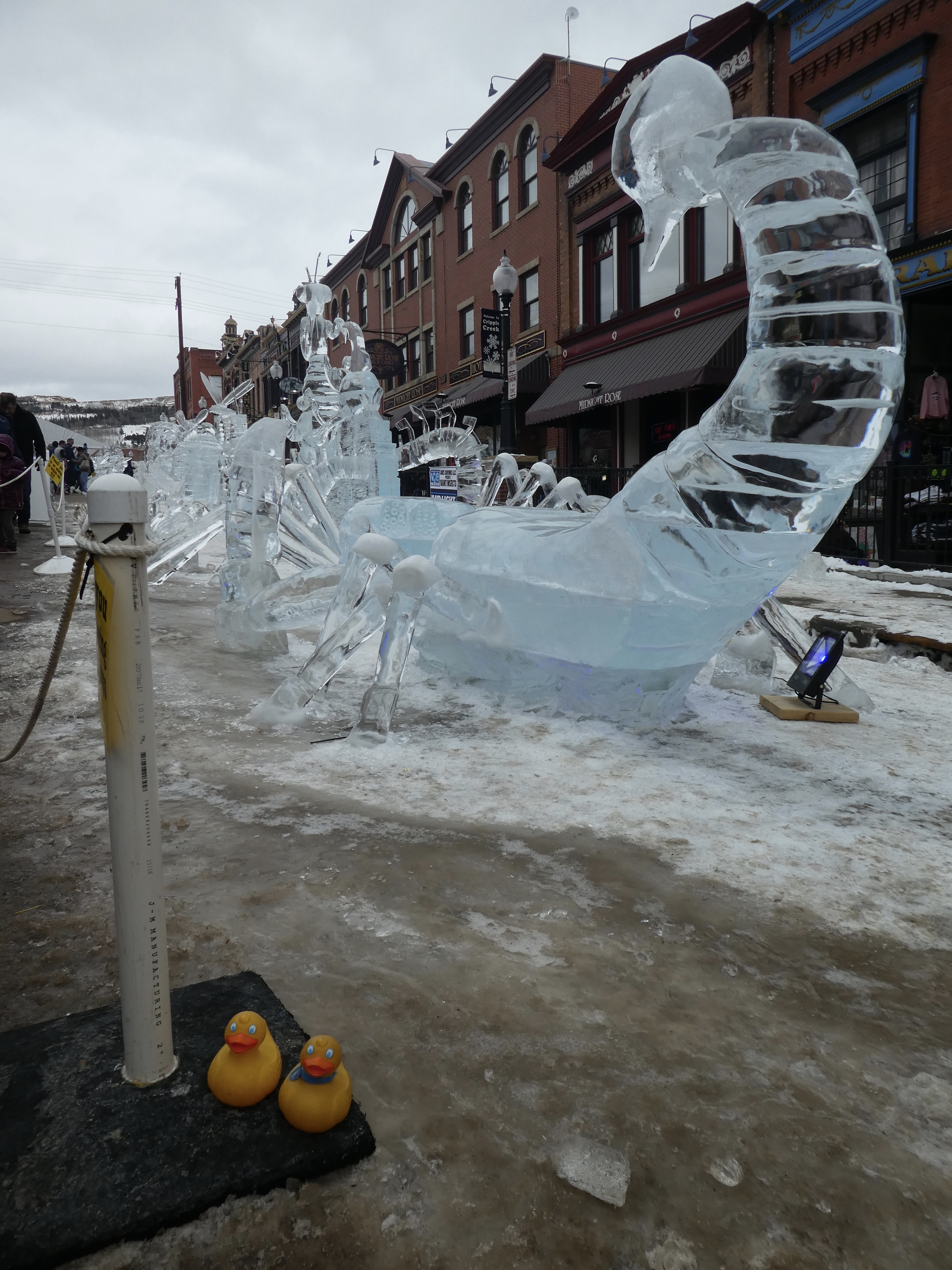 Cripple Creek does have limited stakes gambling. But today we are just looking at ice sculptures and snacking. Perhaps casino hopping next trip. There were so many more ice sculptures that we did not show you. All are beautiful, especially with Colorado sunshine on them. We hope you visit Cripple Creek next February for the 2 week ice festival. It is wonderful.