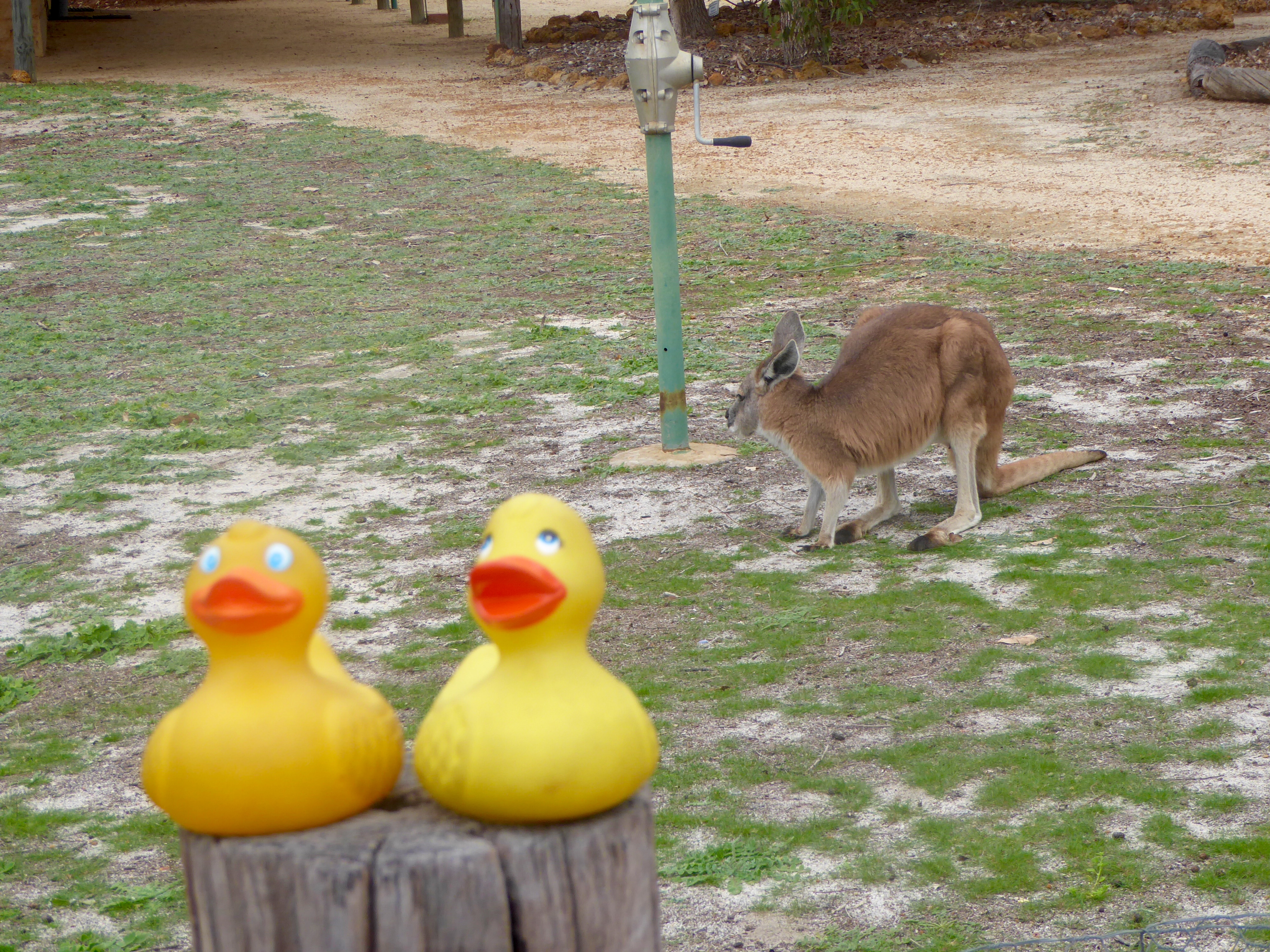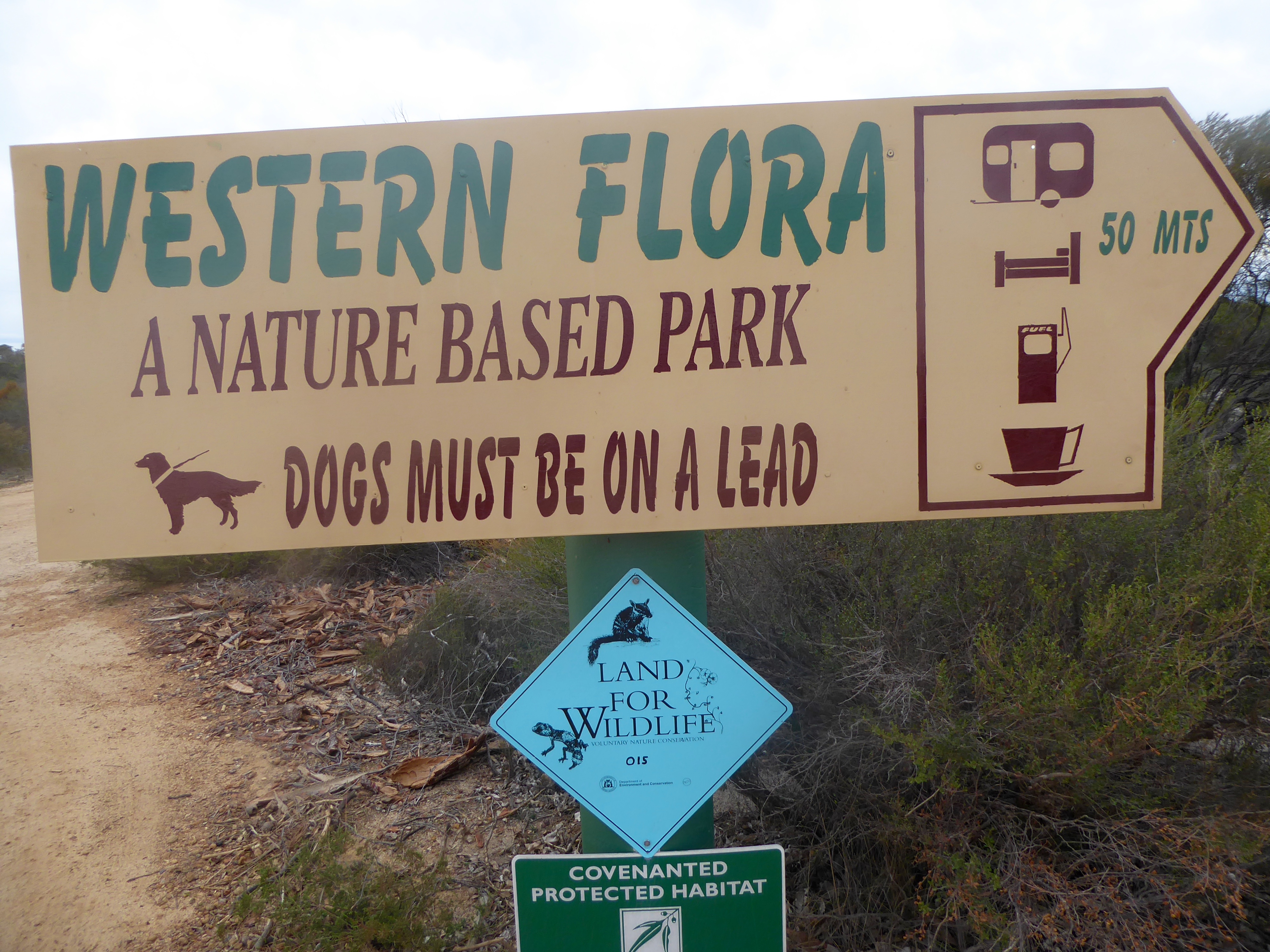 Zeb, Eider and the humans rented a car and we are driving north from Perth in Western Australia. We stayed a night at Western Flora Caravan and Tourist Park.