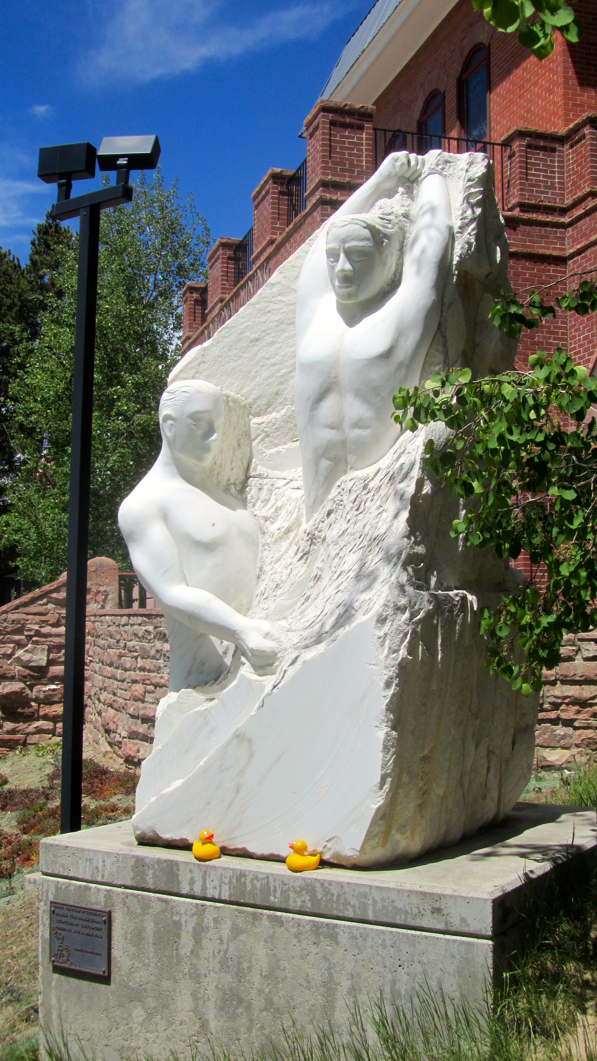 It is symbolic of Double Jacking. The marble for this statue is from the Yule Marble Quarry in Marble, Colorado. Marble from this quarry has been used in the Tomb of the Unknowns and part of the Lincoln Memorial in Washington, D.C.