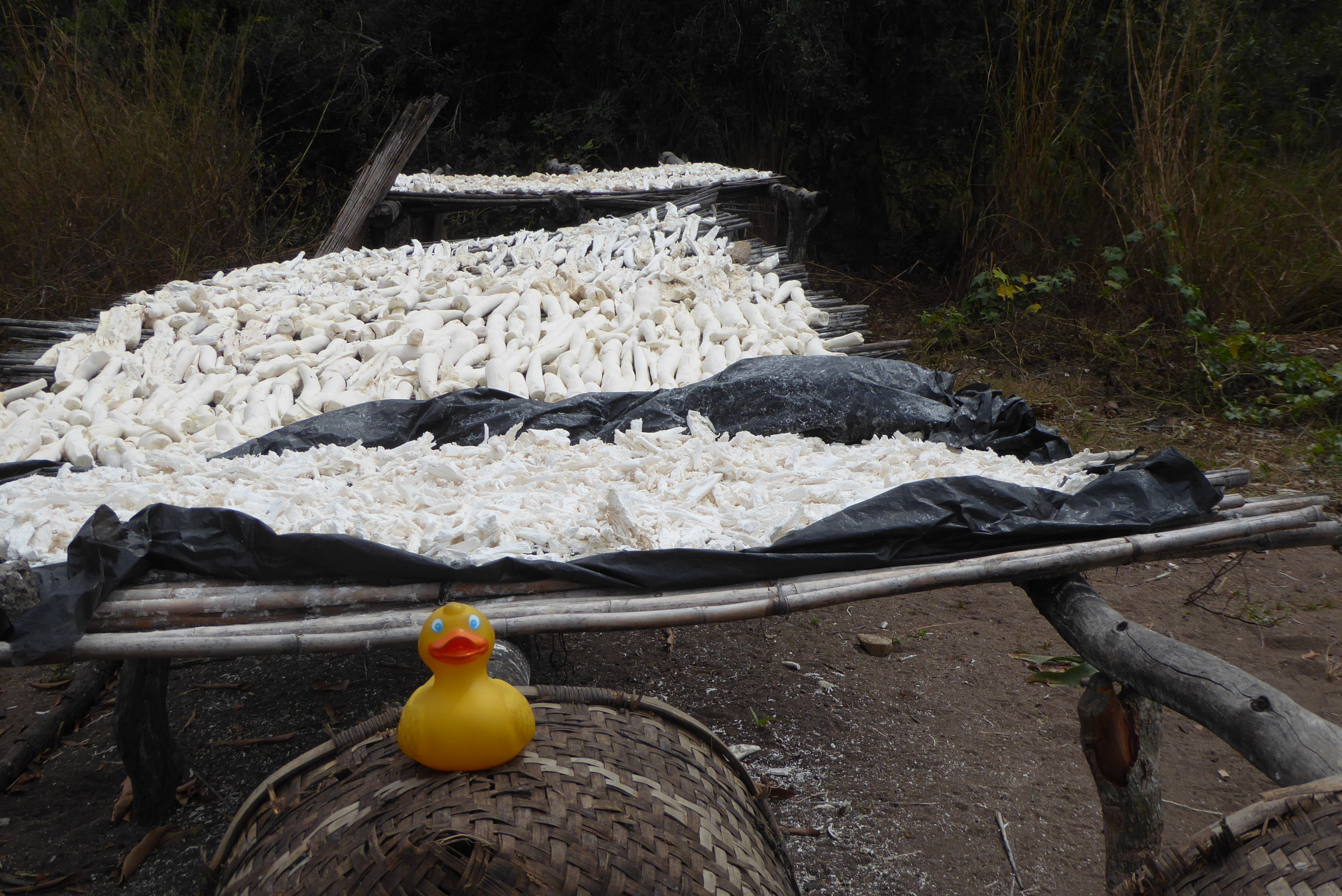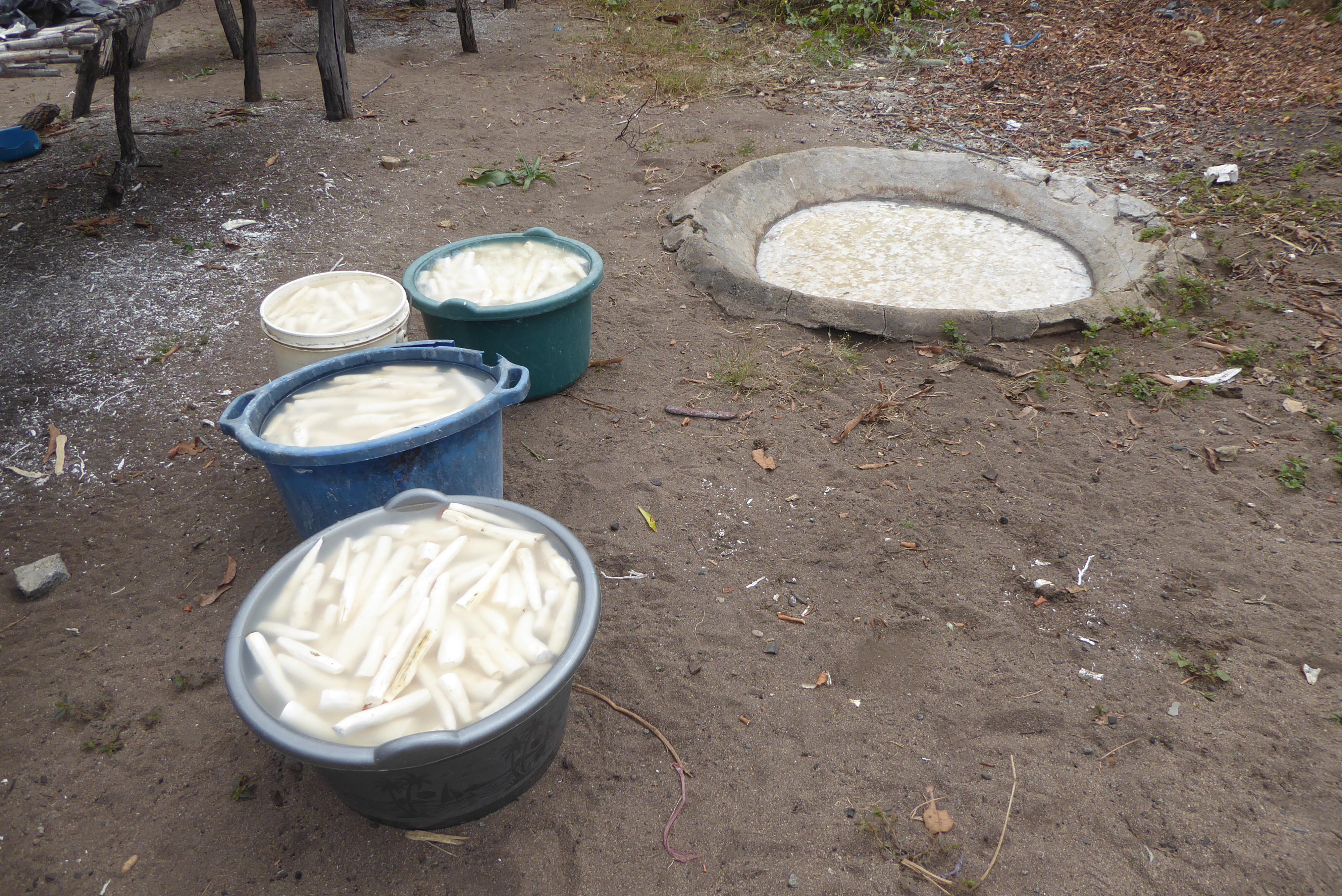 Cassava is a root vegetable and one of the main foods eaten in this area.   Before soaking, the cassava is peeled.   After peeling and soaking, the cassava is dried in the sun.