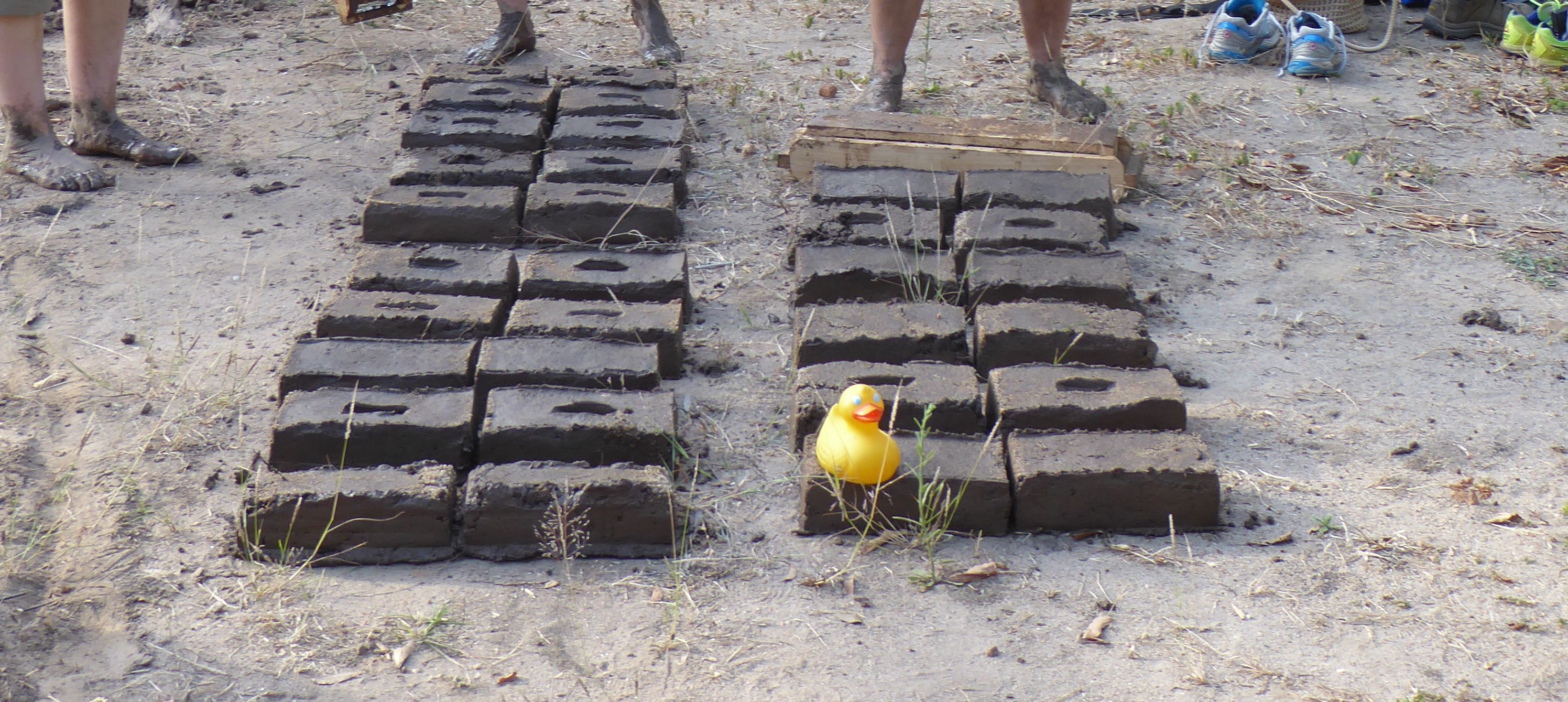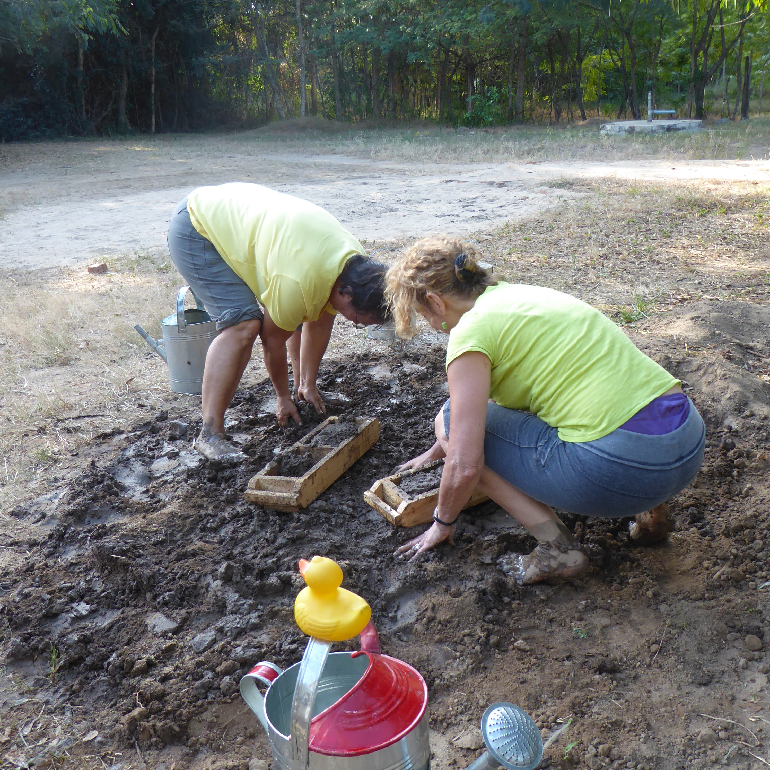 Ripple Africa teaches about reforestation and is involved with the local community to plant trees.   Also at the nursery, the human volunteers made bricks.   First they removed their shoes, put water in the dirt, and walked barefoot, mixing the dirt and water to make mud.   Then the mud was put into molds for bricks.