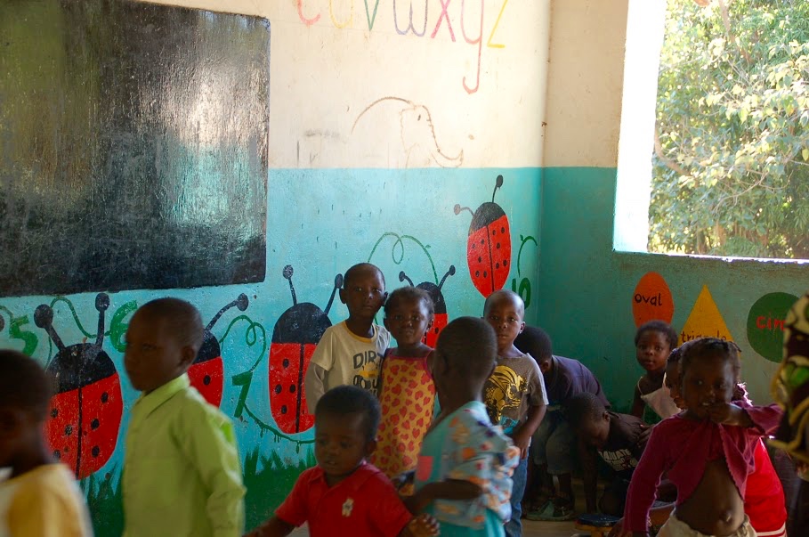 Inside the classroom, the walls help teach the alphabet, and counting with the lady bugs.   Another wall has animals and the months painted.