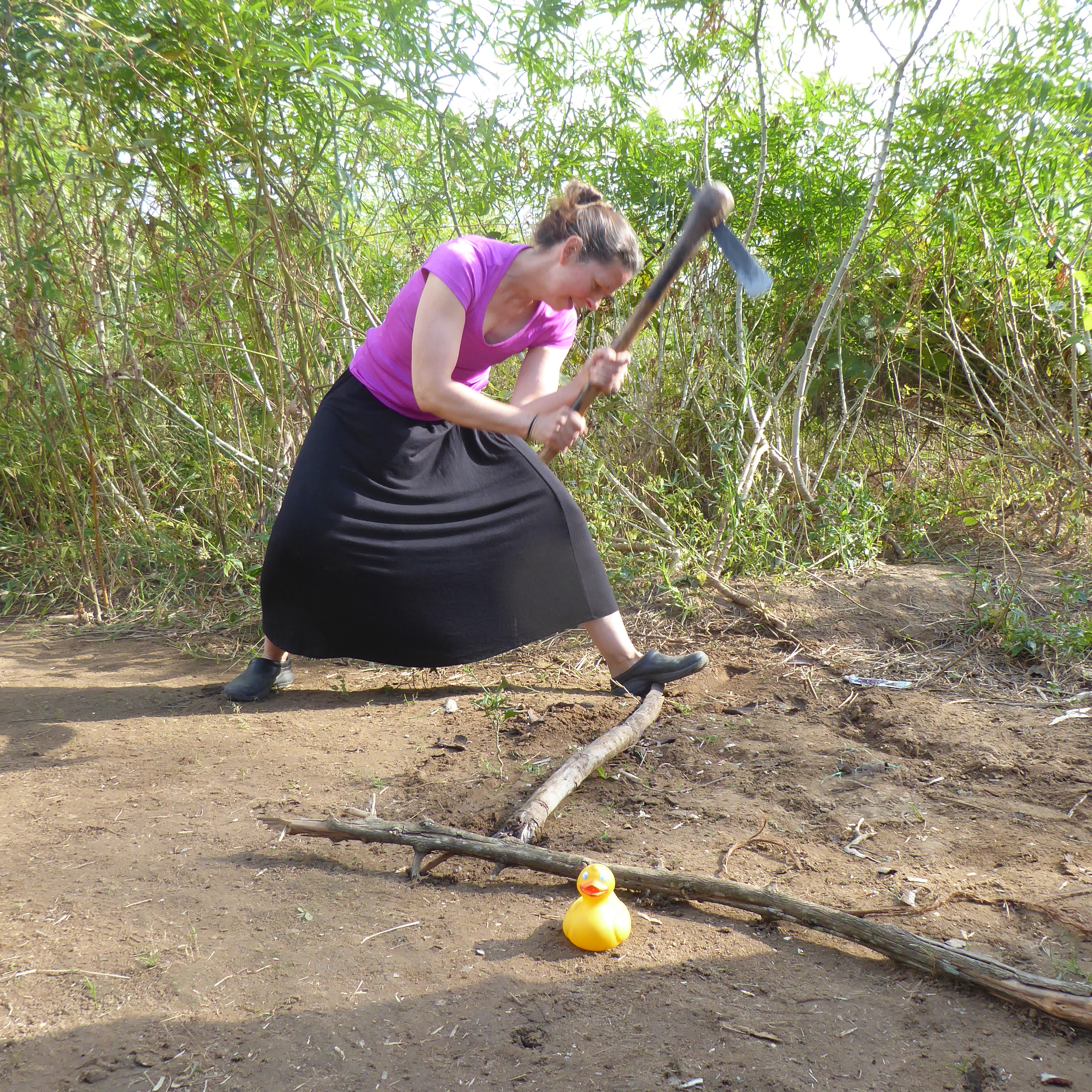 Linda is doing a great job.   Chopping wood is hard work.   Wood is needed every day for fires to cook and to heat water.   Red beans are cooking on the changu changu moto stove.