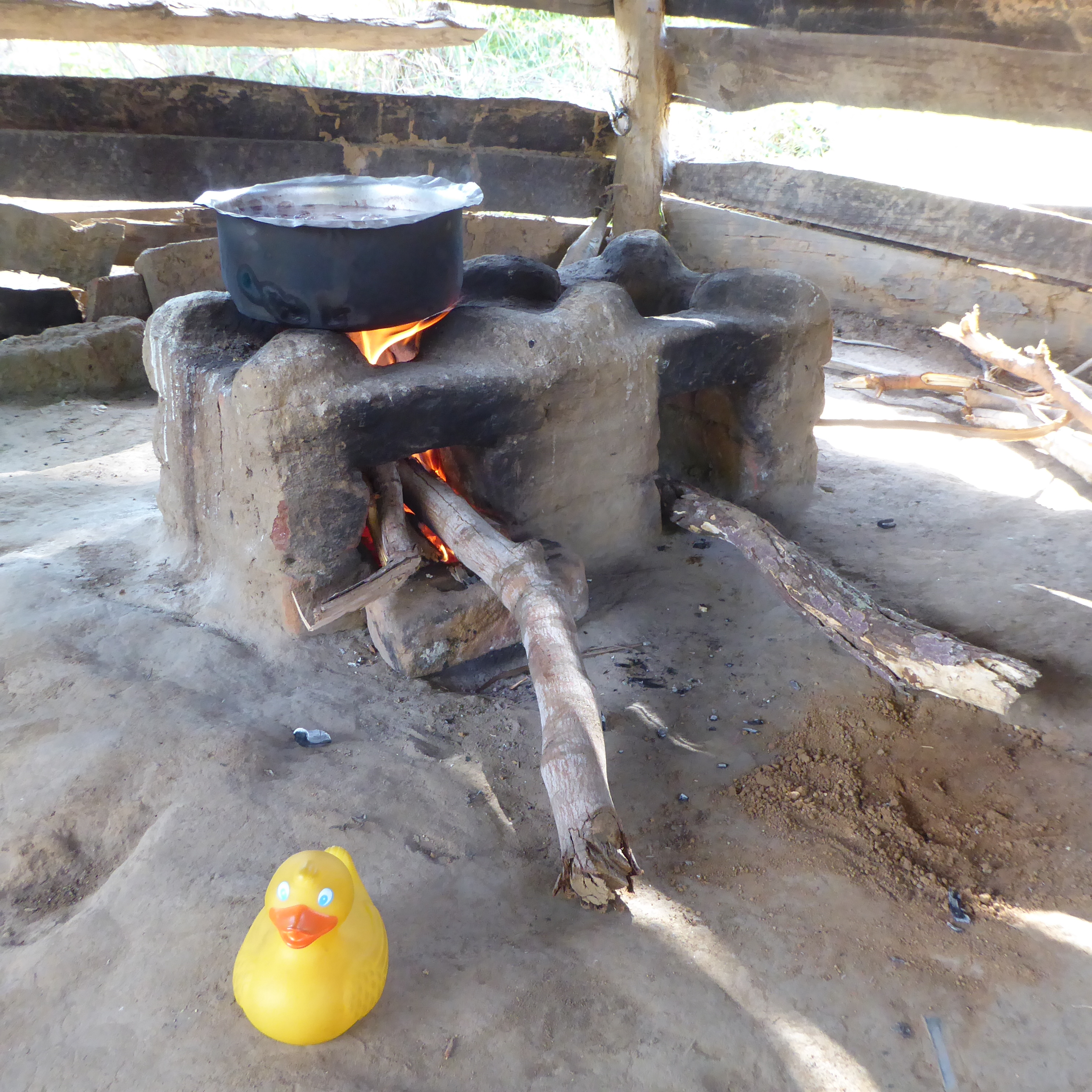 There is no electricity here, so our meals are cooked on a wood burning stove.   This is a 3 burner changu changu moto stove.