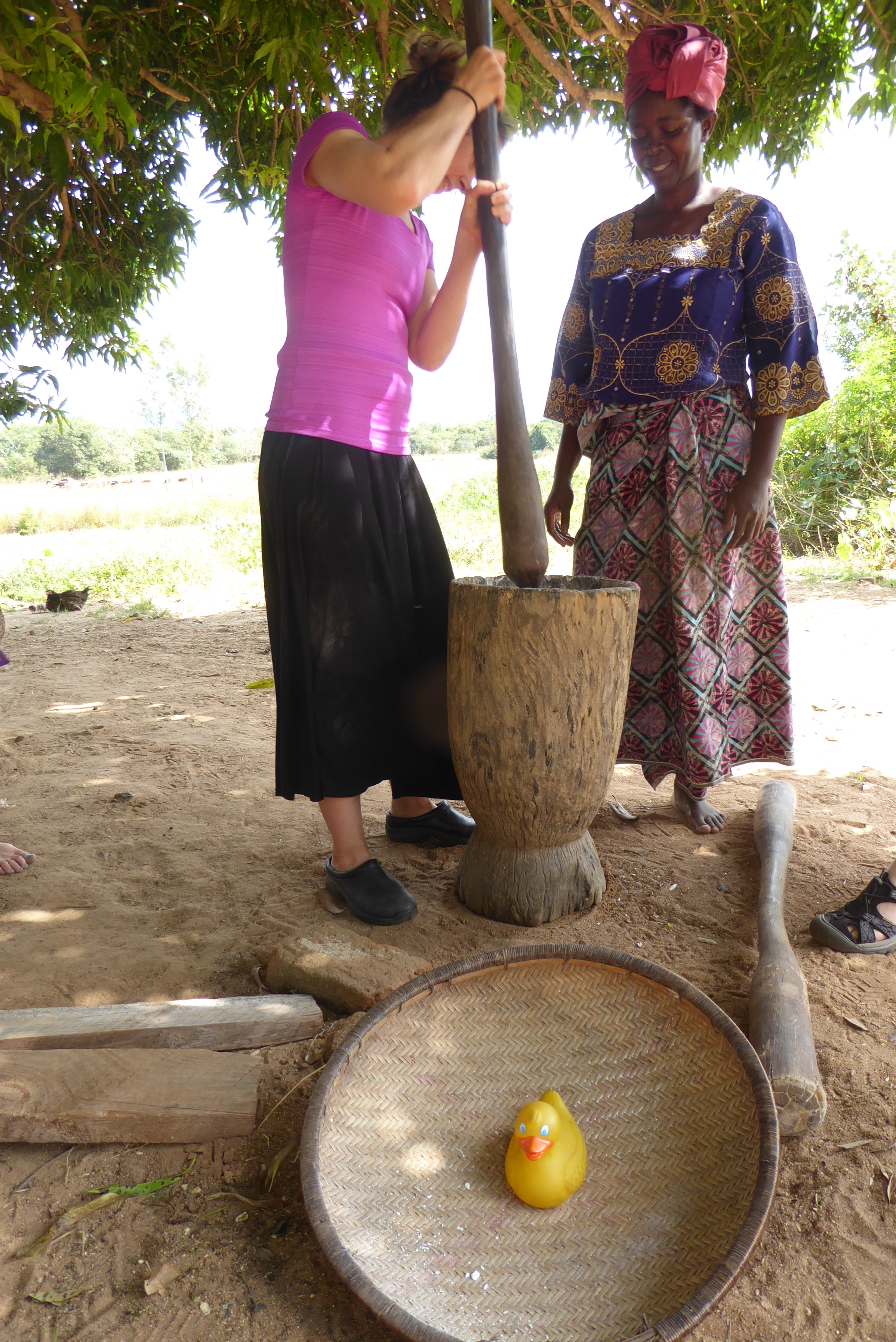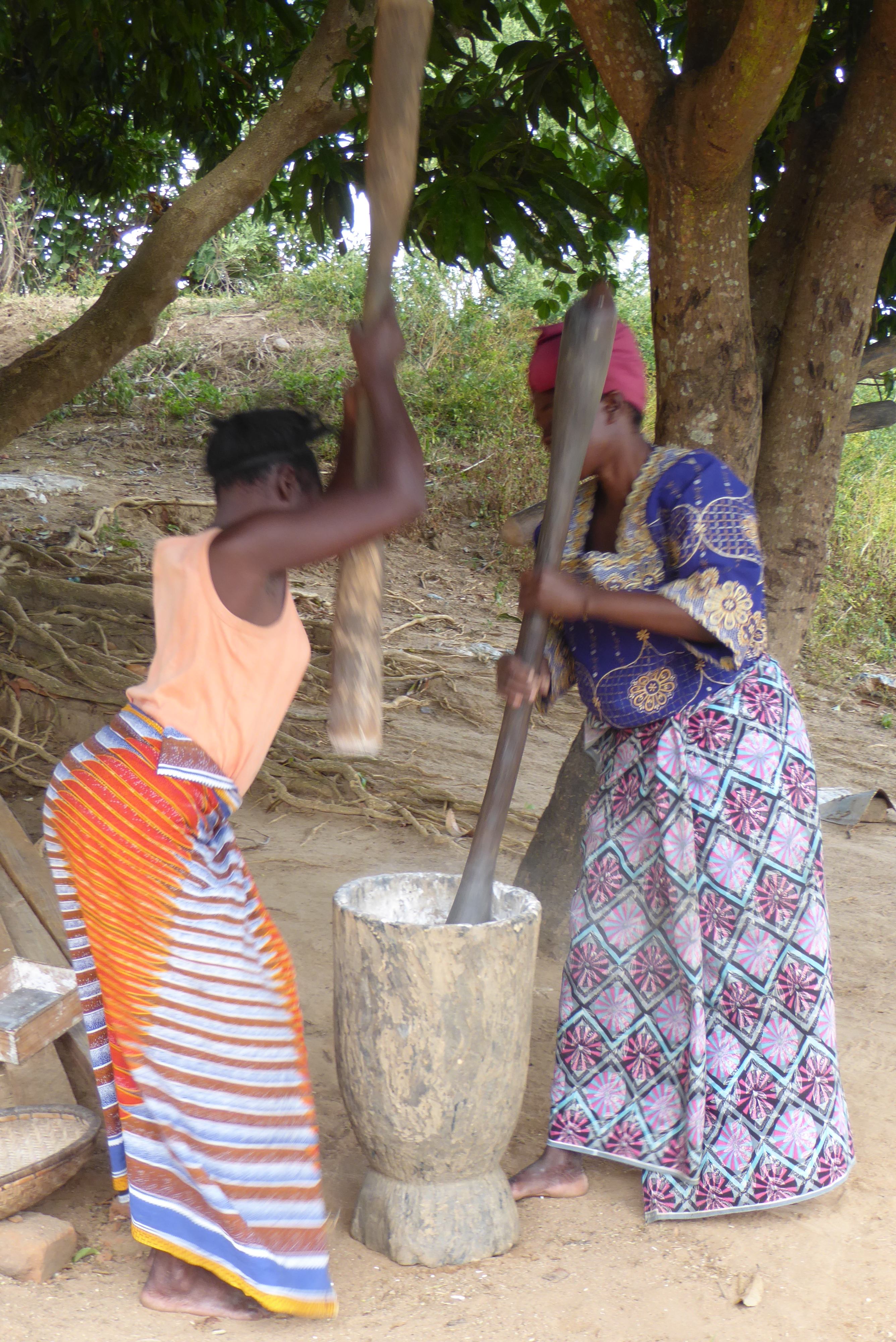 Rebecca and Catherine pound cassava together