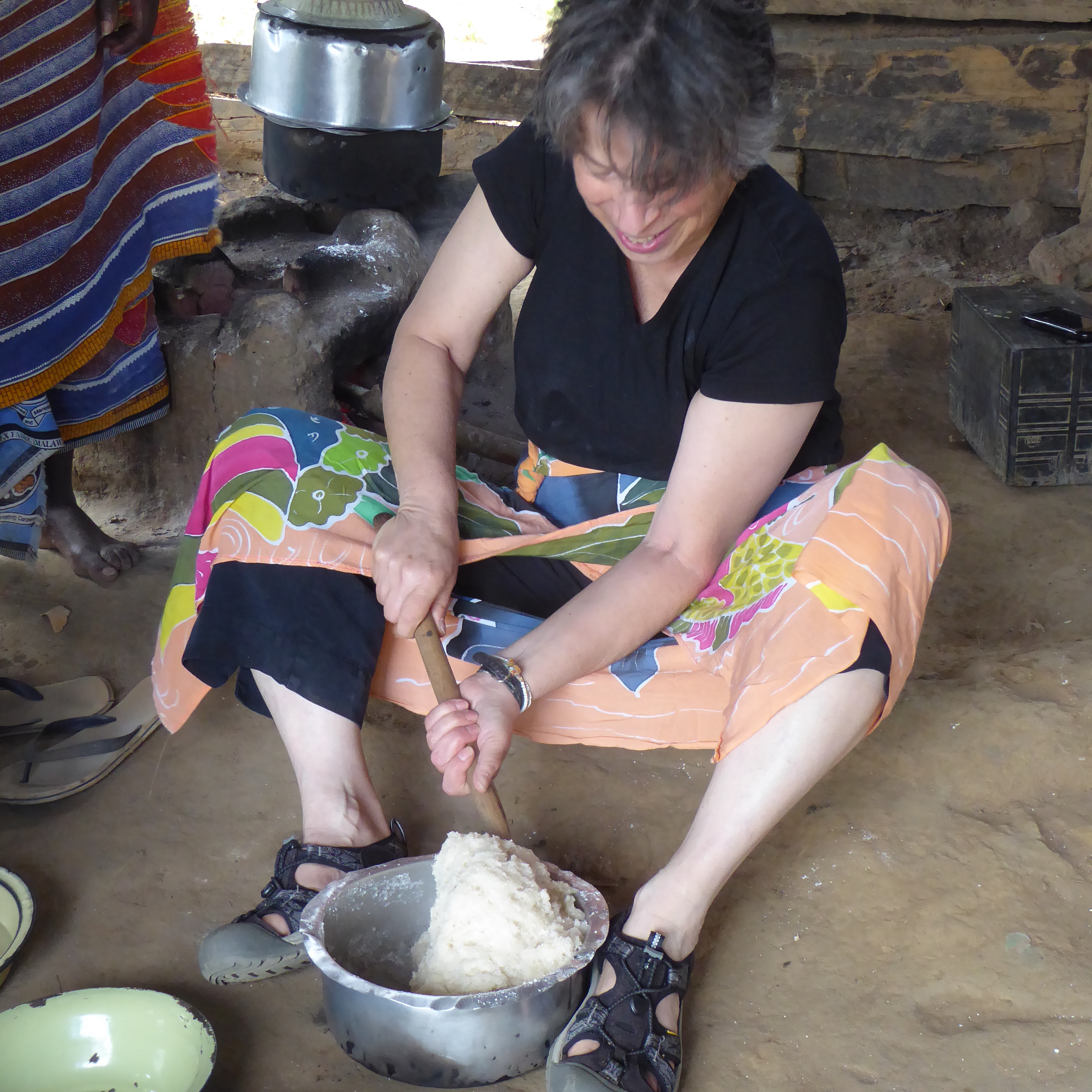 After cooking, the cassava is called nsima.  (The n in nsima is silent.   This food is pronounced seema)  The nsima is very stiff and difficult to stir.   Deborah is stirring the nsima now.