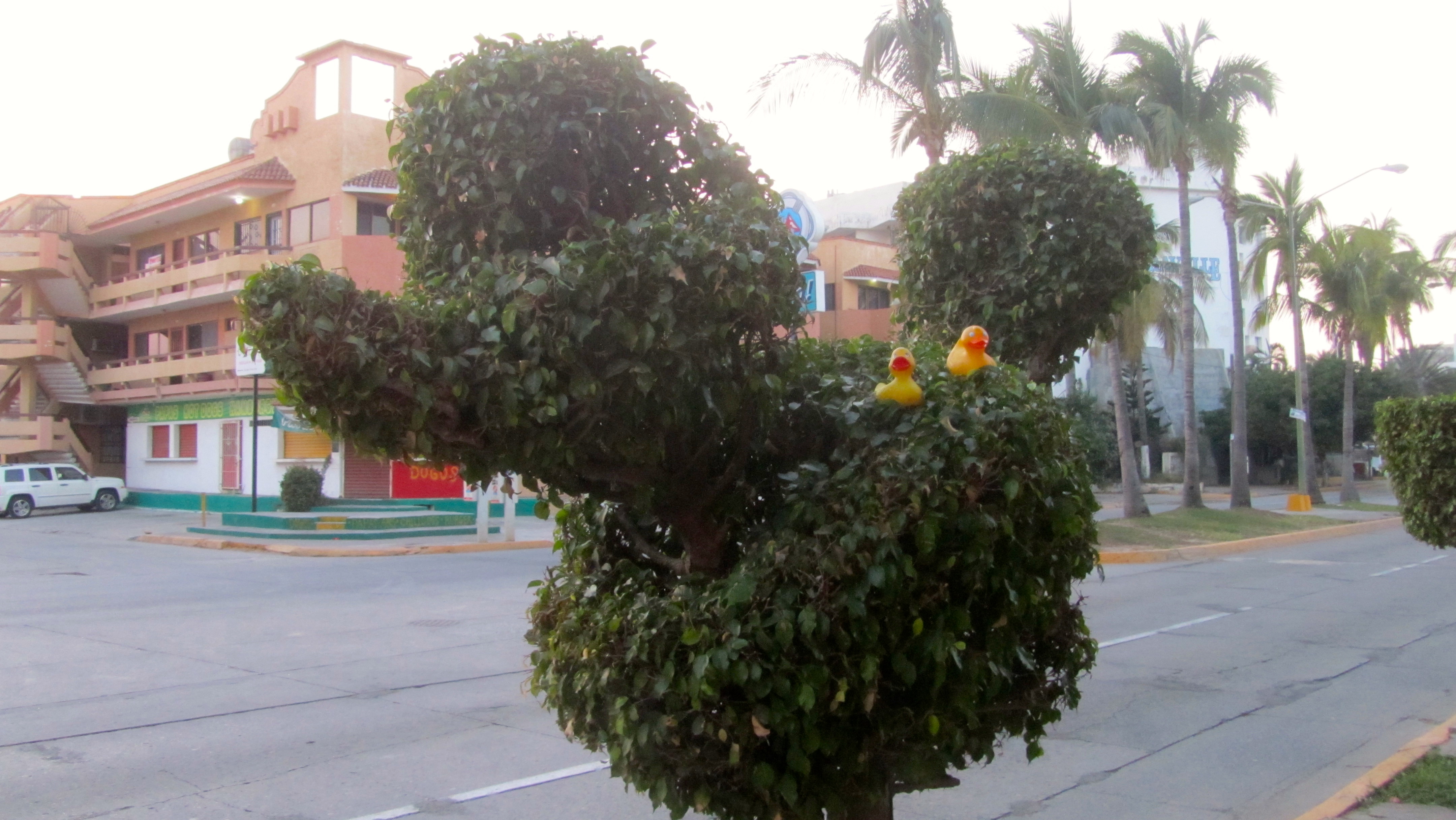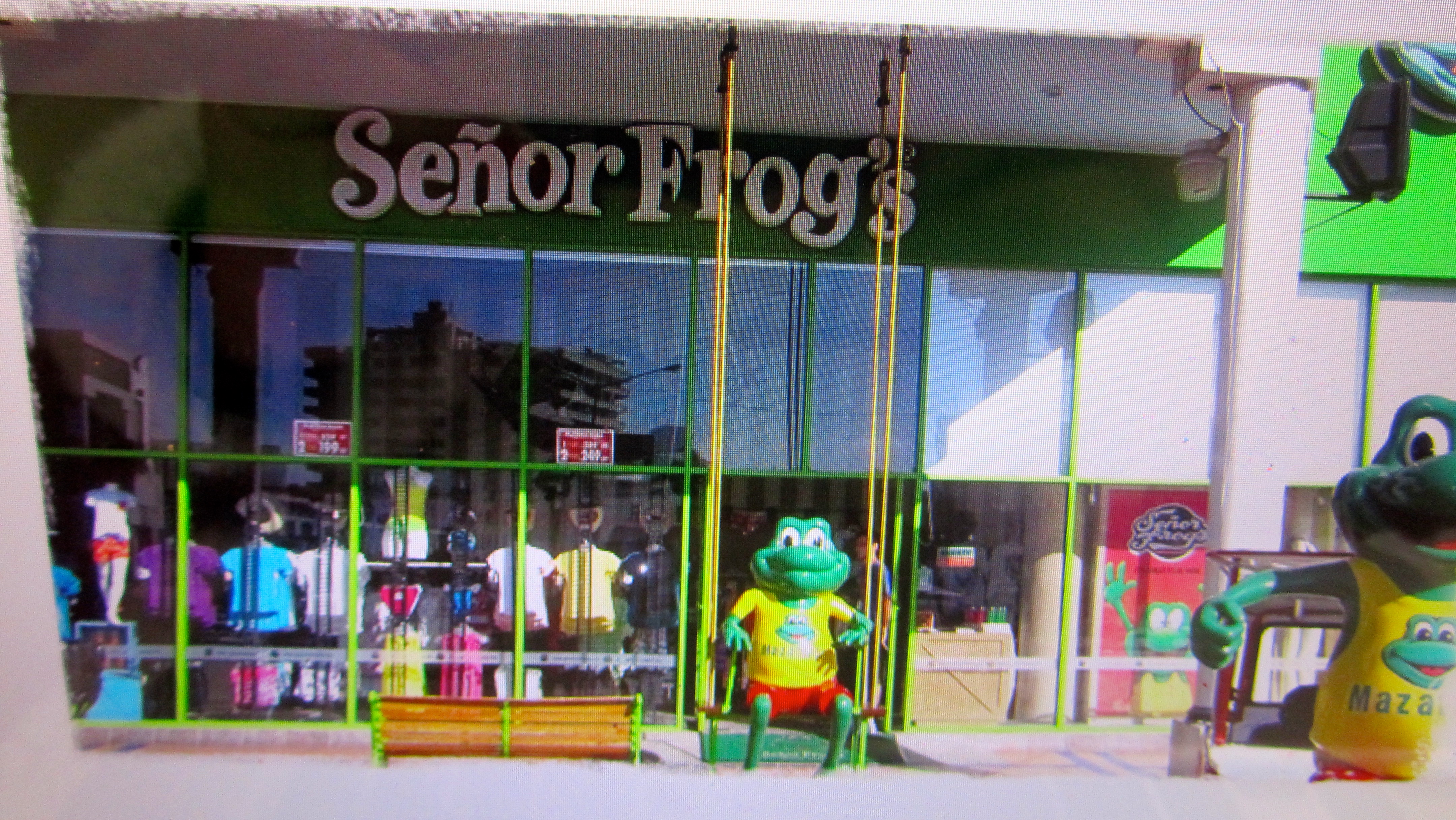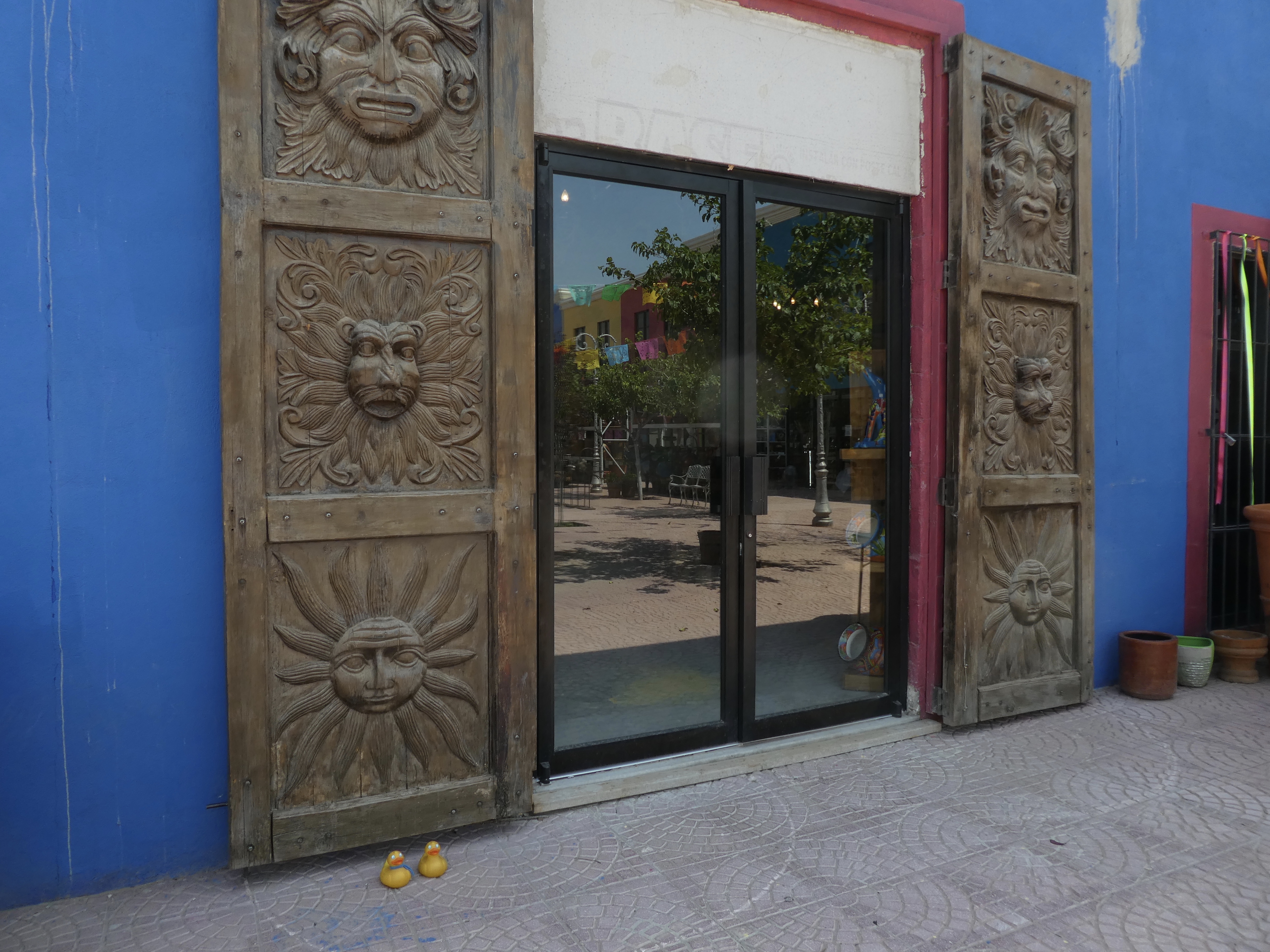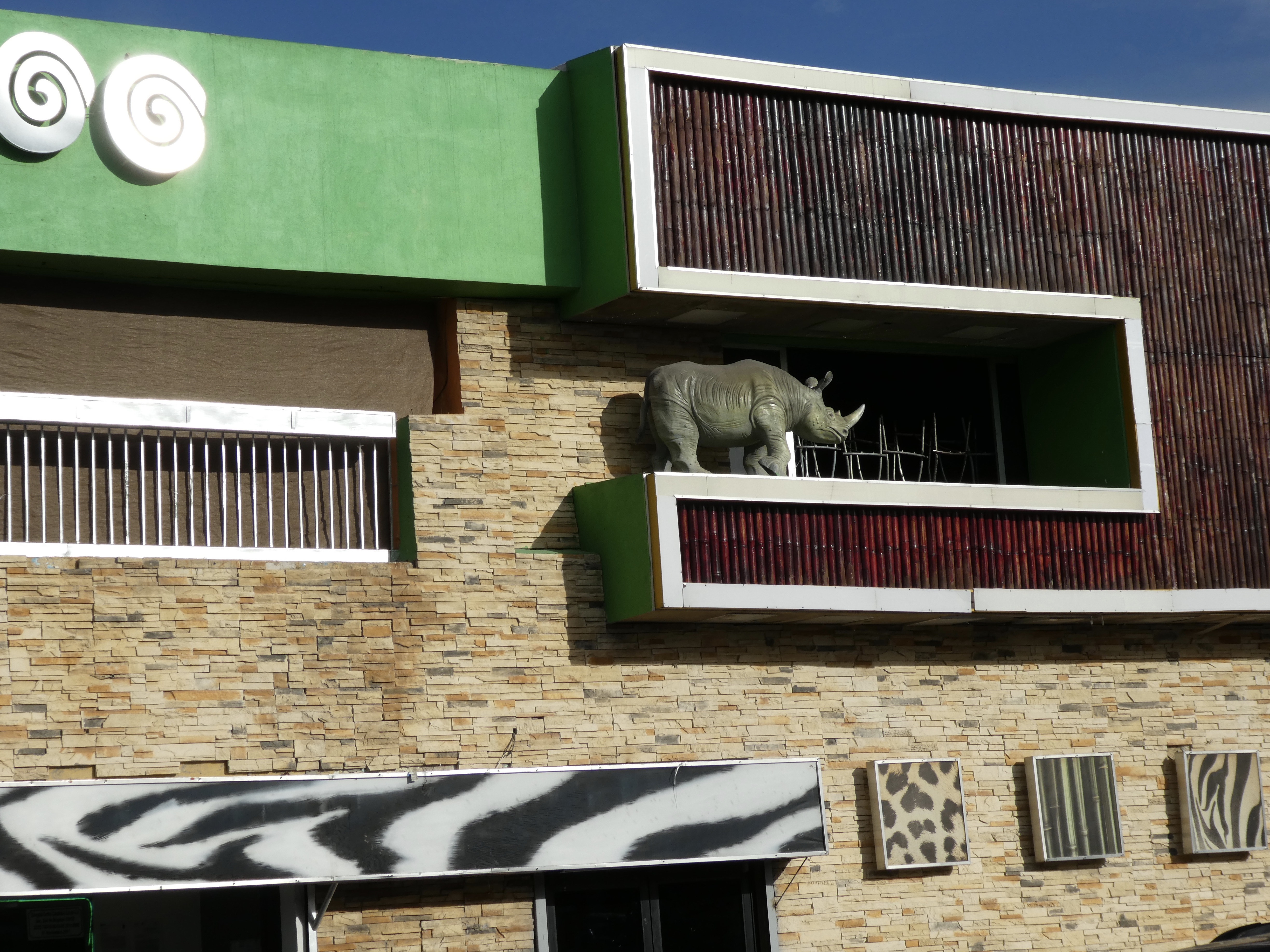 It is not often we see a statue of a rhinoceros on a patio. We could not go inside the building with Chloe, so we are not sure what that was about. US dollars can be exchanged for Mexican pesos.