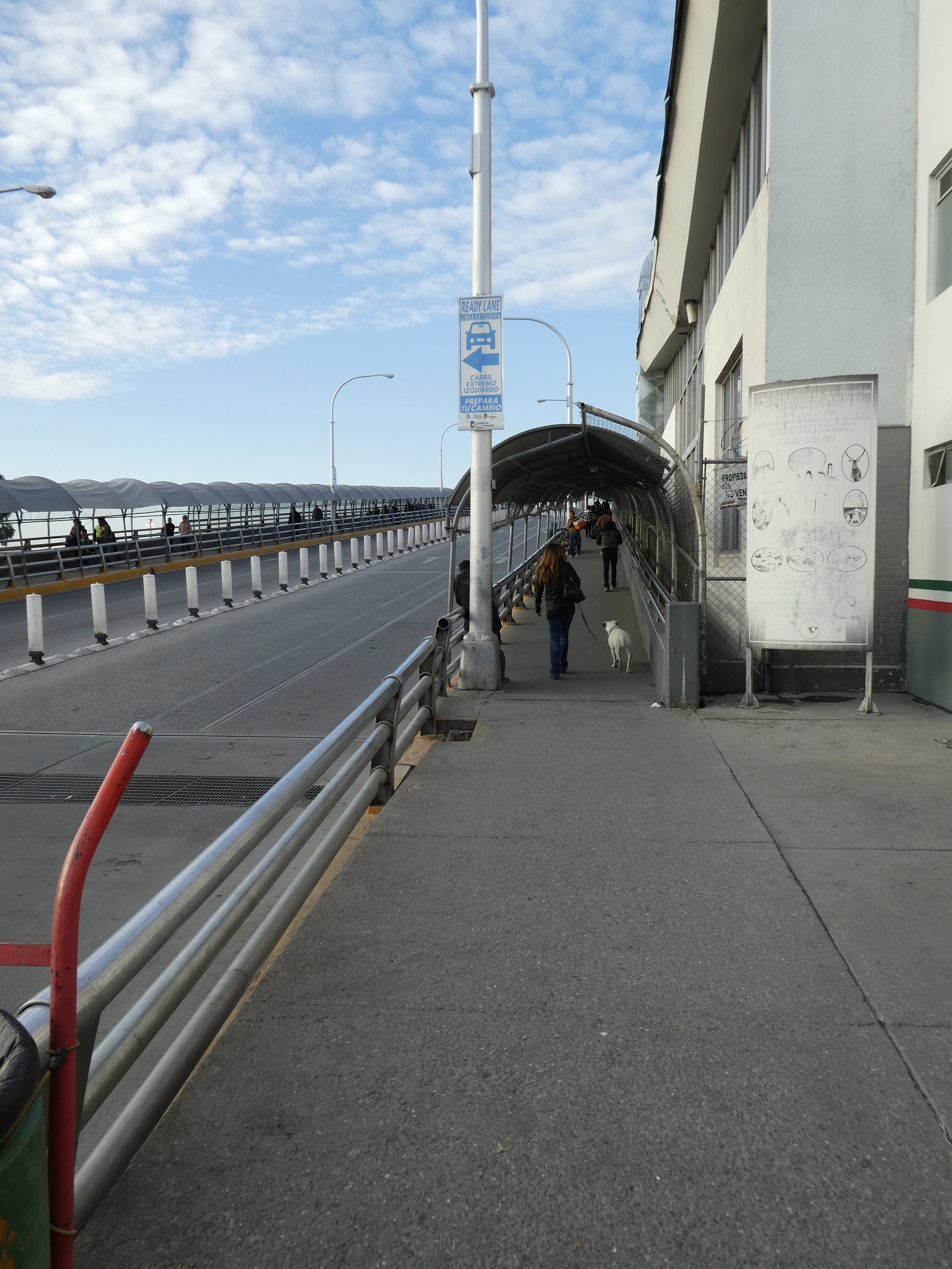 We wanted 3 tacos, but we got 3 orders of tacos, about 12. We ate a lot and gave some tacos to people on the street. The tacos were delicious. And a little messy. The humans decided Chloe had been here long enough, so we started back across the bridge to El Paso, Texas, USA.