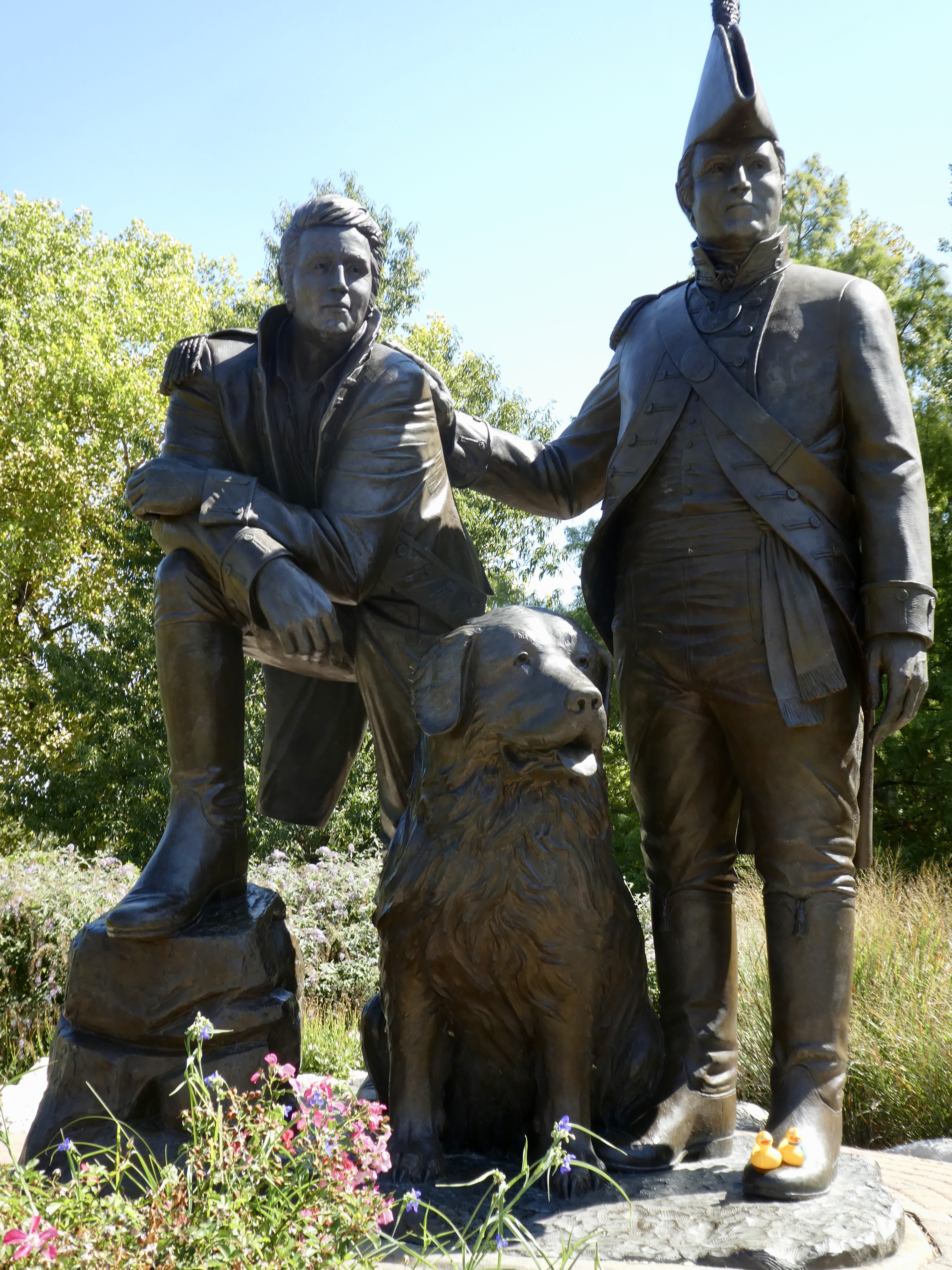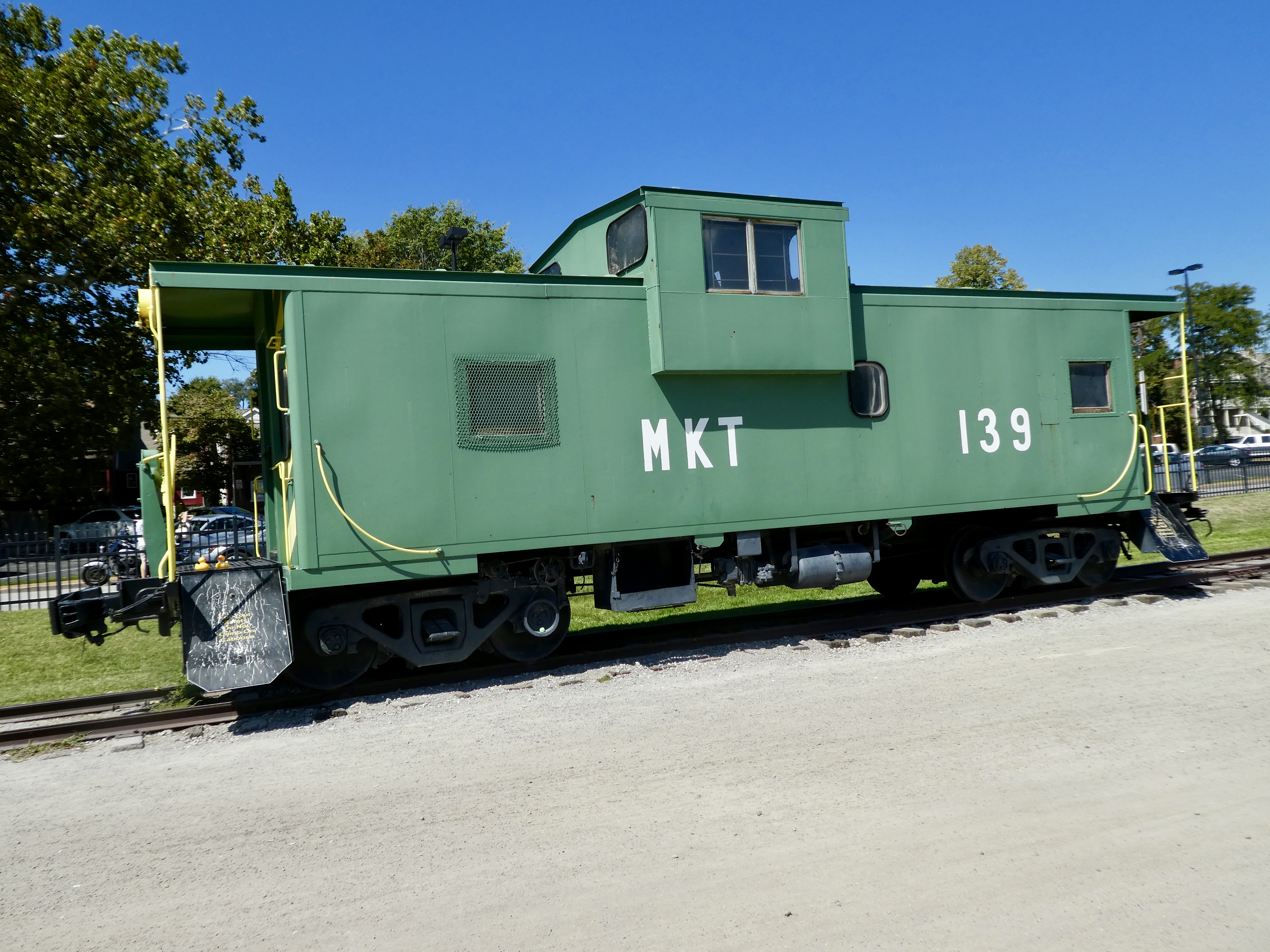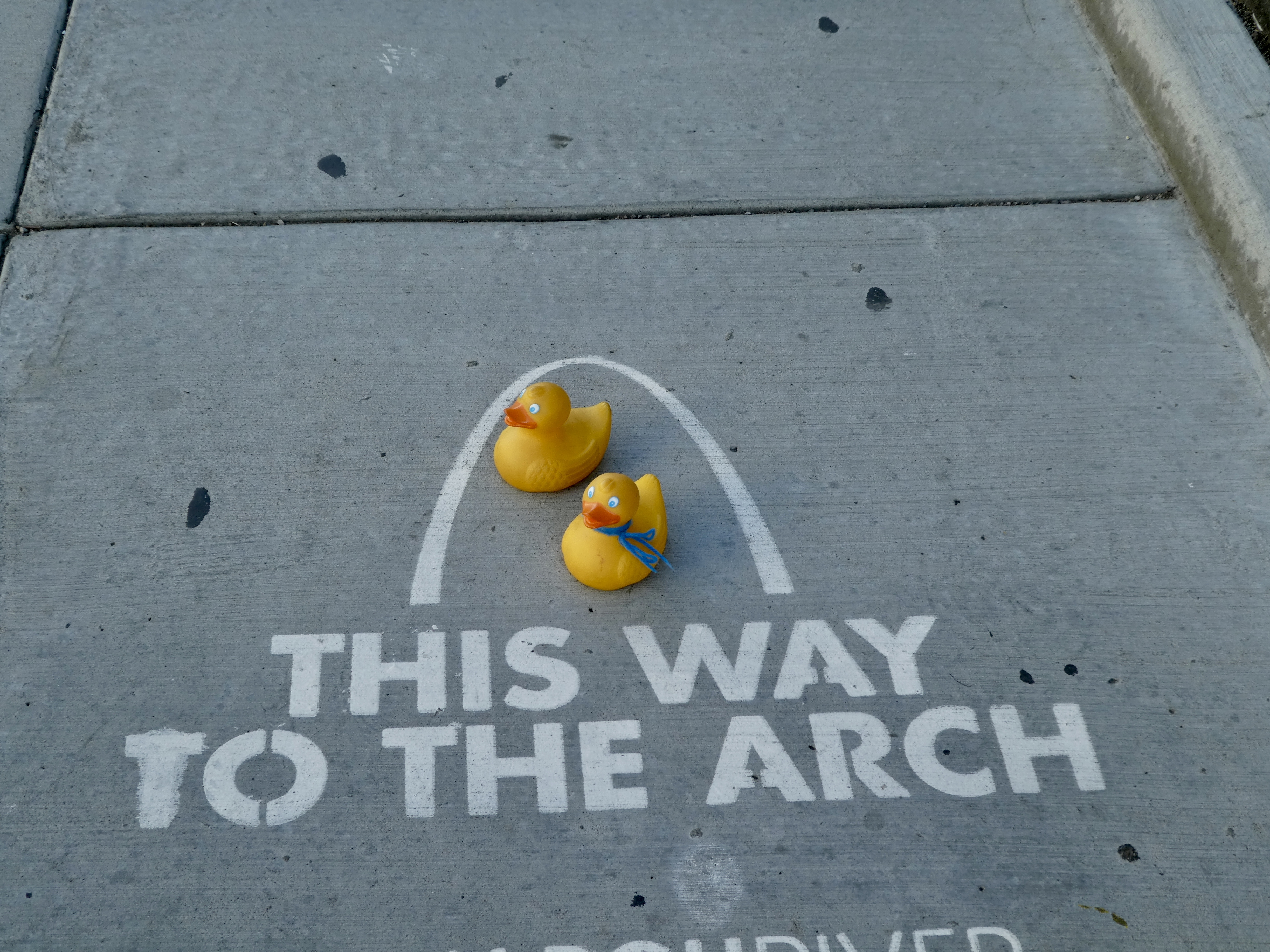 That is a big arch! The Gateway Arch is 630 feet tall, compared to the Washington Monument at 555 feet. The arch has a stainless steel skin and glimmers in the sunshine. Before we ducks joined the family our moms went inside the arch to the observation area. There is a tram in each leg of the arch to go to the top. With 8 cylindrical 5 seat compartments with a small window in each compartment, 40 humans ascend at a time from each side. The cars, or compartments, swing like Ferris wheel cars, half Ferris wheel and half elevator, it takes 4 minutes to arrive at the top. At the top observation area each side has 16 windows, 7″ x 27″ (180 mm x 690 mm). Through these small windows, you can see up to 30 miles (48 km) into Missouri and southern Illinois. We did not go inside the arch this time. Near the arch, we saw Harry.
