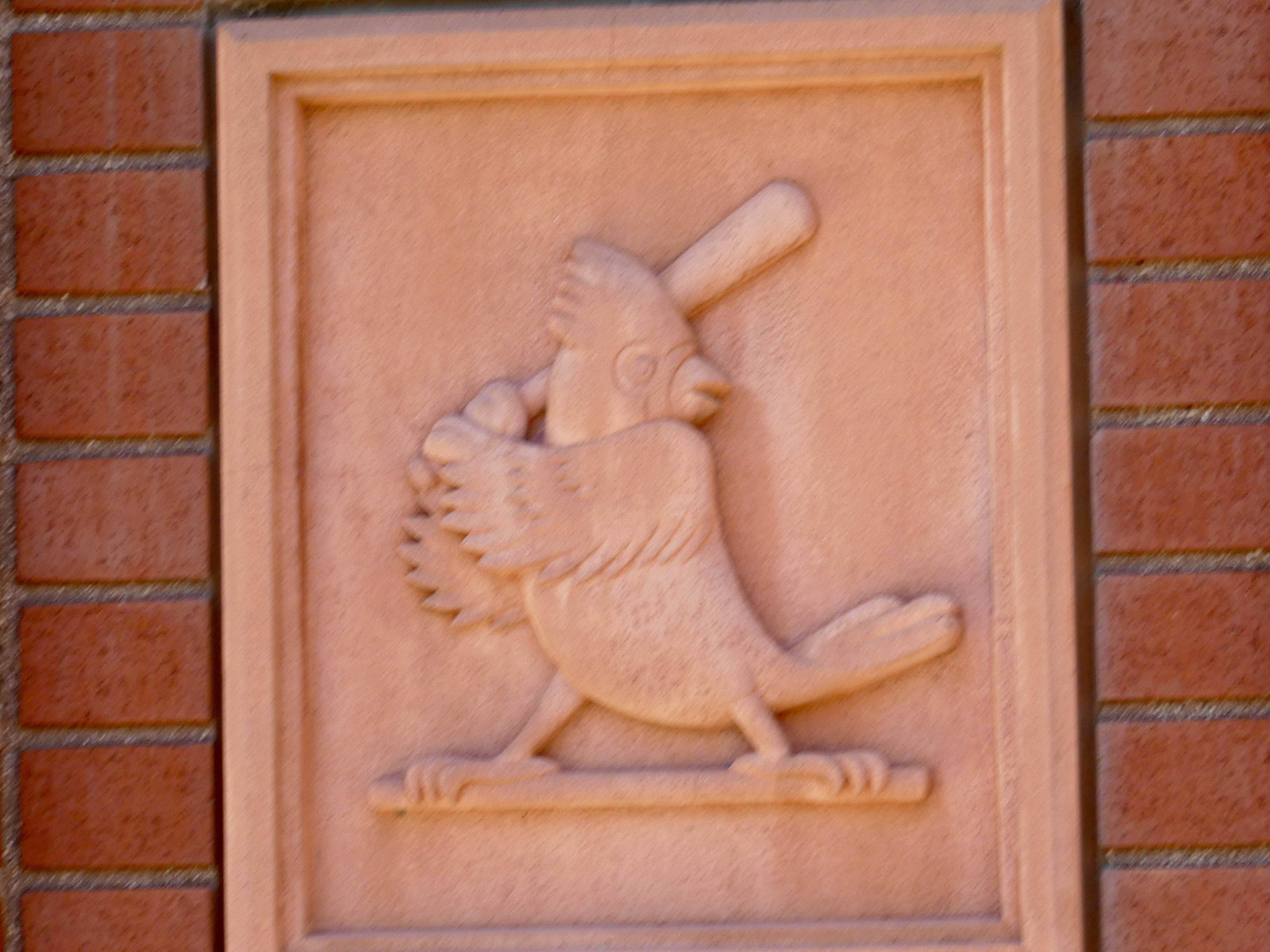 This was an exciting game. The St. Louis Cardinals beat the Pittsburg Pirates 7-0. Lots of action in this game and the crowd was happy and cheering as their favorite hometown team continued to score. The game ended and as we left our seats, we noticed the cardinal on the end of each row of seats.