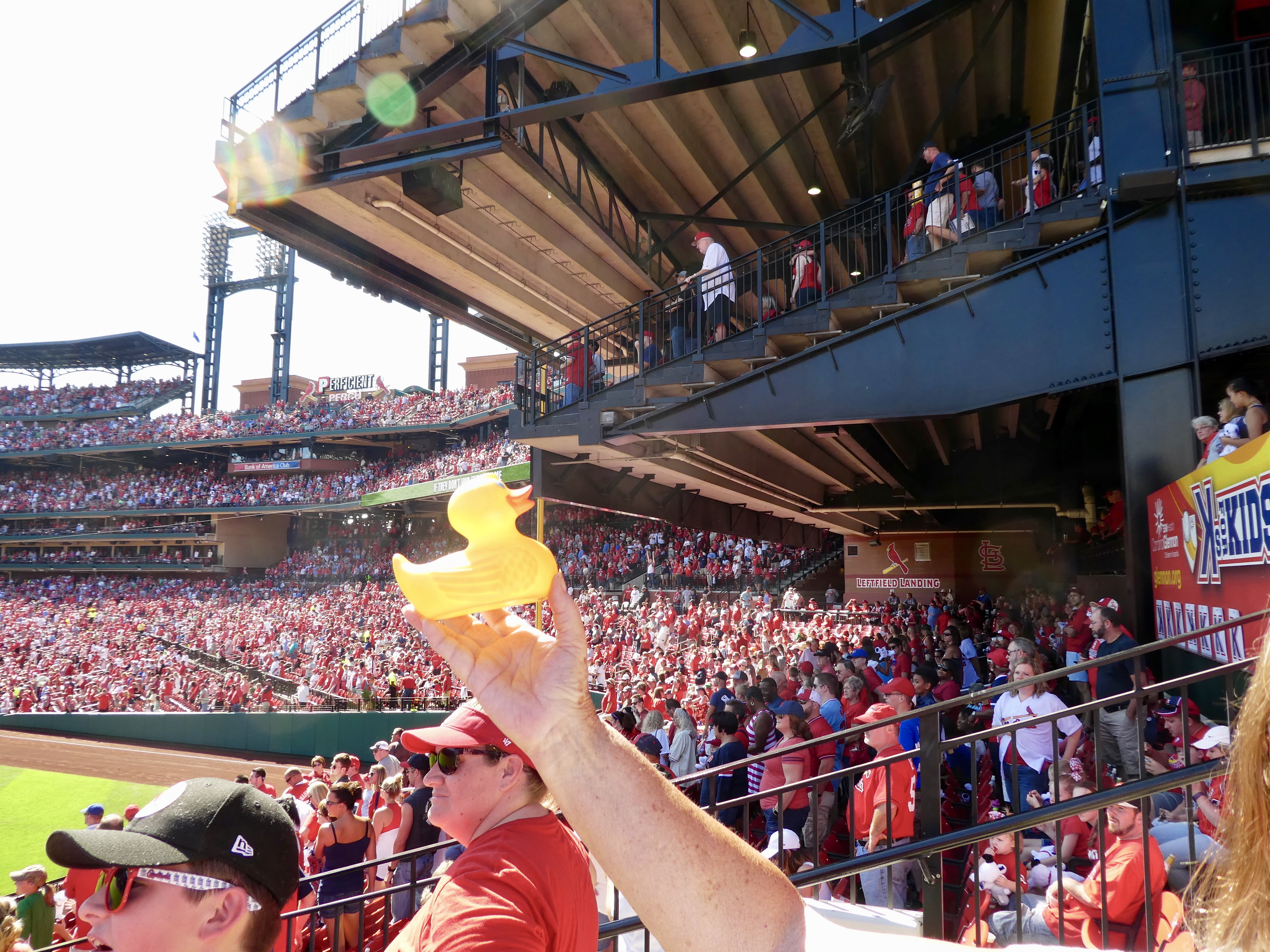 The Cardinals have won many World Series of Baseball and the fans are very loyal. Then we heard fireworks. A man on the street said that means someone hit a home run. Well, what are ducks and moms to do? We bought tickets, went into the stadium, found our seats and then bought hot dogs. For a last minute idea, we had pretty good seats.