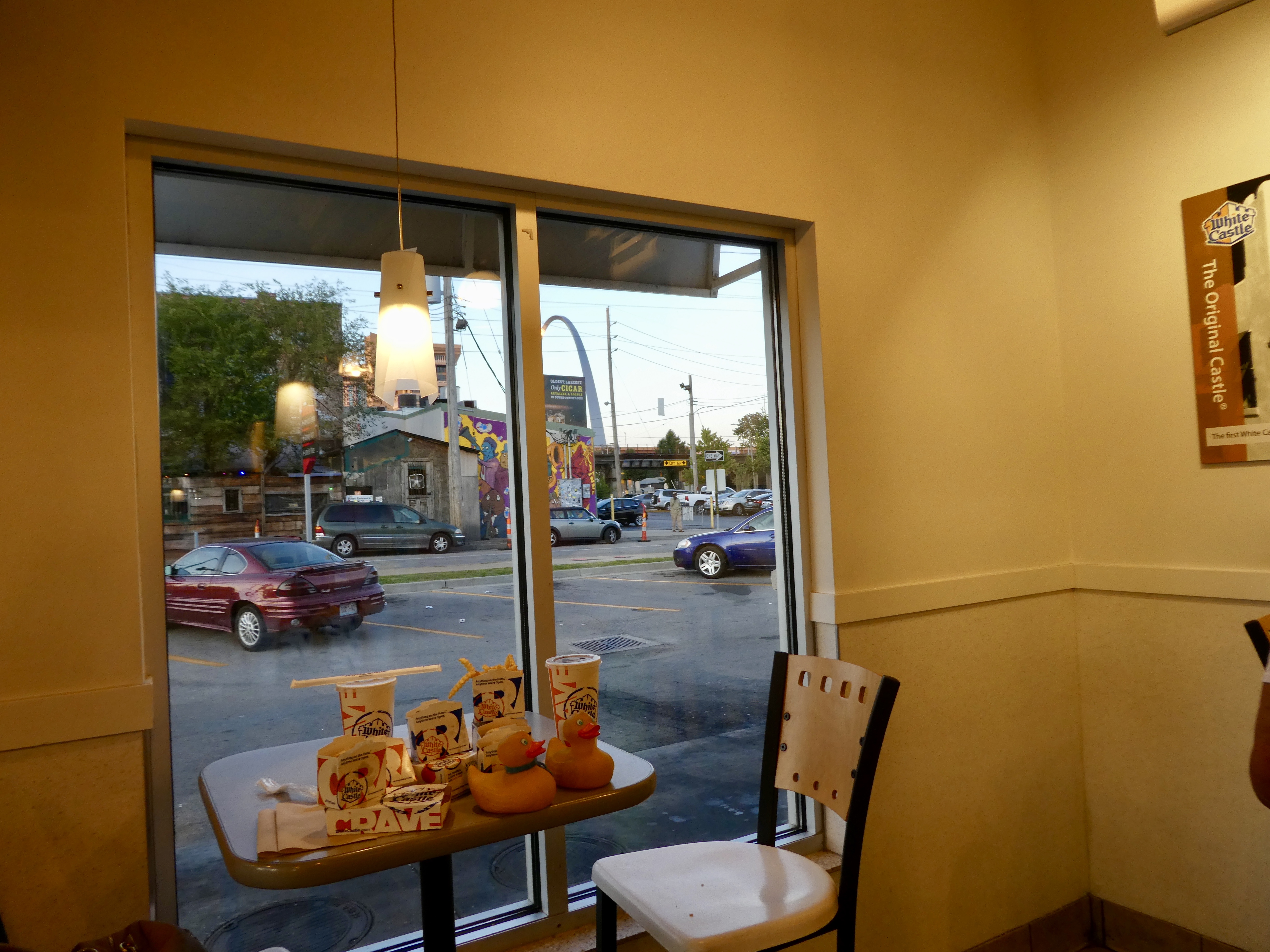 Looking through the window of White Castle, we liked seeing the Gateway Arch. We enjoyed our time in St. Louis.