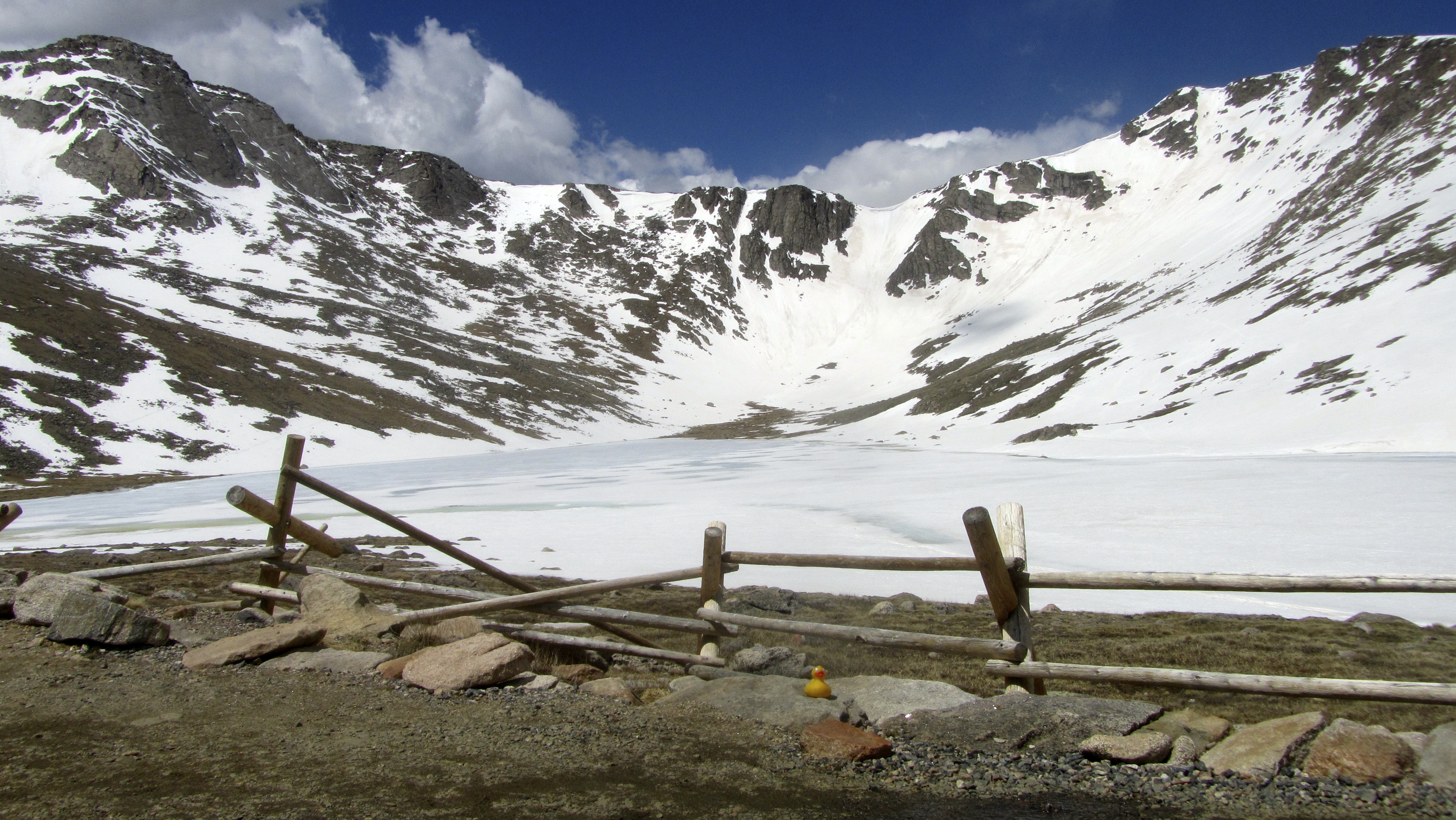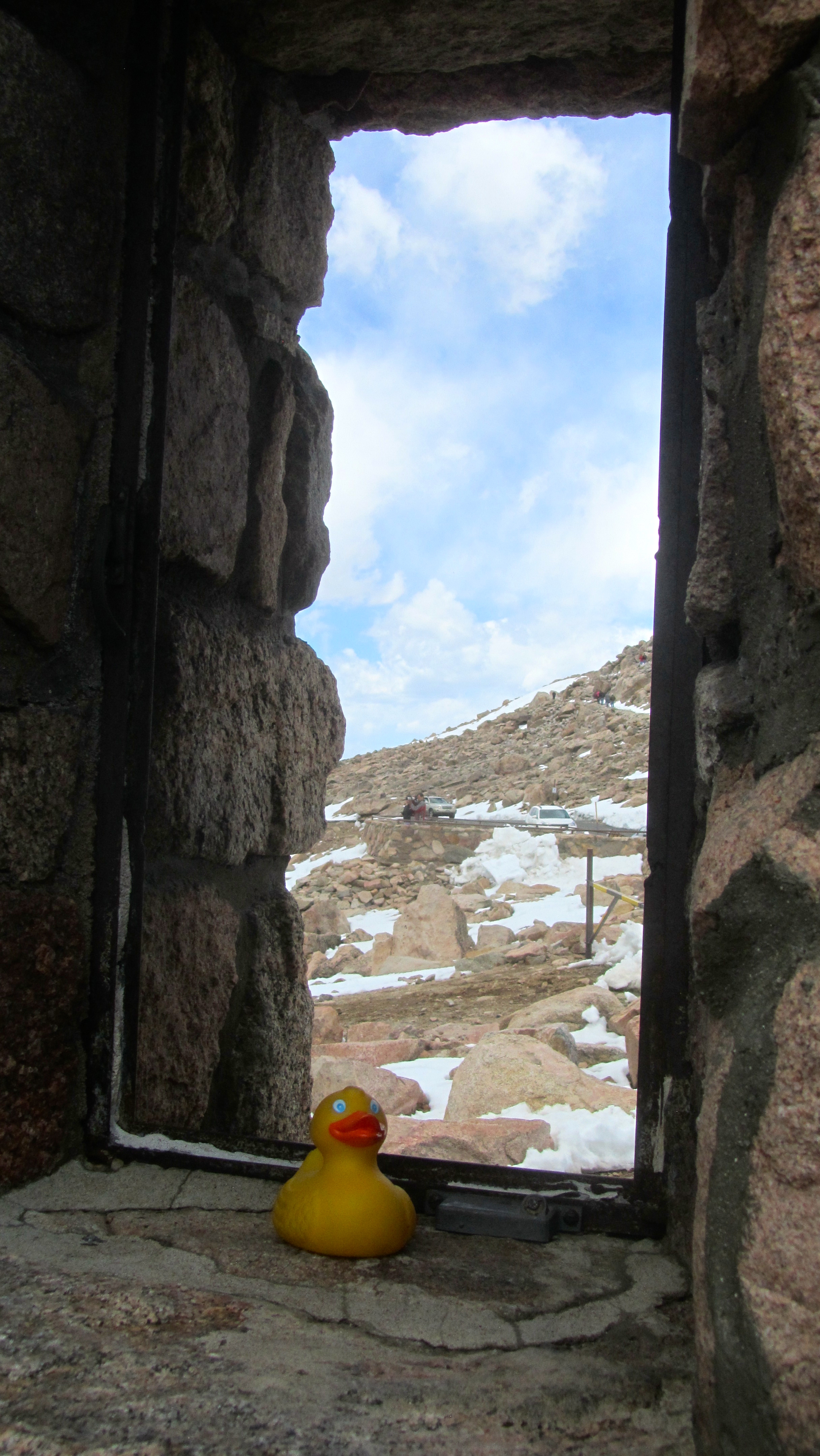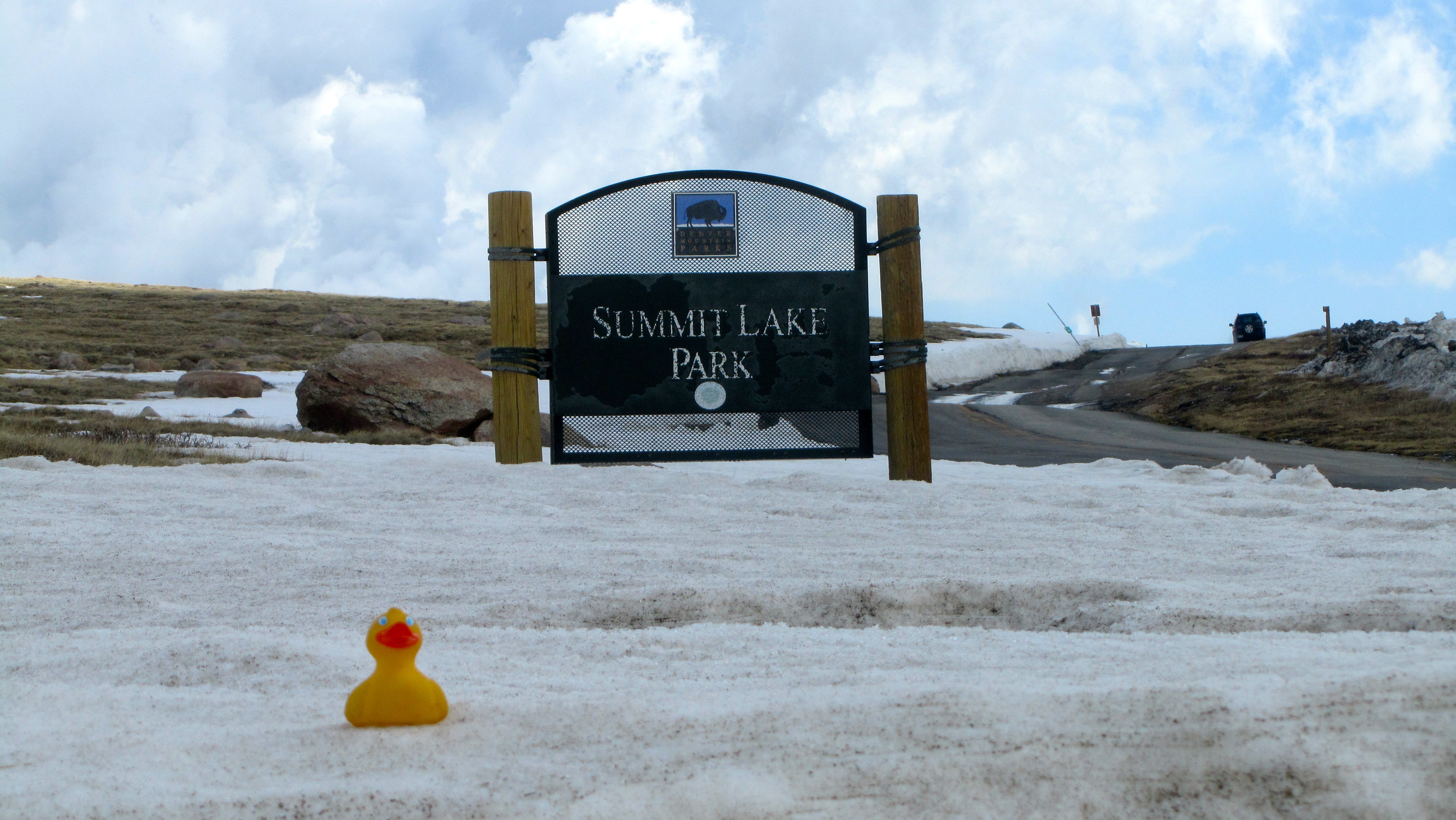 I, Zeb the Duck, went high in Colorado’s Rocky Mountains. Mom and I drove the highest paved road in North America to the top of Mount Evans. Elevation in the parking lot at the top is 14,130 feet above sea level. That is very high and not so much oxygen in the air. When you go, be careful!