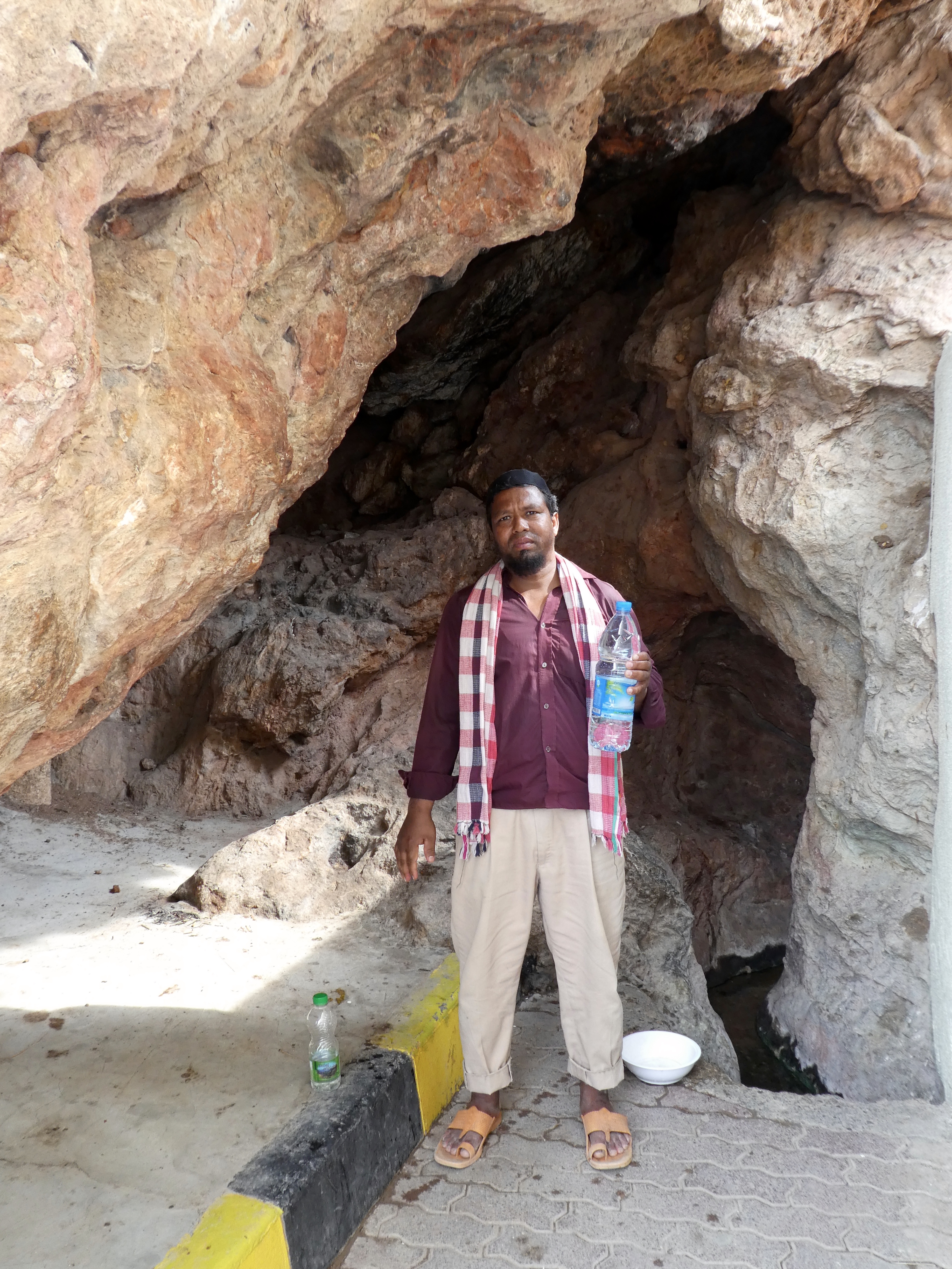 Inside the mosque is the second largest hand knotted carpet in the world.   This carpet, 70 meters by 60 meters, took 600 women 4 years to complete.   The large chandelier, 14 meters tall and weighing 8.5 tonnes is inside also.   The carpet and chandelier were the largest in the world when completed, but now the largest carpet and chandelier are in Abu Dhabi.   We showed you pictures inside that mosque in February.    Near the Grand Mosque our guide took us to the magic water.   The water from the mountains flows into the cave.