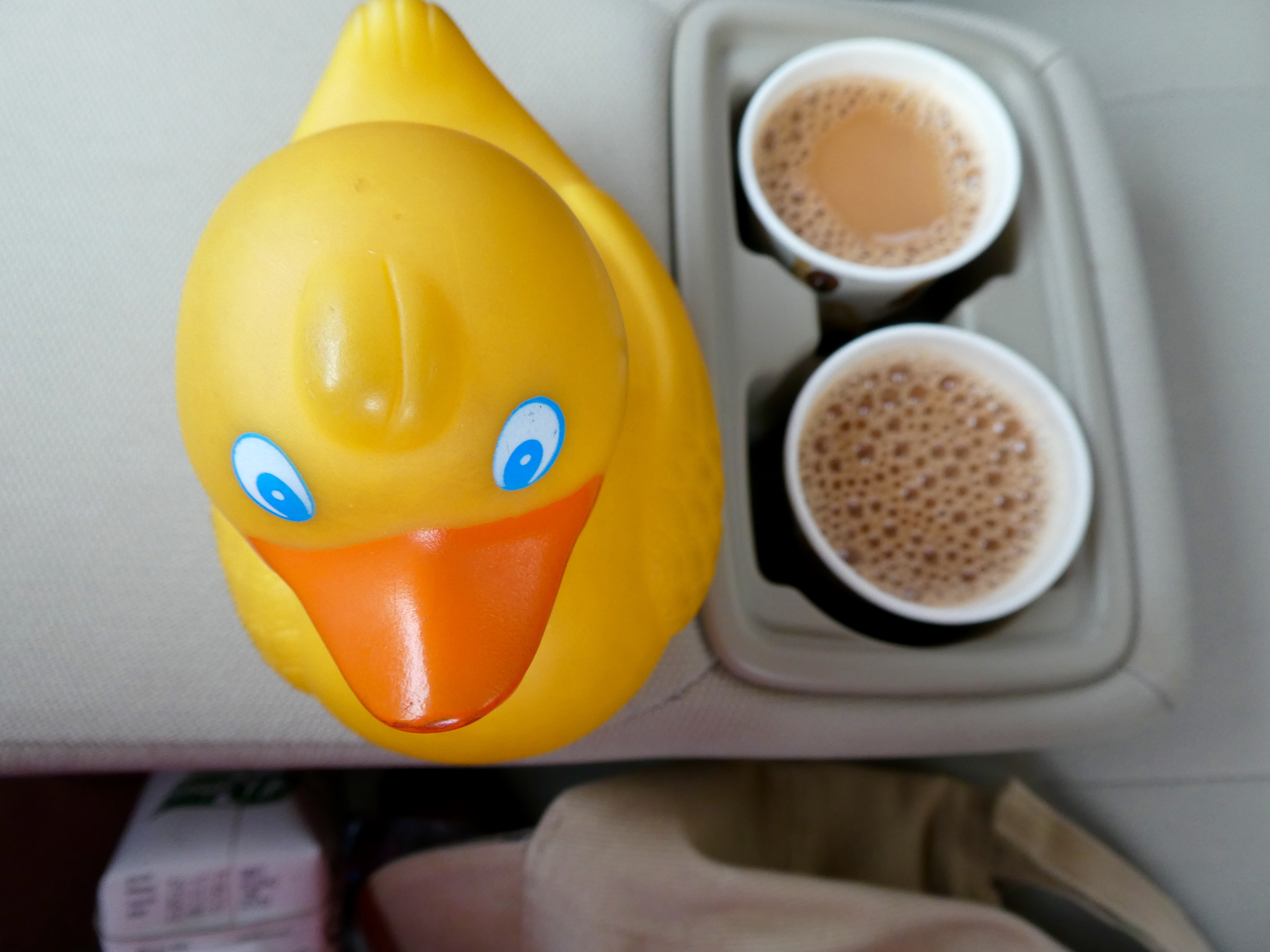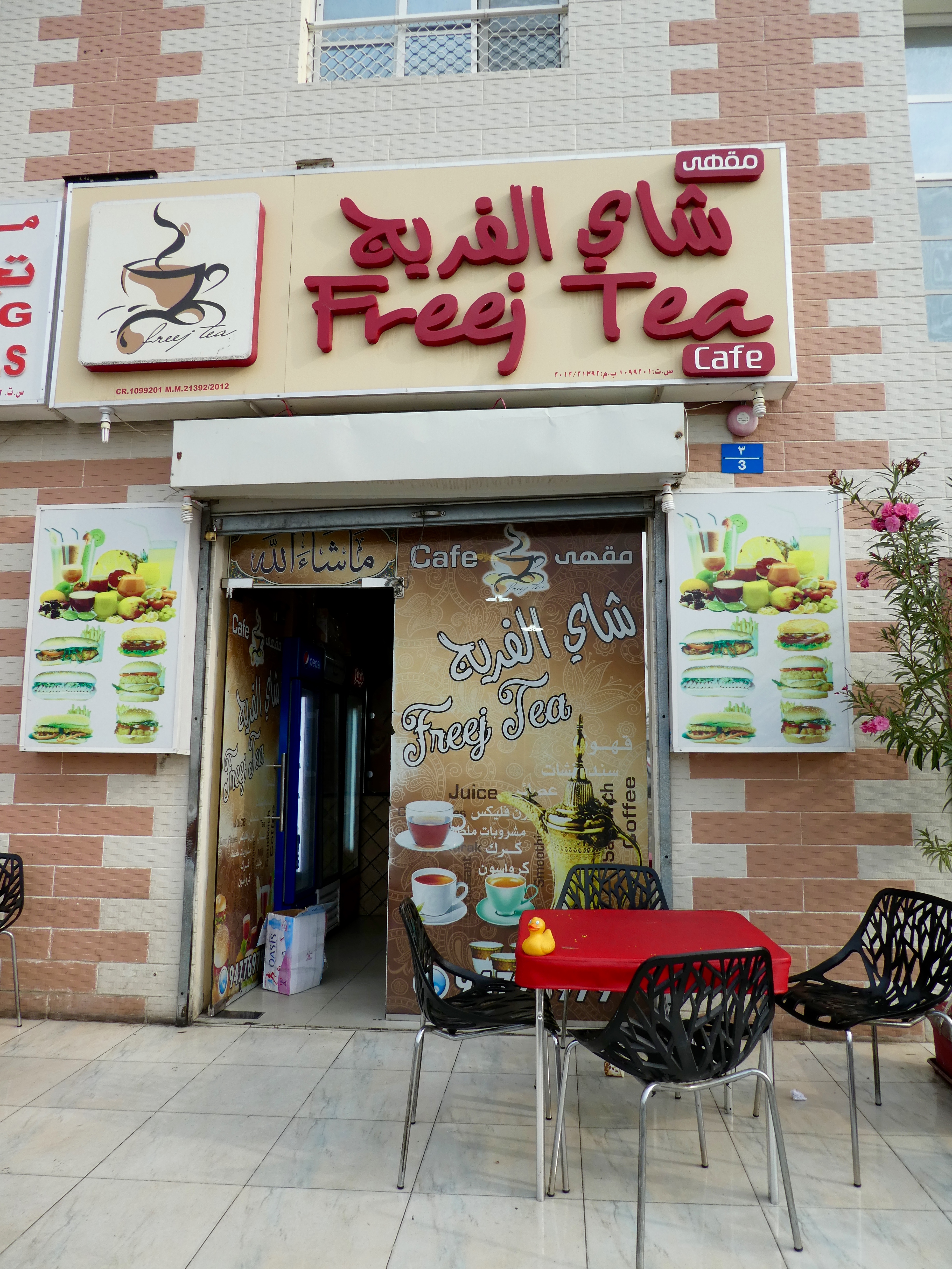 The opera house complex features a concert theater, an auditorium, formal landscaped gardens, a cultural market with retail space, an art center, luxury restaurants and a large parking garage.   This complex was built following the Royal Orders of Sultan Qaboos of Oman. These beautiful buildings, all making us feel very peaceful, can make this duck, a small bear and 3 humans hungry.   Our guide drives us to the cafe.
