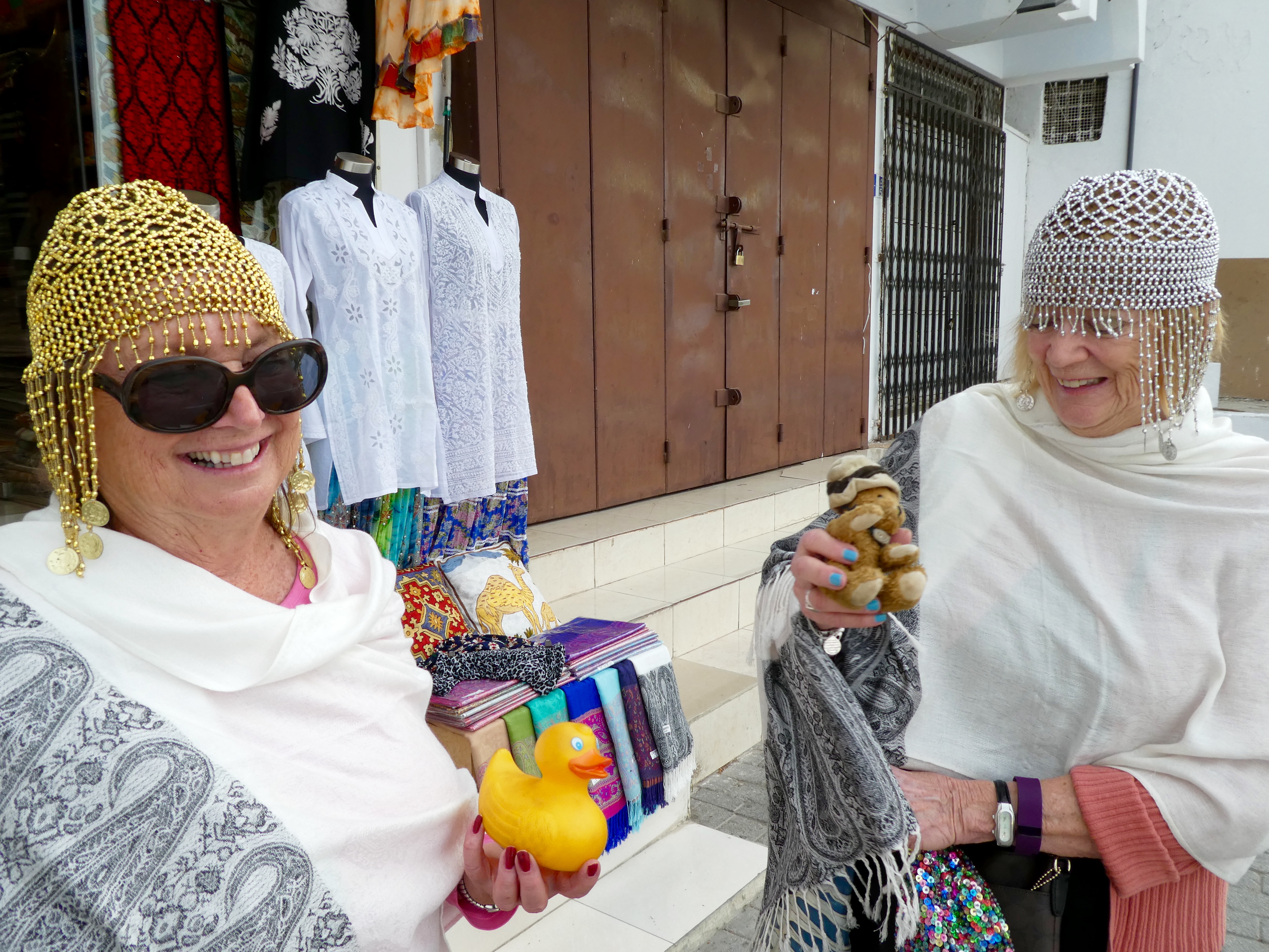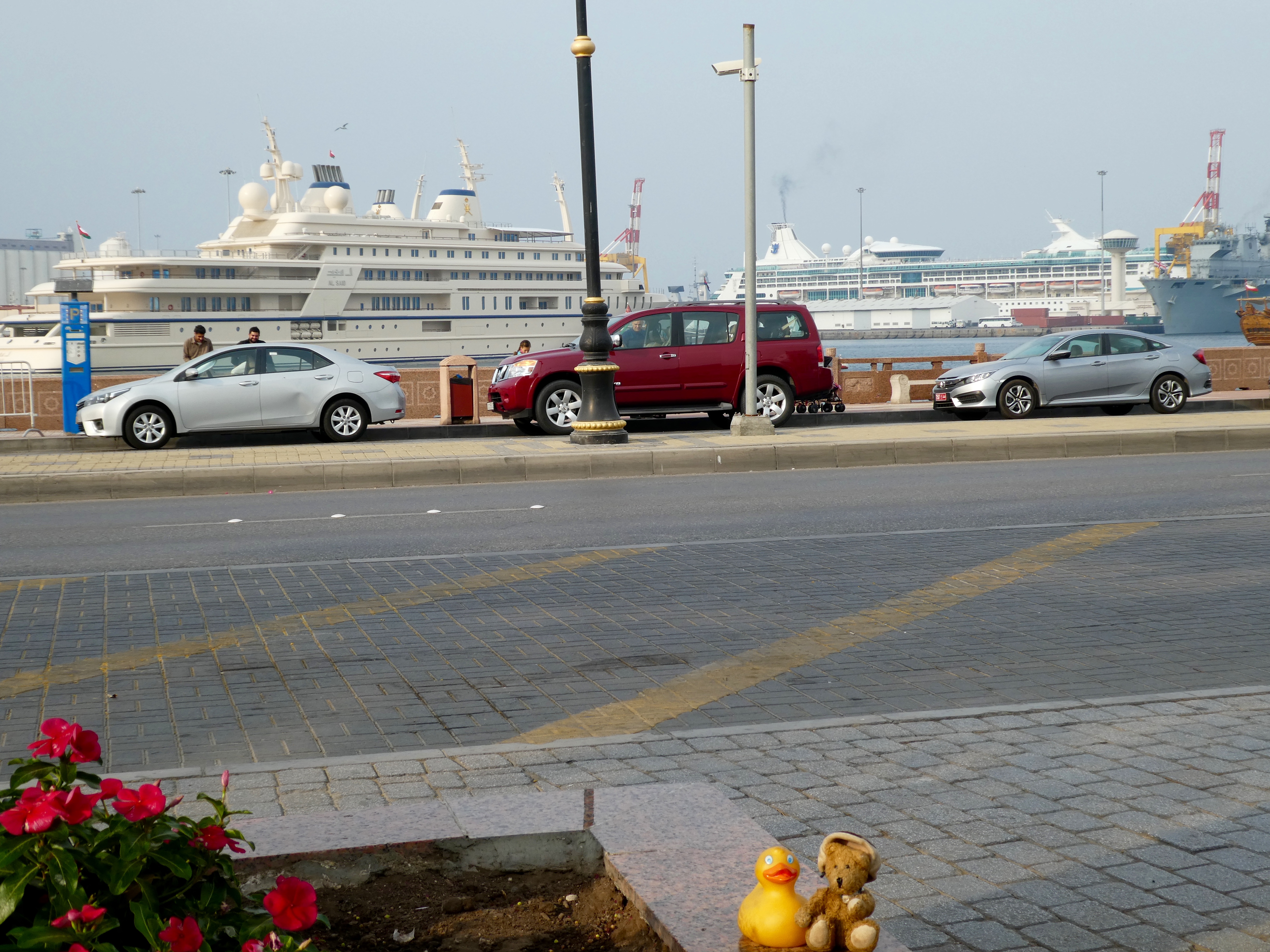 Cruise ships on the Arabian Sea near a great souk mean Zeb the Duck and Chanel the Bear are happy.