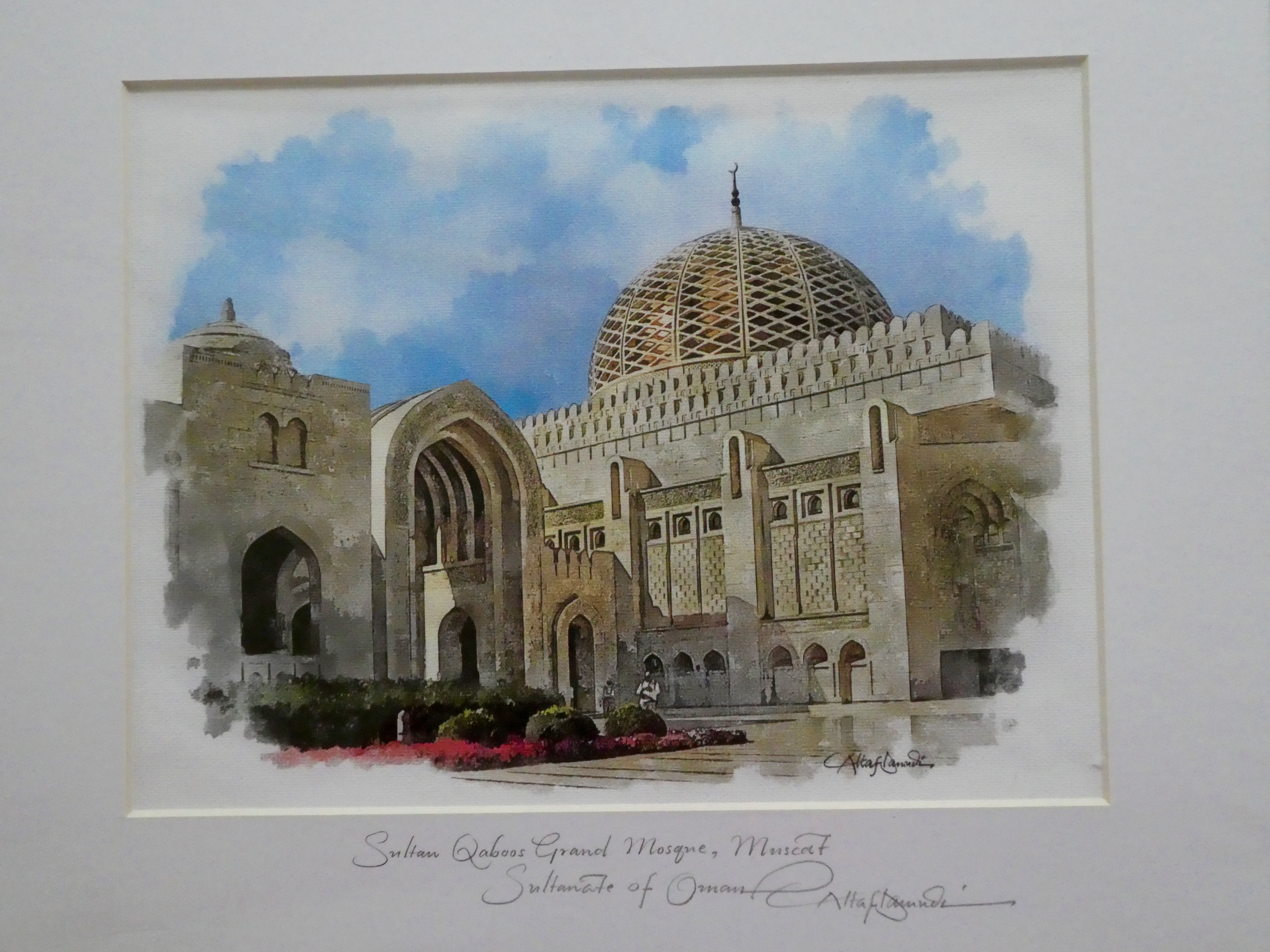The friendly gentleman showed them, and us, how to wear the head covering, or hat.   The shawls are a nice addition also, moms.   As we were about to enter the narrow alley of the souk, our moms saw post cards that they really needed.   Going further into the store, mom spotted this painting of Sultan Qaboos Grand Mosque.