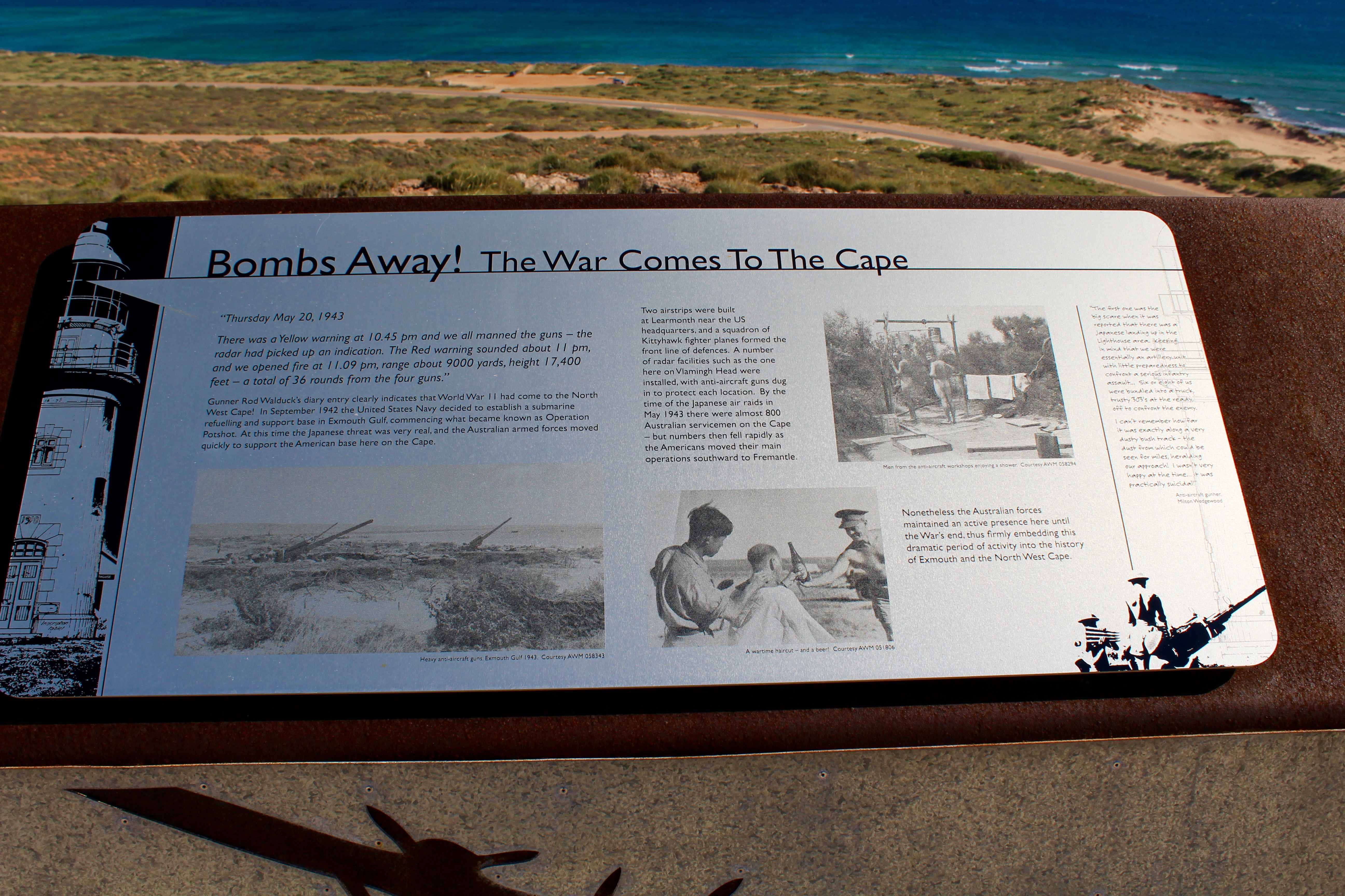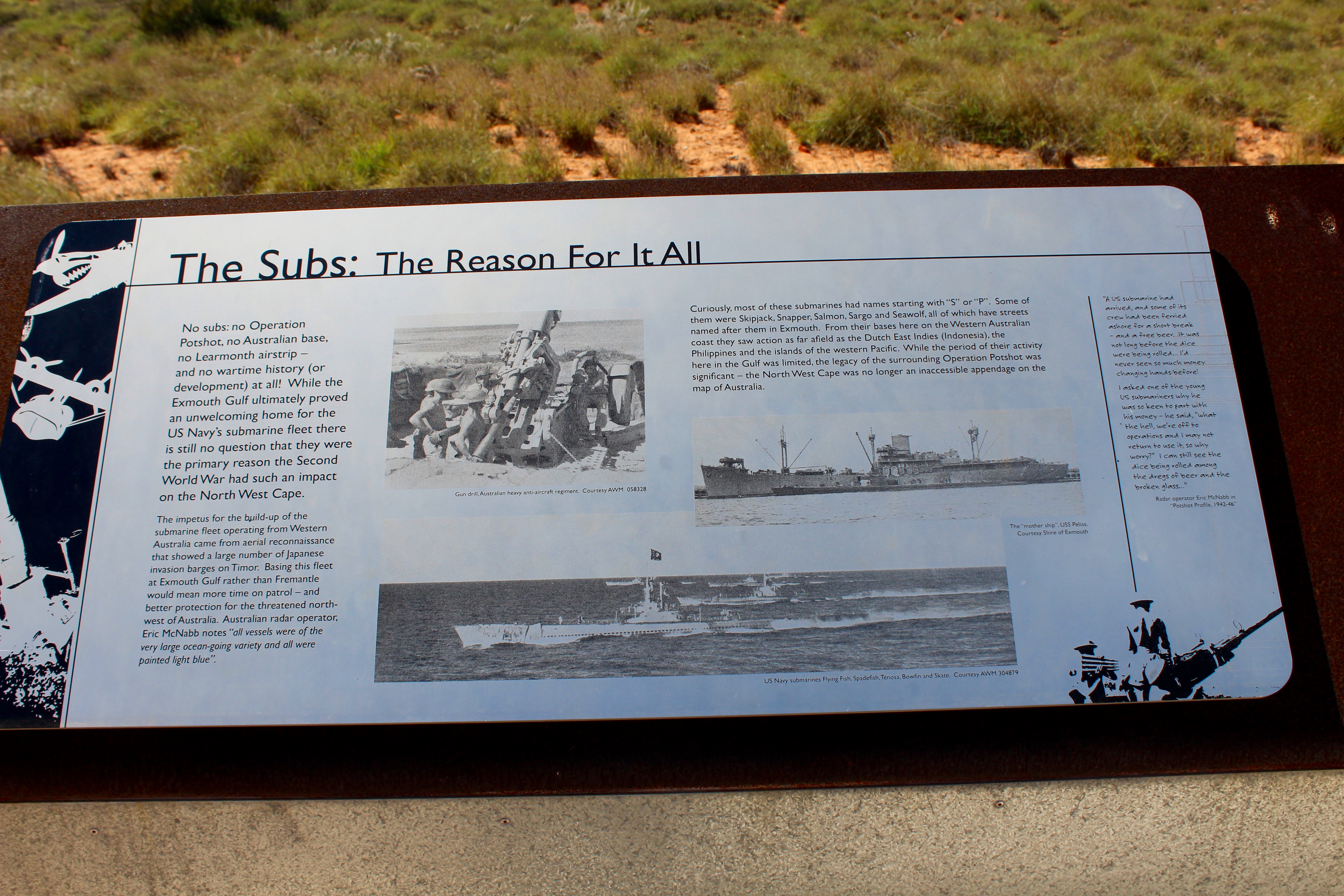 If you are in the area, visit Hutt River and learn about the establishment of this independent principality. Continuing north along the Indian Ocean, we learned of several joint projects between Australia and the United States during World War II. This is the monument to Operation Potshot, one of those cooperative missions.