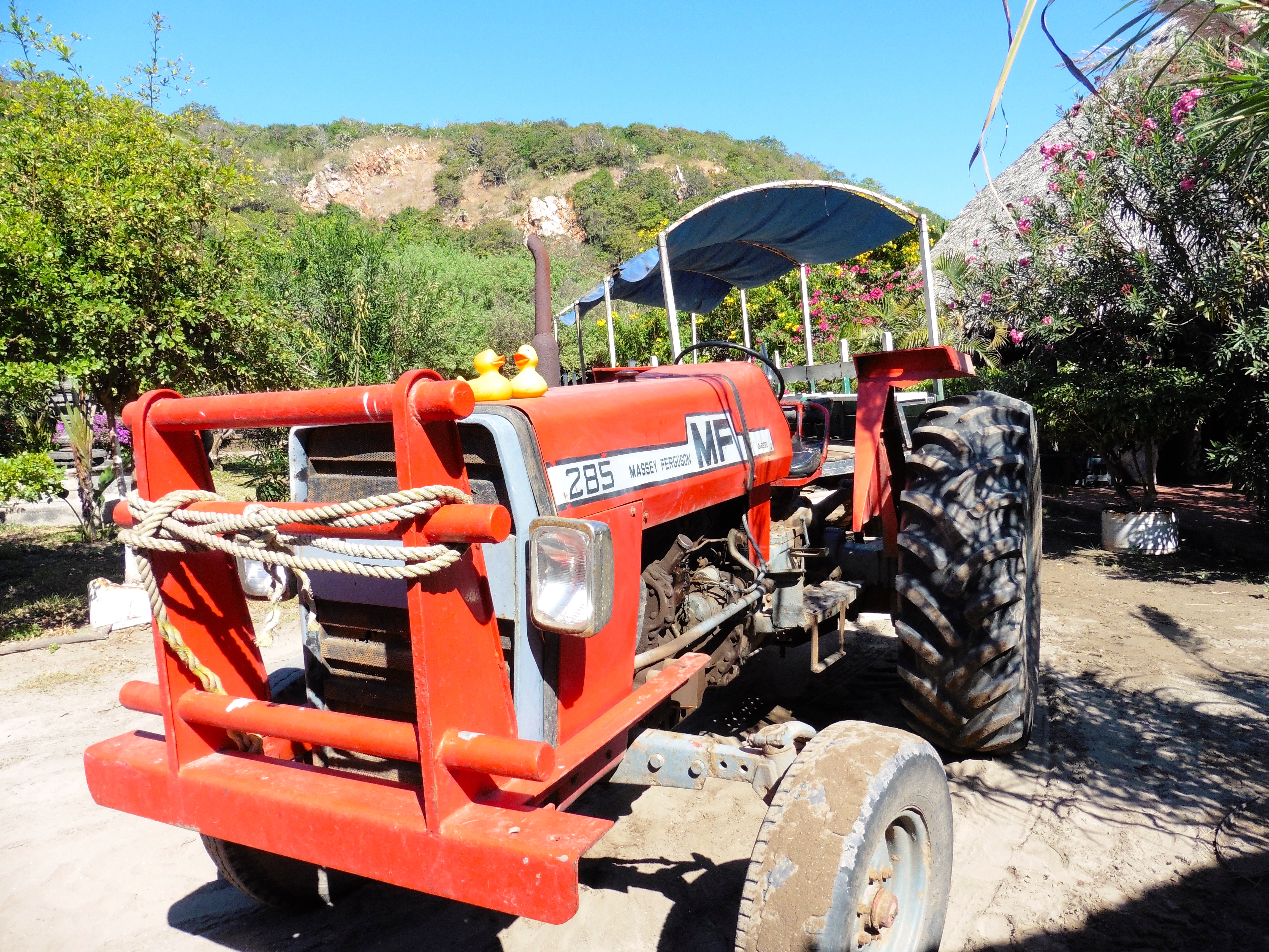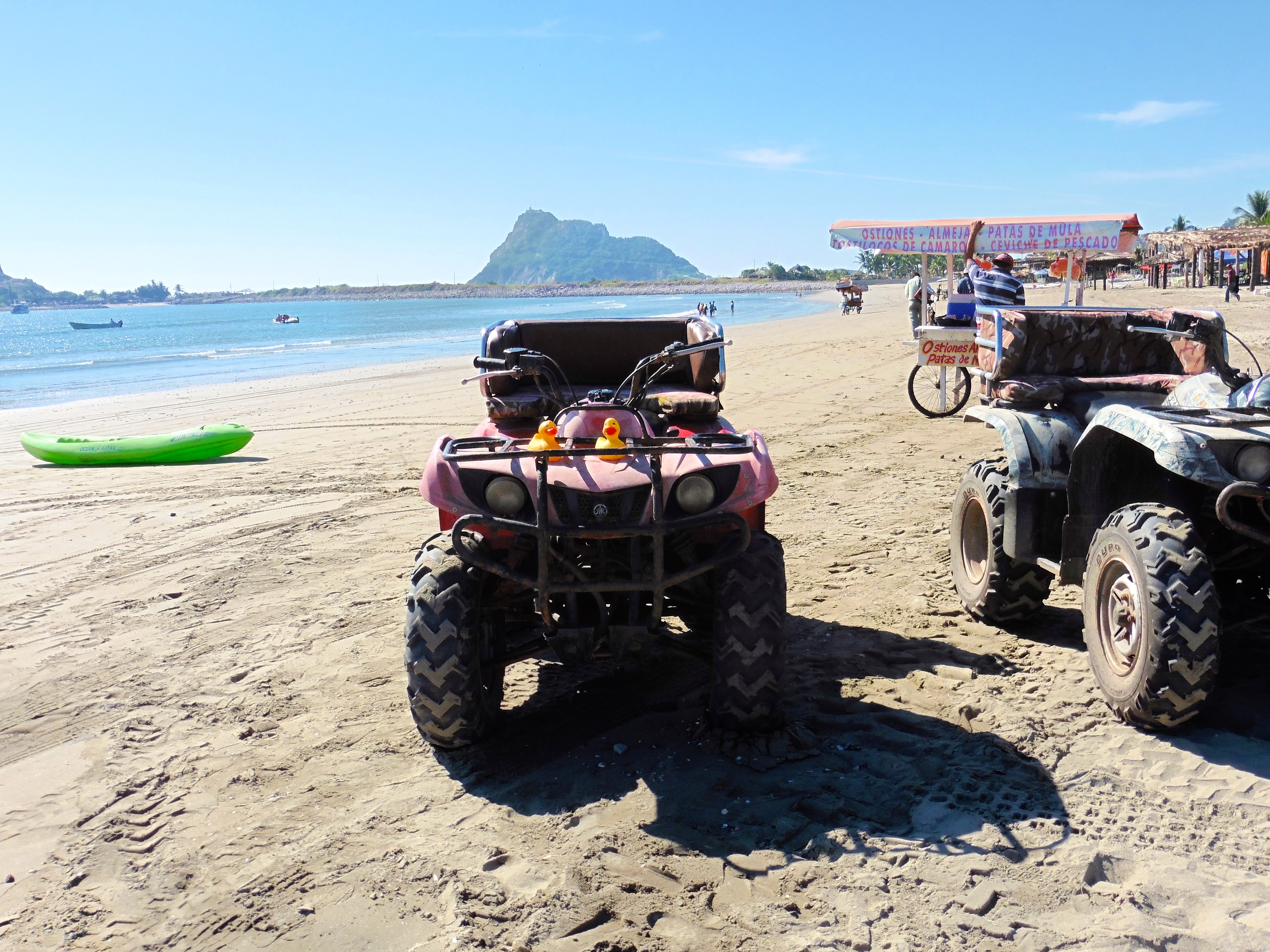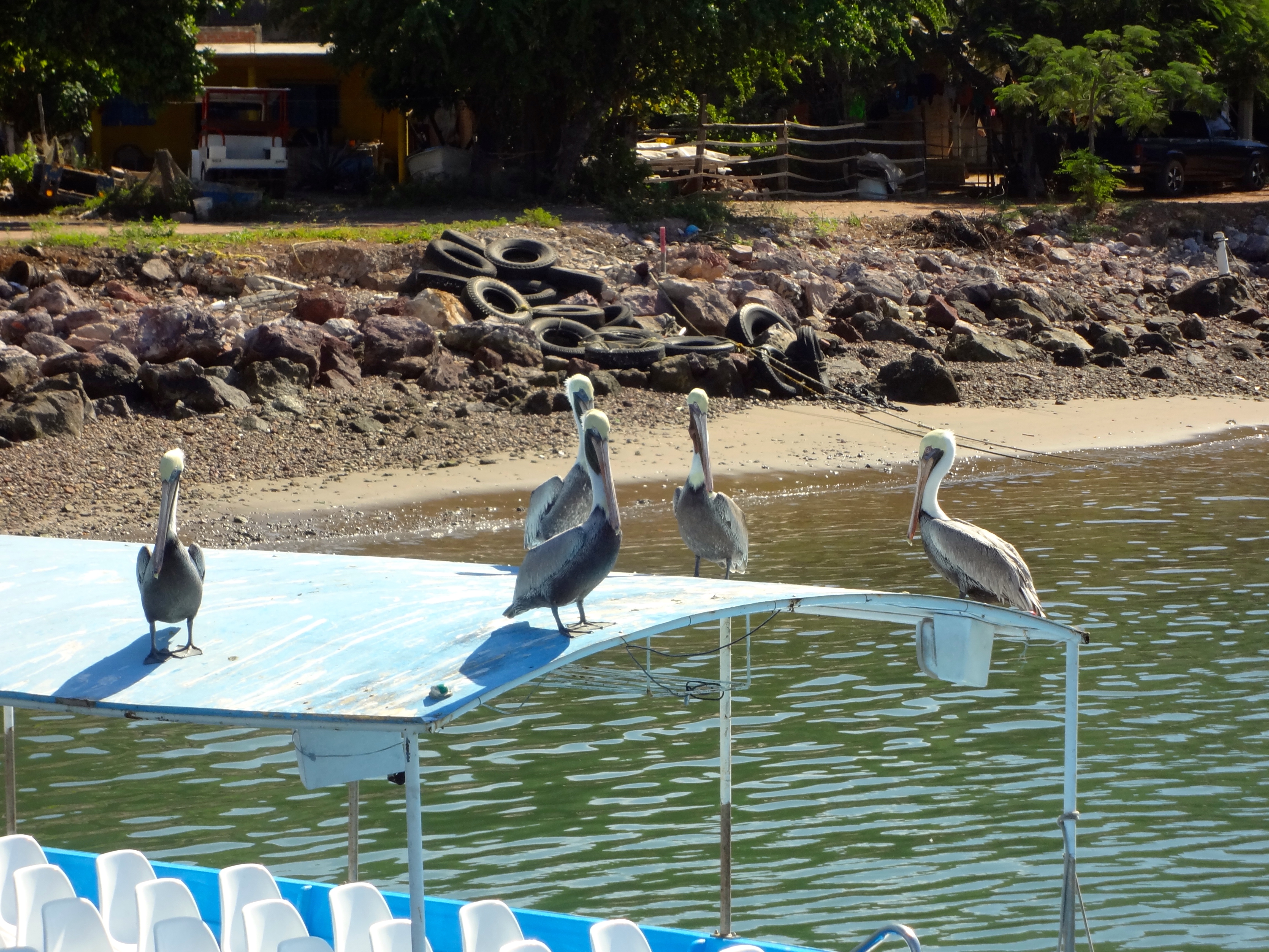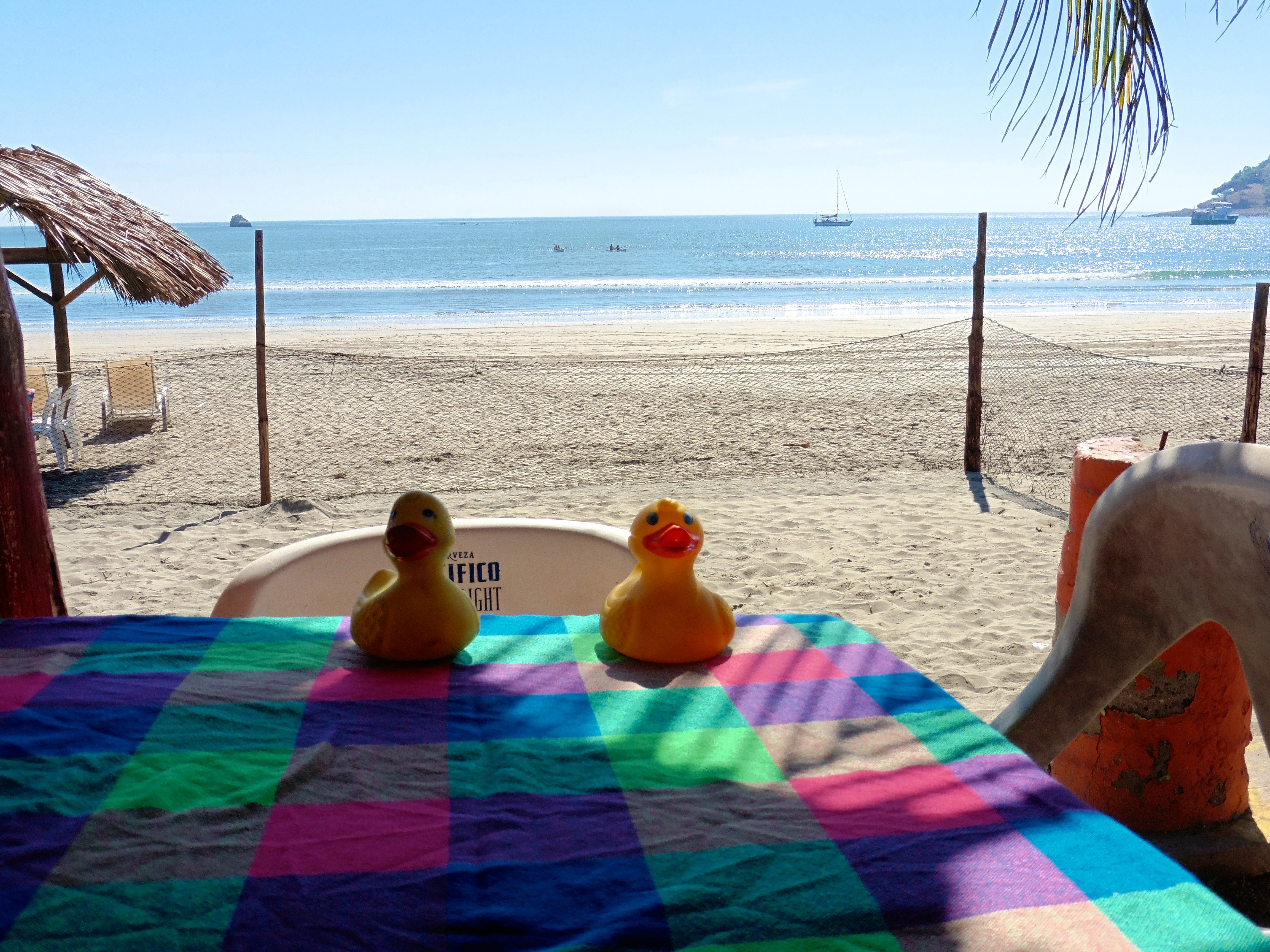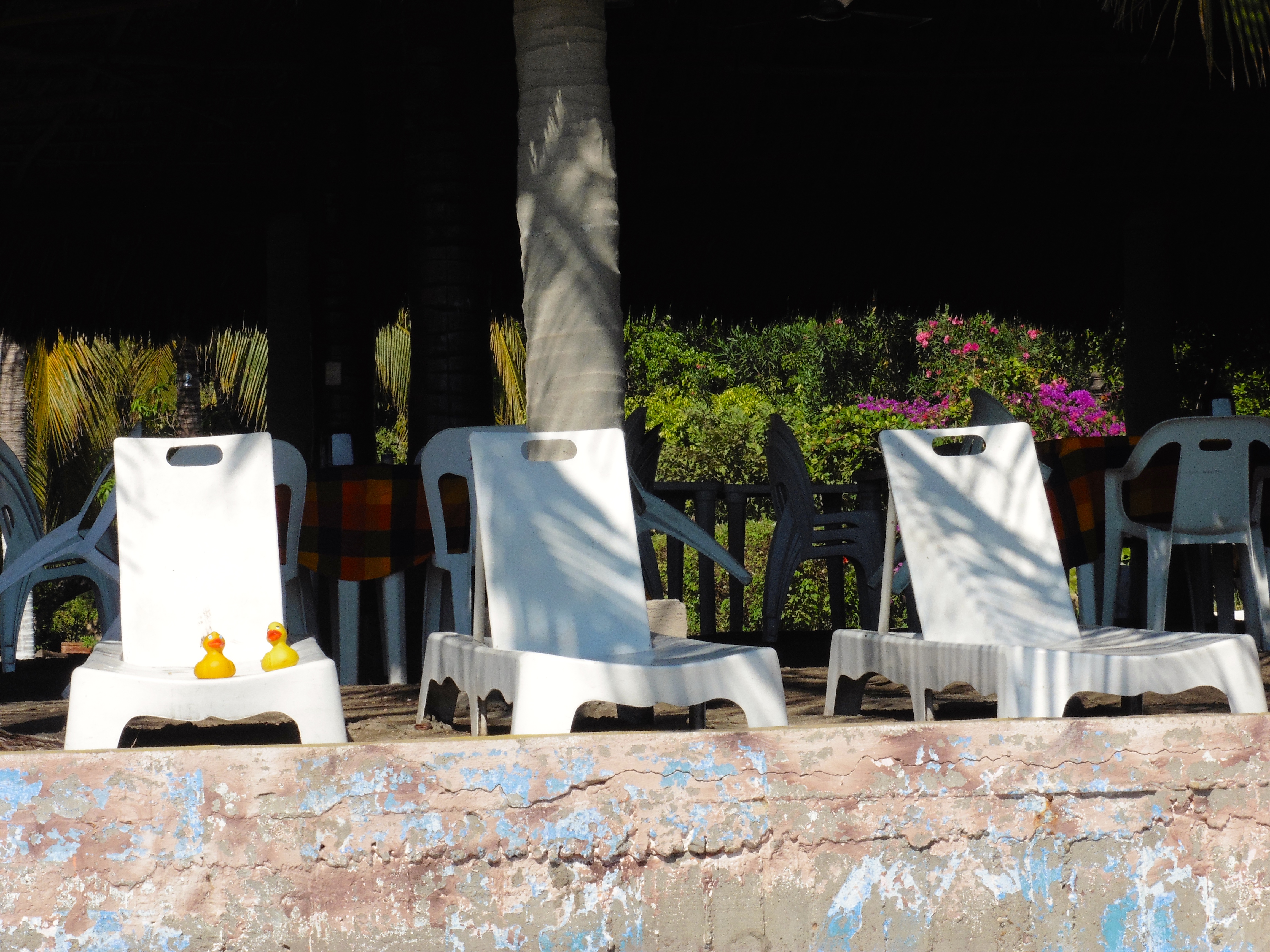 These picnic shelters on the beach protect humans, and small ducks, from the intense tropical sun of the summer. Even now, during winter in the Southern Hemisphere, the sun is intense. Too soon it is time for us to get in the resort truck, drive down the sandy roads and get on the ferry.