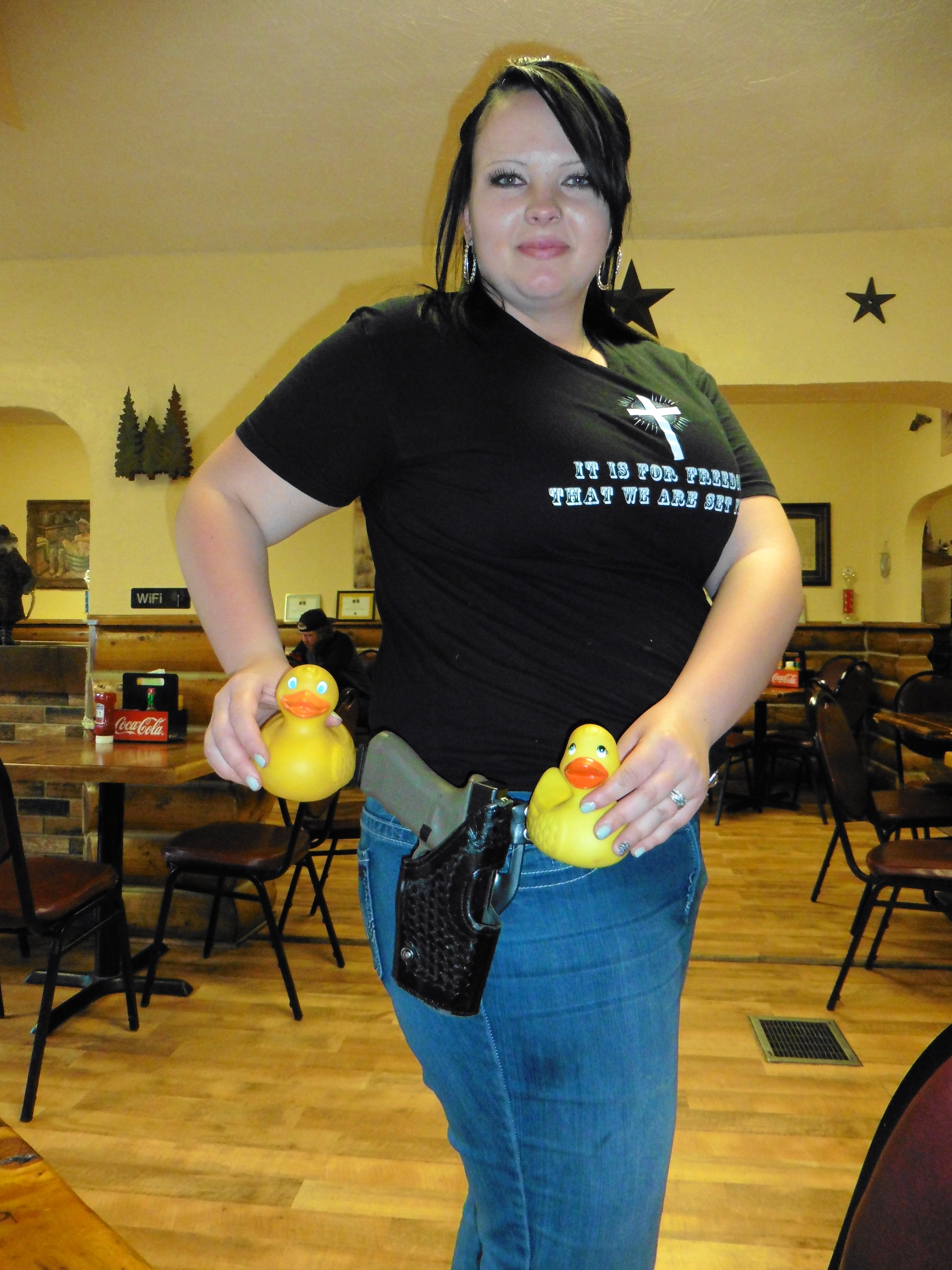 At Shooters Grill the waitresses are encouraged to wear a pistol, usually a Glock, in a holster on their hip. All are trained and licensed to carry a weapon. Also classes in gun safety are regularly scheduled here. All are welcome and learning how to use a gun properly and safely is very important. No alcohol is served at Shooters Grill. But delicious food is served. Chanel the Bear is sitting on Charlotte’s gun.