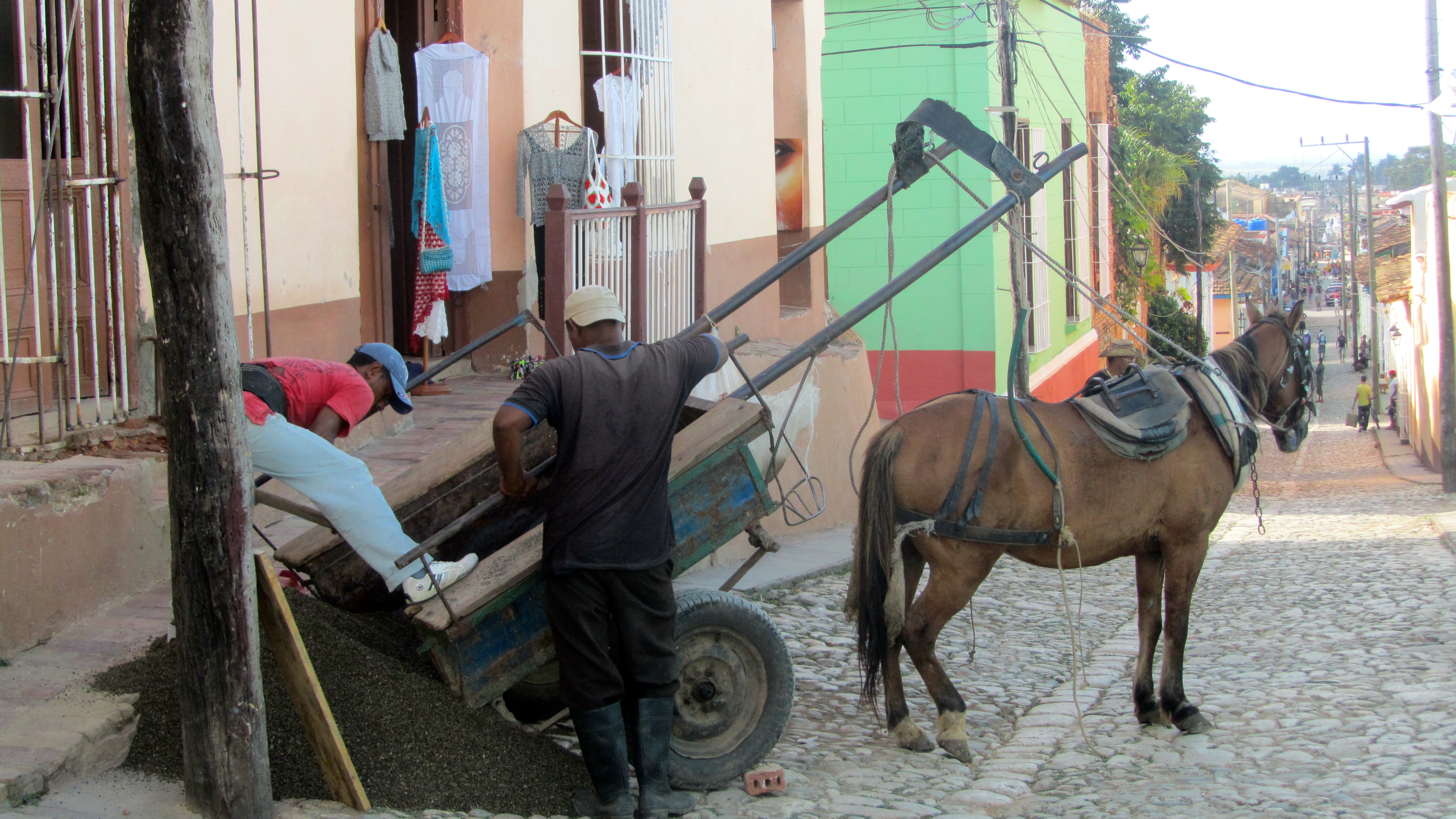 In the streets we saw many horses, some of them with carts. This horse was working with the men to repair the road.