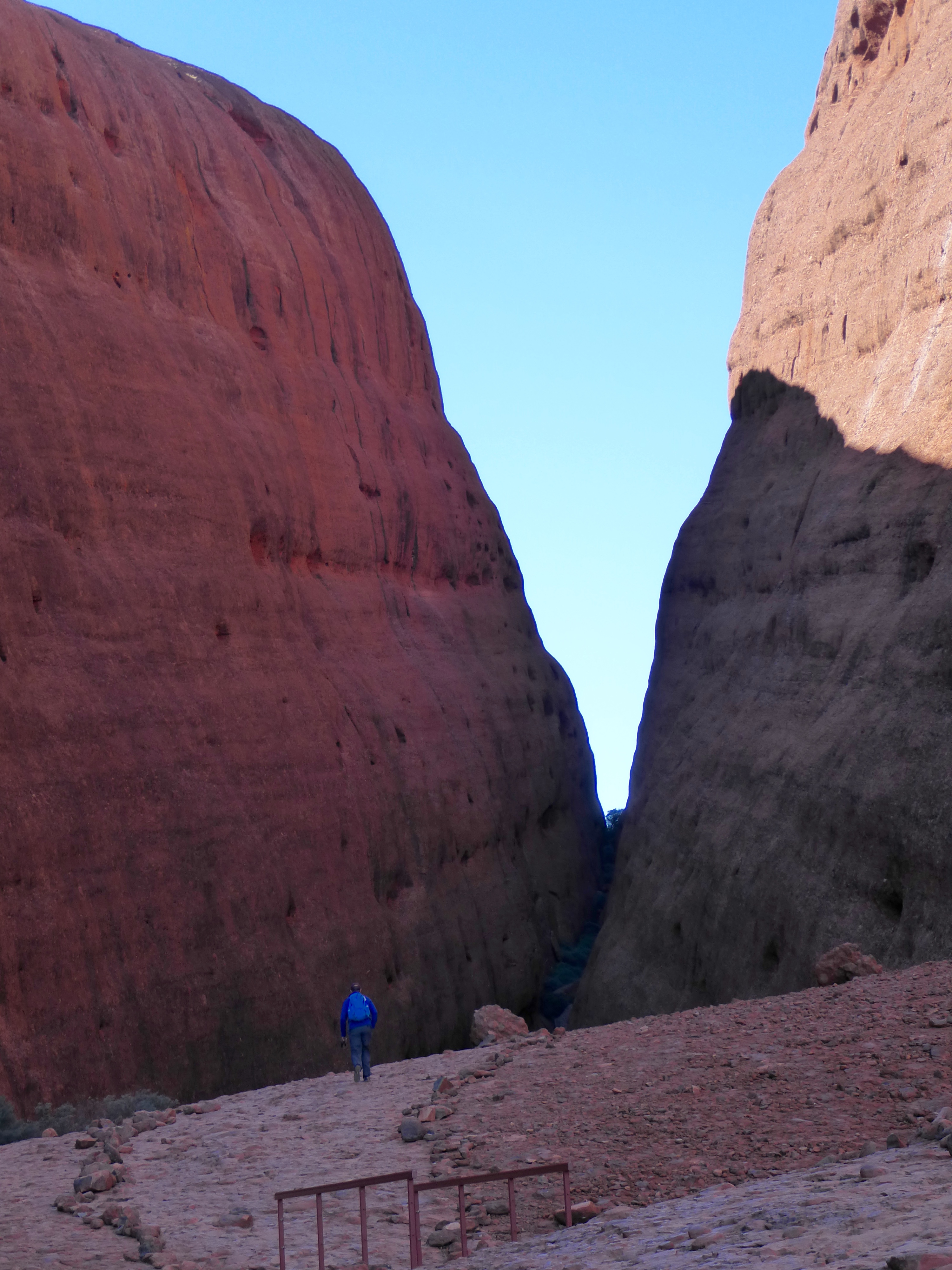 Scientists believe Kata Tjuta was part of a giant monolith about 10 times the size of Uluru.   Kata Tjuta has fewer visitors than Uluru and there are no facilities or water available.    Also, no climbing on the rocks is permitted   There are several hikes around the rocks, but visitors must stay on the trails.    The winds were pretty strong when we were there.    This is the trail to the Olga Gorge.