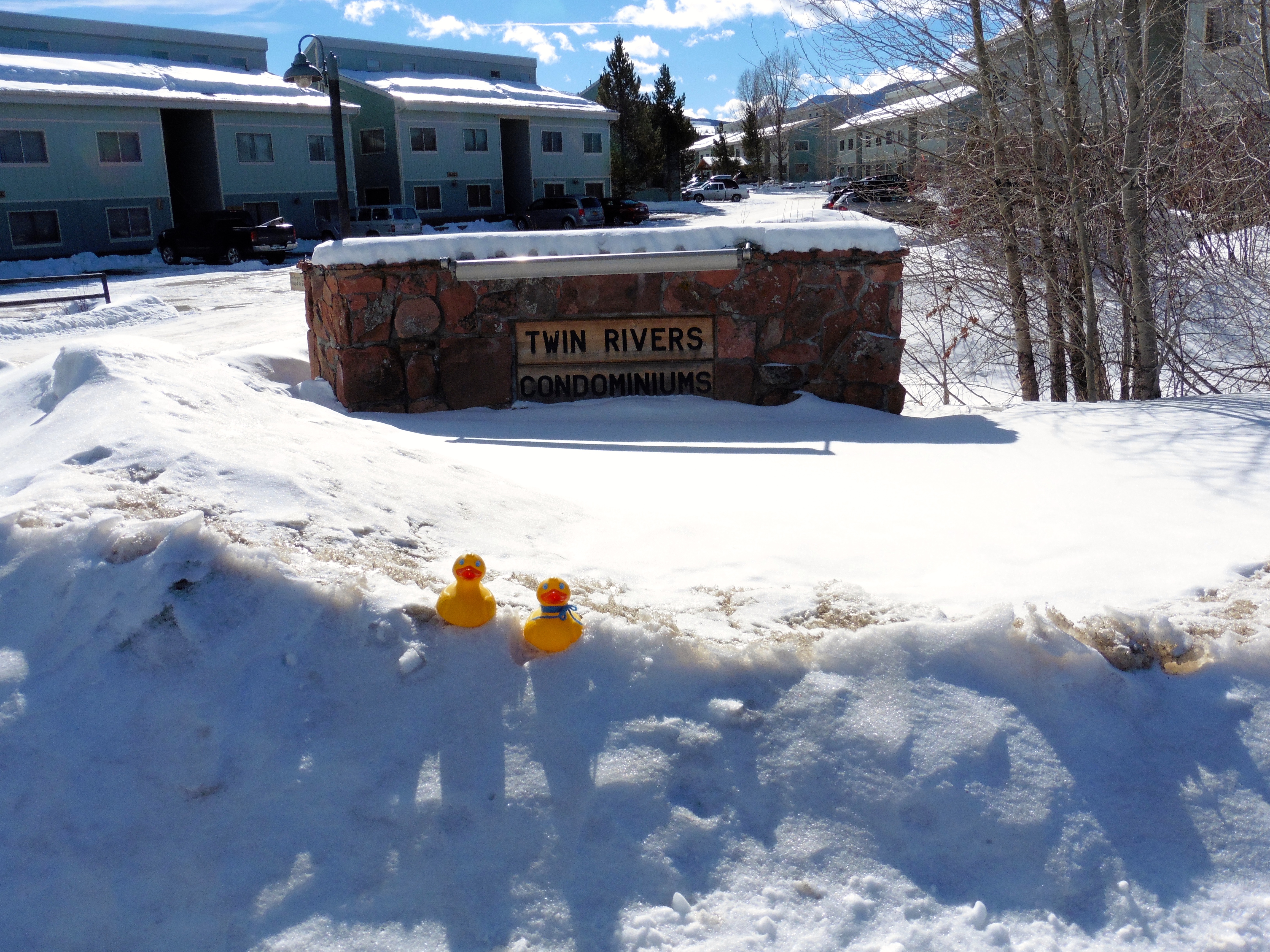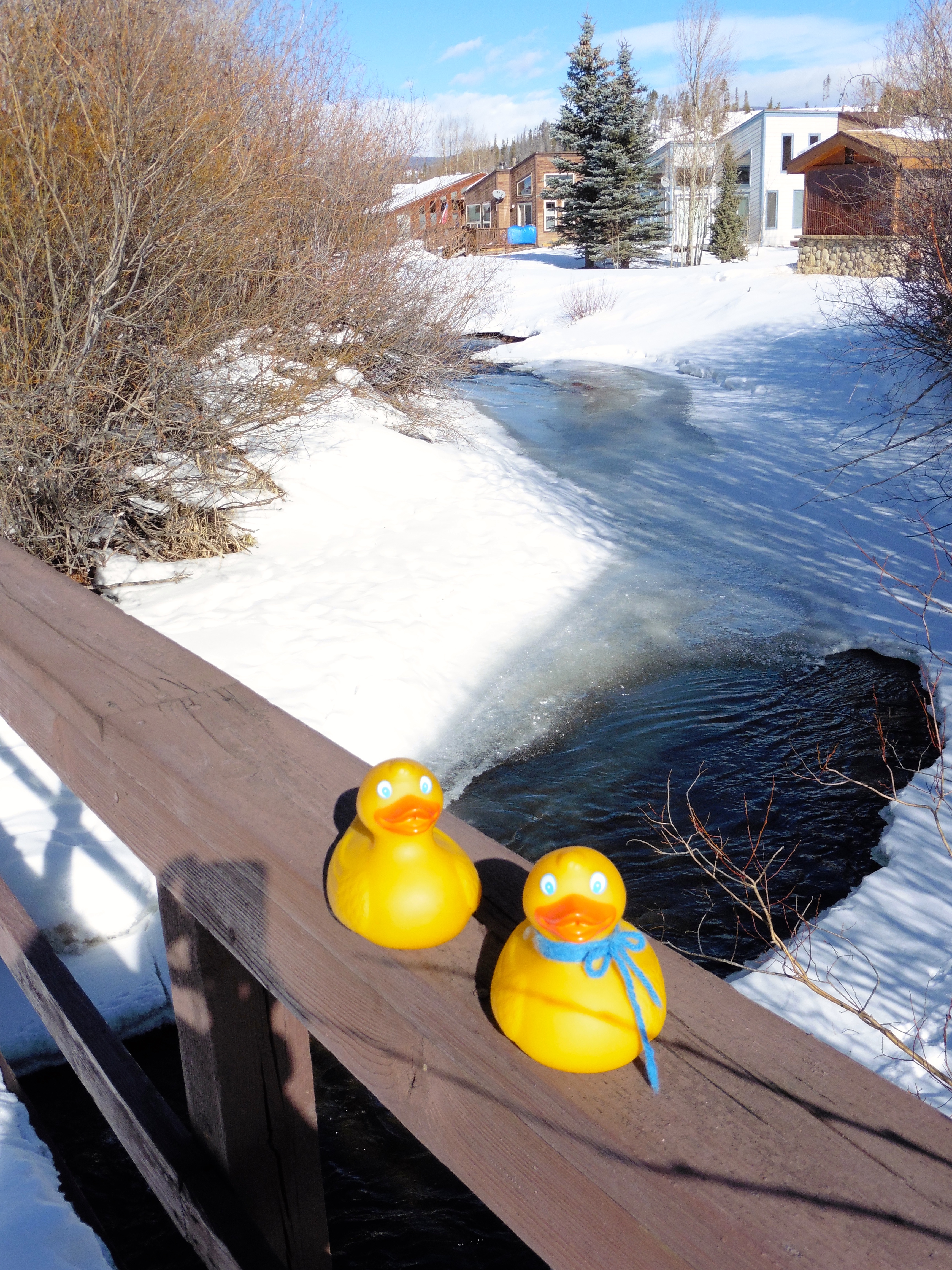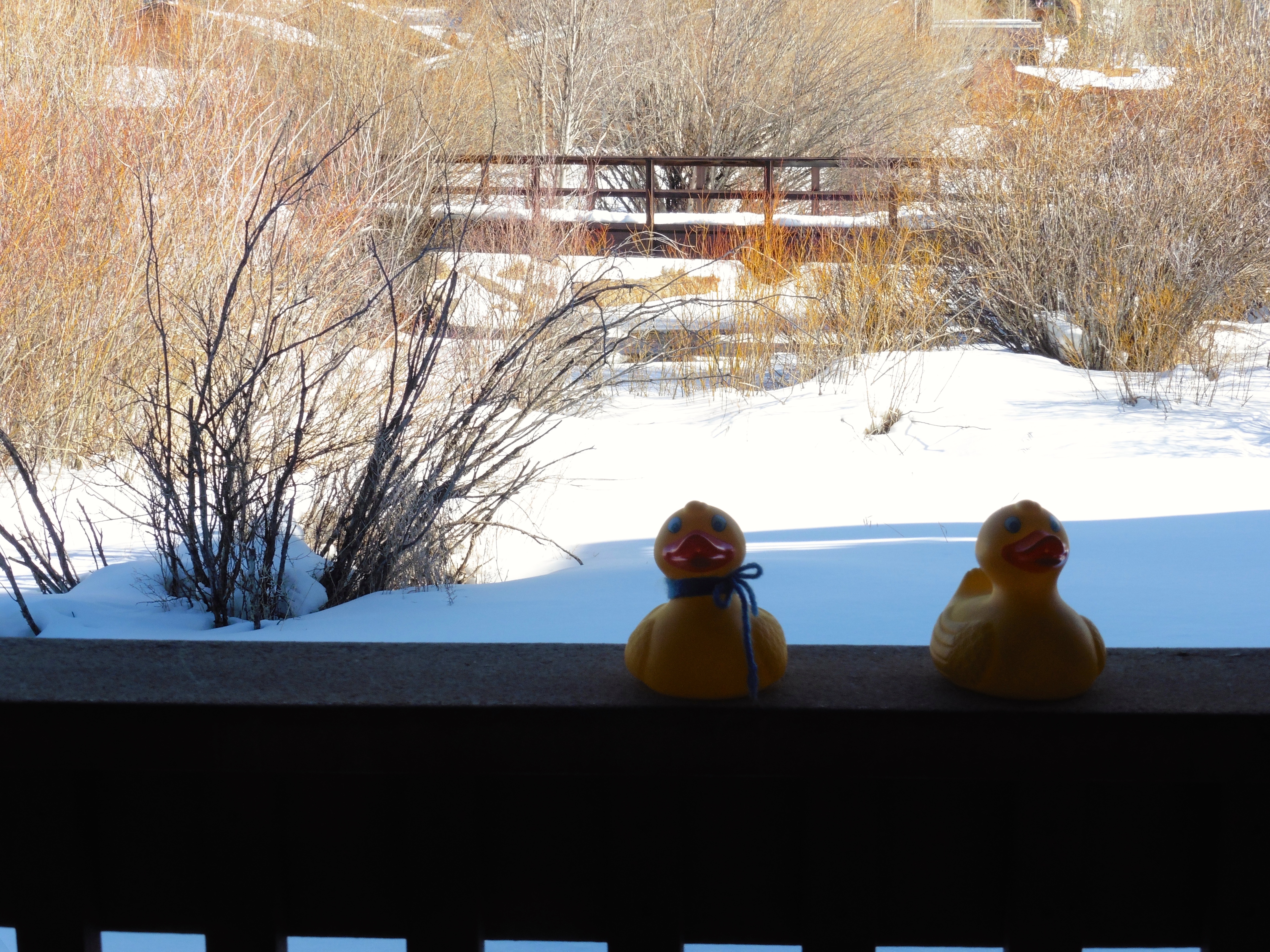 A cold, snowy day in Denver. We ducks are enjoying this weather and we like the almost frozen lake behind us.